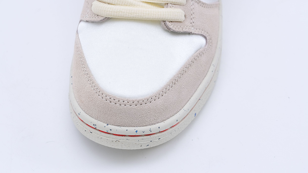 The upper of the Dunk Low Premium SB ‘Light Bone’ is crafted from premium leather and suede in a light bone color, providing a clean and sophisticated look. This neutral base is complemented by subtle accents in deeper tones found on the Swoosh, outsole, and lacing, which add depth and contrast without overpowering the shoe’s overall minimalistic design.
