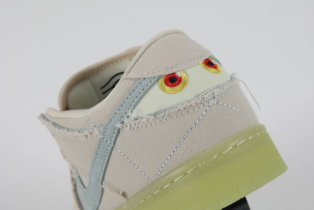 The Dunk Low SB ‘Mummy’ sneaker is a creative masterpiece, inspired by the ancient world of mummies and the mysteries of the afterlife. This unique edition stands out for its imaginative design, featuring a textured, off-white canvas that mimics the appearance of mummy wrappings, giving it an intriguing and distinctive look. The sneaker’s glow-in-the-dark details and the turquoise accents, reminiscent of traditional Egyptian jewelry, add to its mystique and allure, making it a must-have for sneaker enthusiasts and collectors.