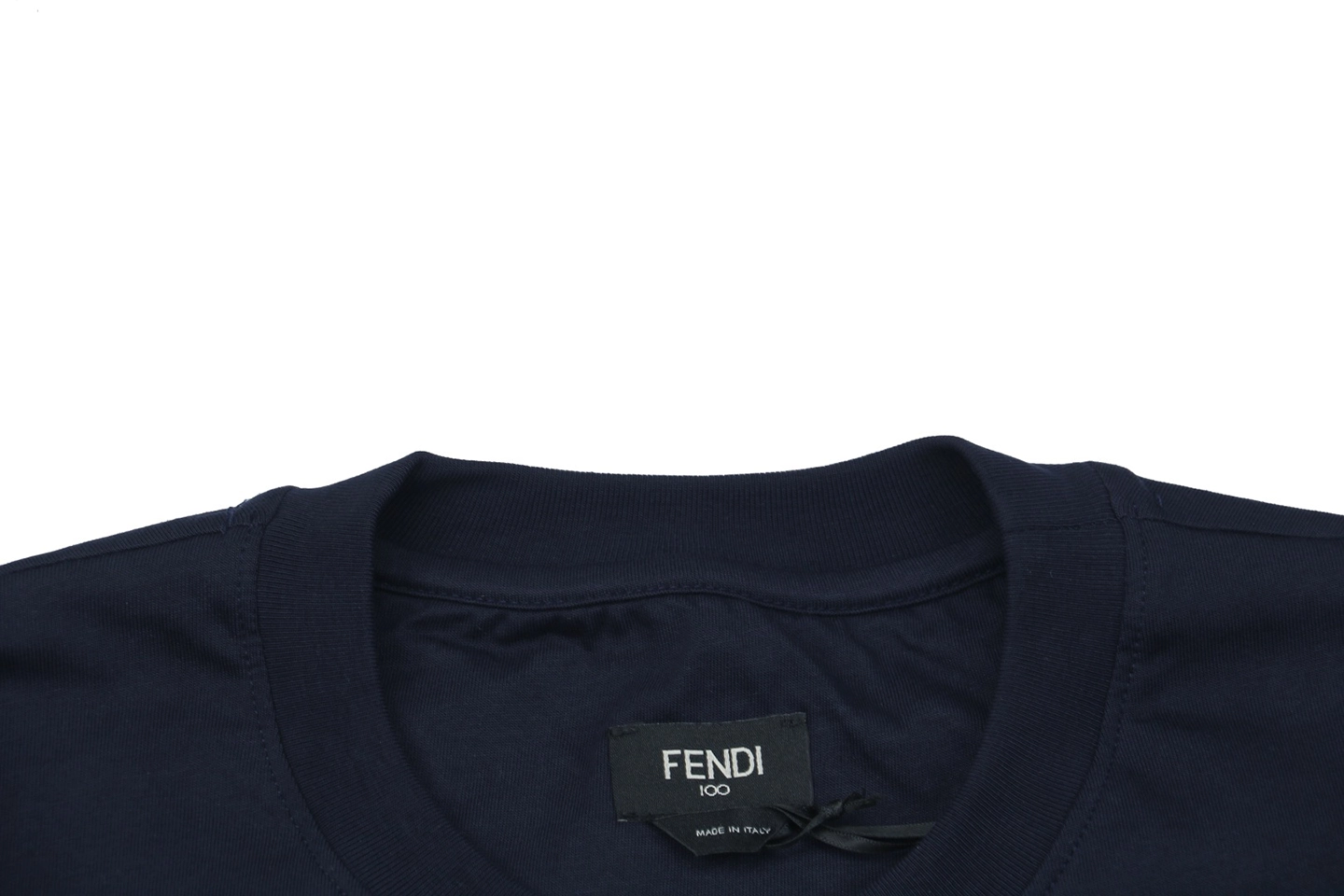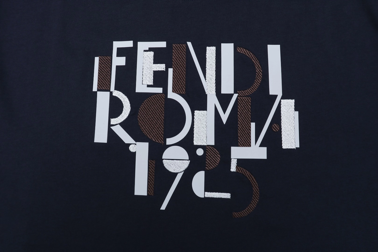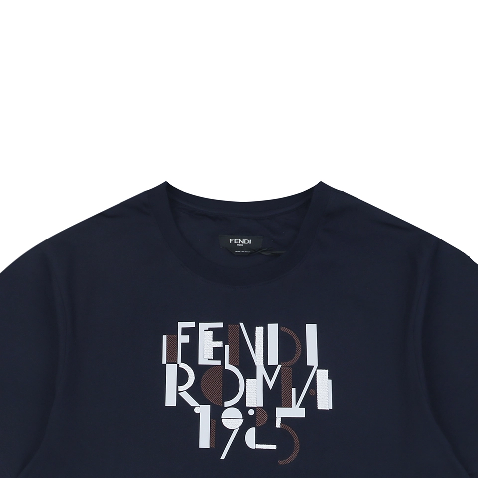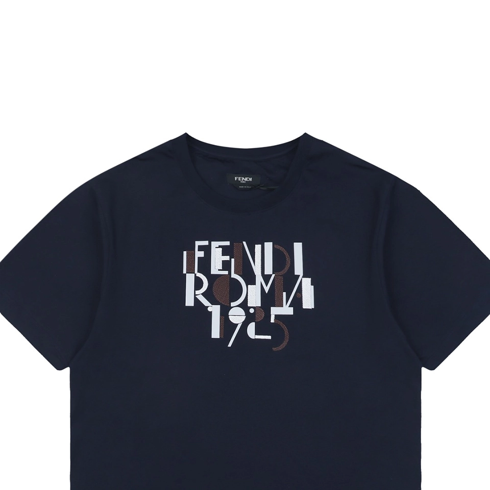 The F 100th Anniversary Letter Print T-shirt pays homage to a century of Italian elegance with a modern graphic twist. Crafted from soft, breathable cotton, this navy tee features a distinctive abstract typography print reading “FENDI ROMA 1925” in layered tones of white, brown, and grey. The minimal silhouette and clean crew neck design make it versatile for casual or smart-casual outfits, while the premium fabric ensures comfort and durability.