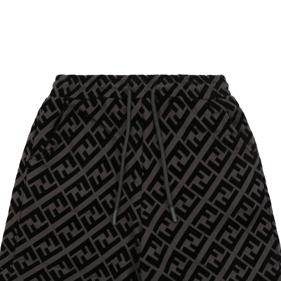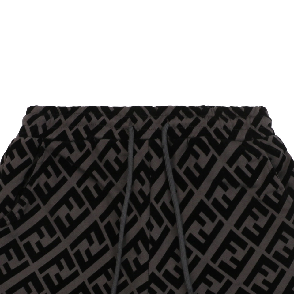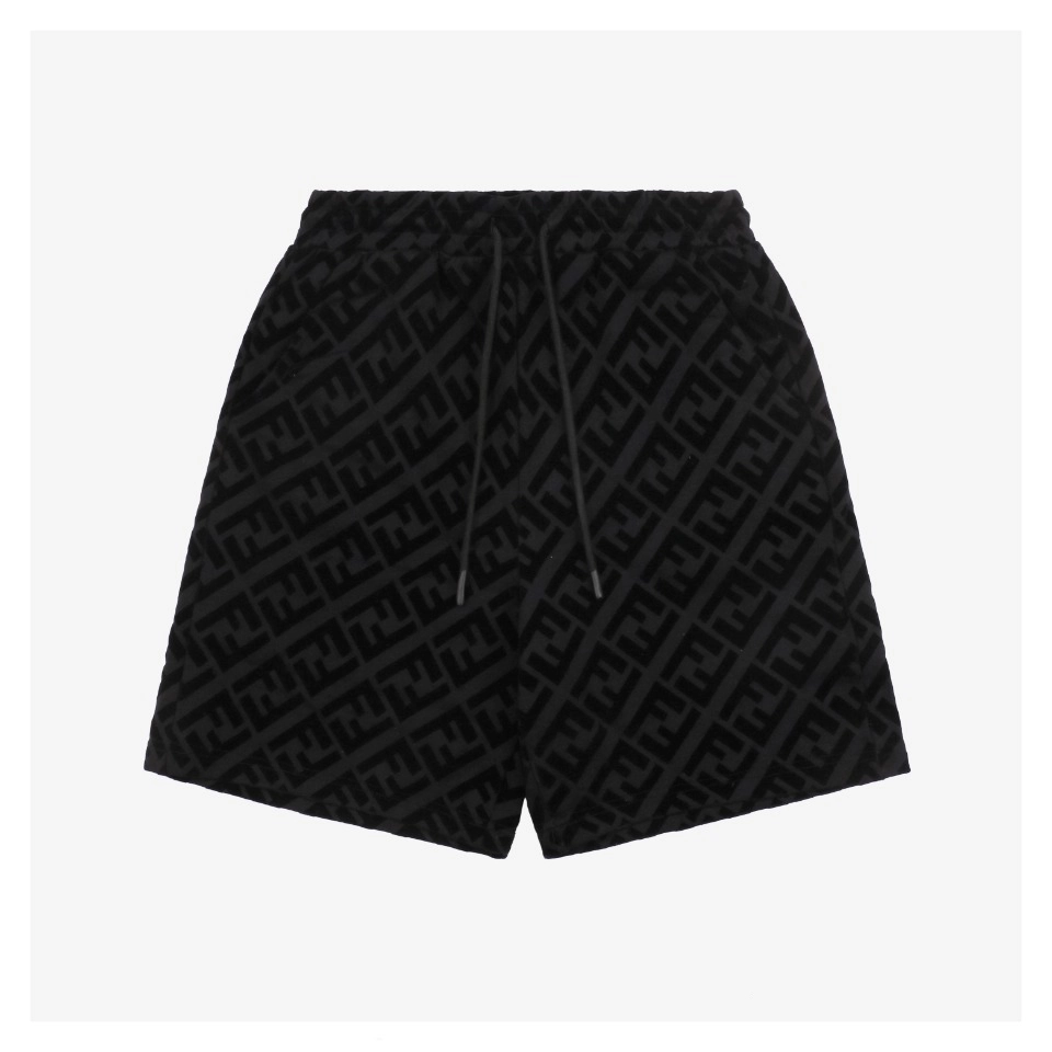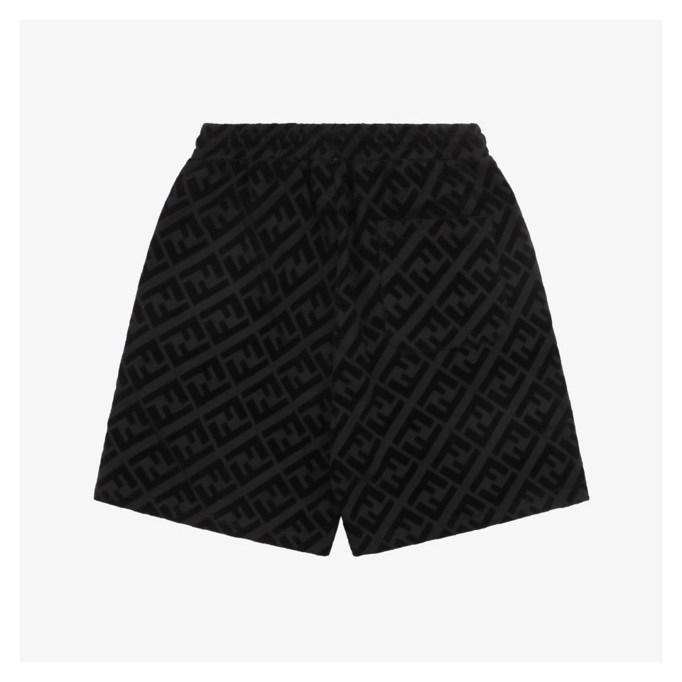 The F Monogram Velvet Logo Pattern Shorts feature an all-over diagonal FF motif in a plush flocked finish, creating a bold yet refined statement. Crafted from soft, breathable cotton blend, these shorts include an elastic waistband with adjustable drawstrings for a customized fit, side pockets for everyday convenience, and a back patch pocket for added utility. The textured velvet effect brings depth and tactile richness, making them a versatile option for casual styling or upscale streetwear looks.