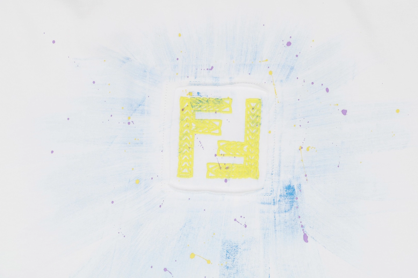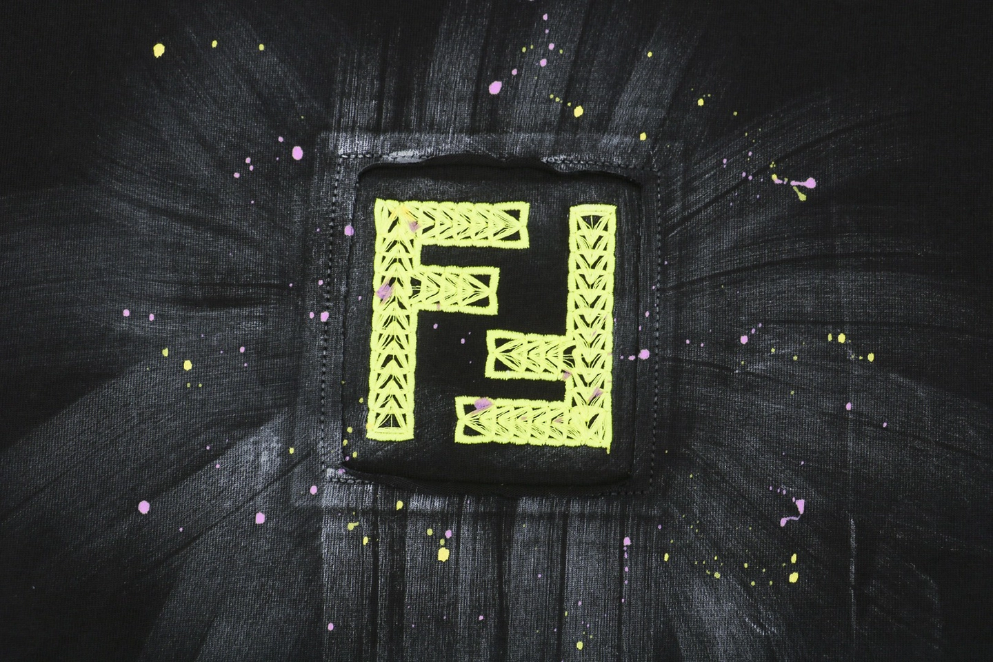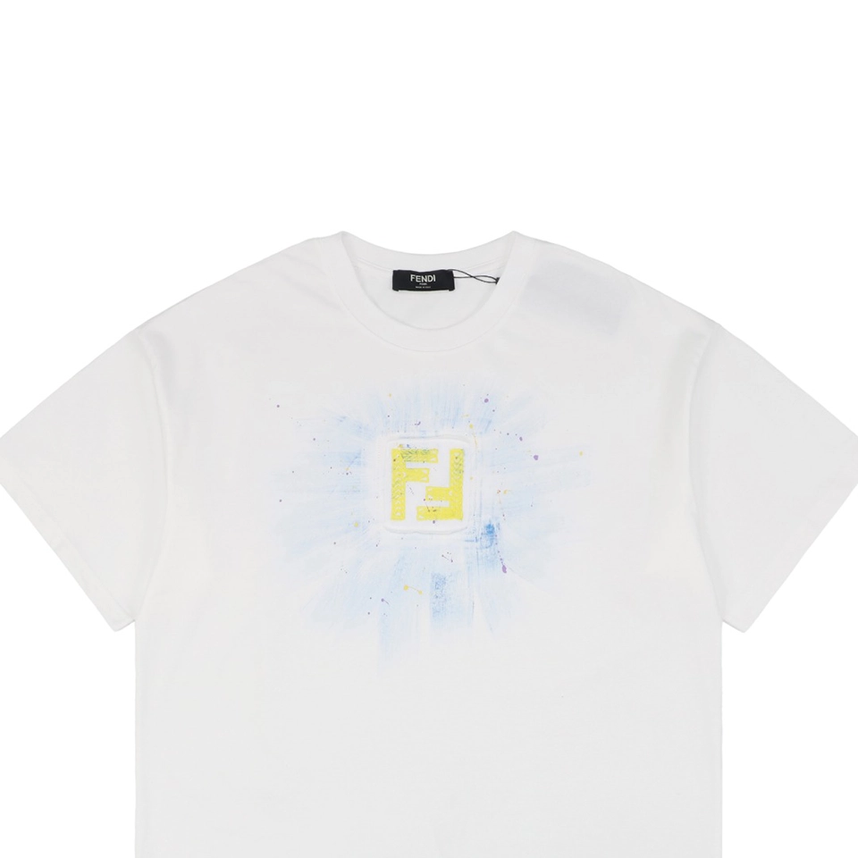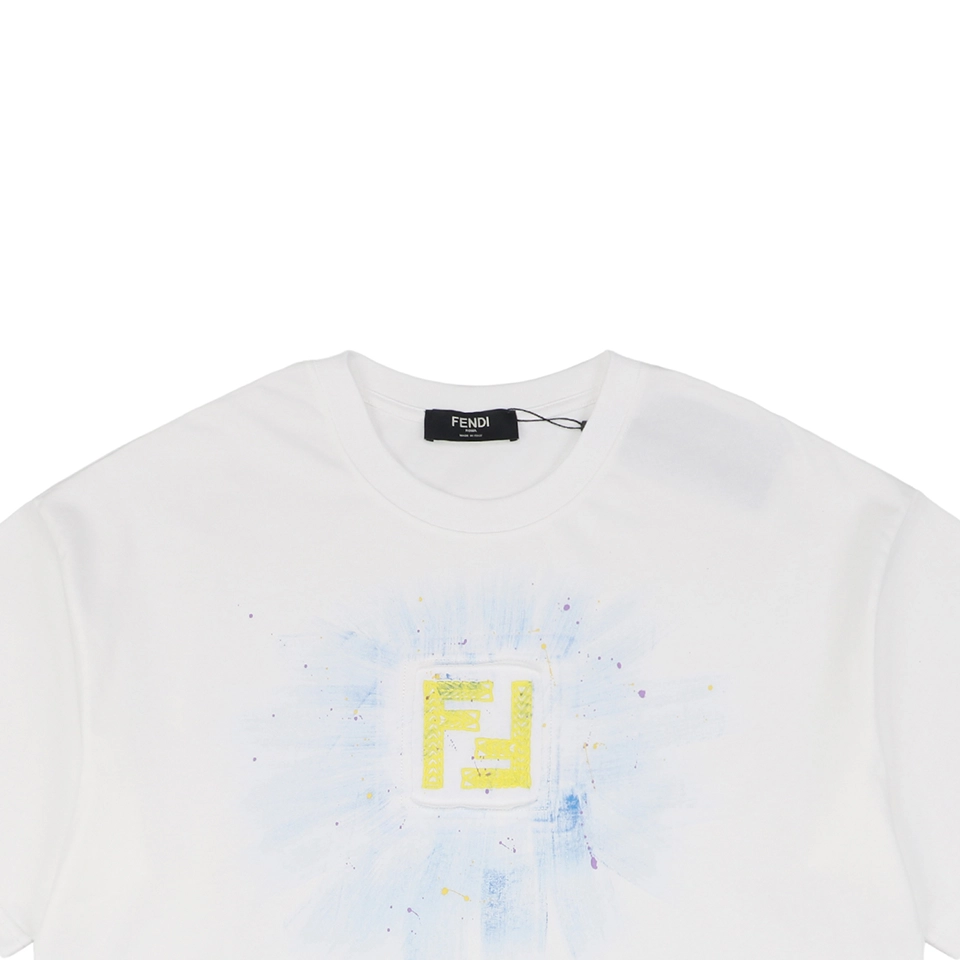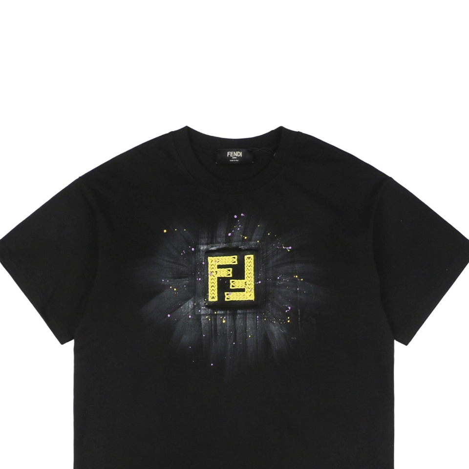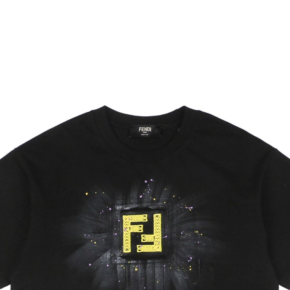 The F Radiant Ink Splash Embroidered T-shirt showcases a striking yellow embroidered F logo at the chest, accentuated by a hand-painted radiant ink splash effect. Crafted from premium cotton, this black tee offers a soft touch and relaxed fit, merging contemporary luxury with urban art influences.