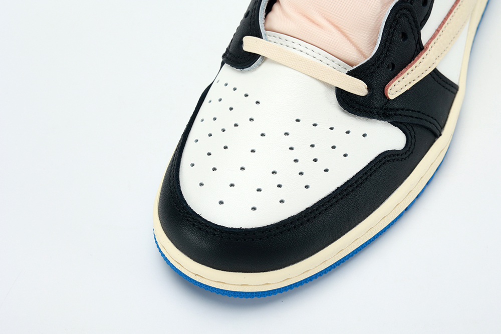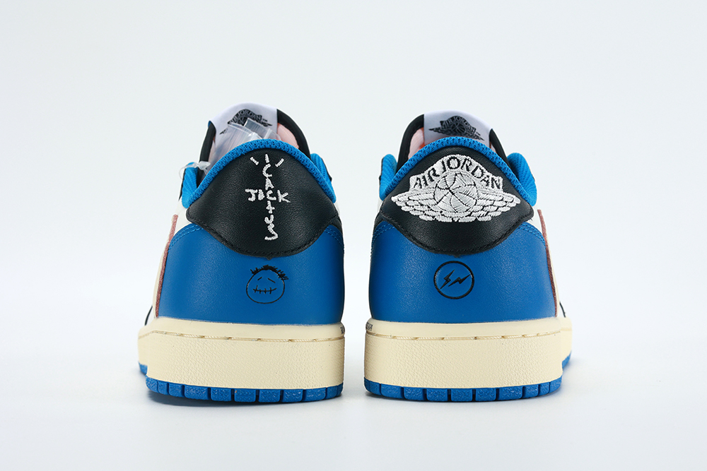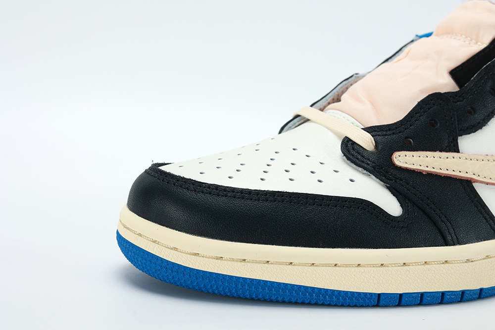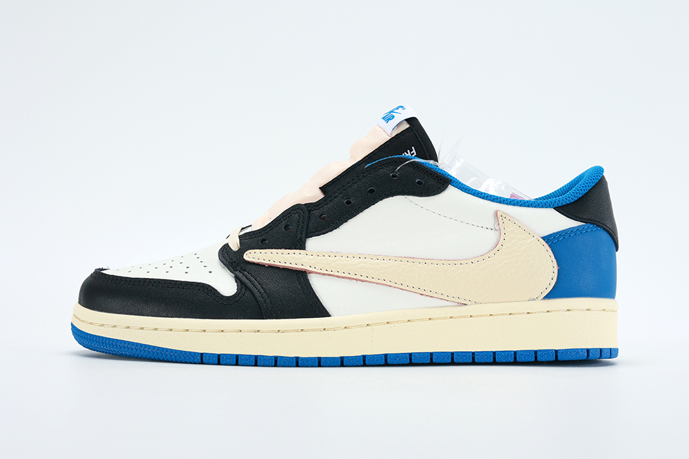 The Fragment Design x Travis Scott x Air Jordan 1 Retro Low is a monumental collaboration that marries the visionary talents of Hiroshi Fujiwara, Travis Scott, and the legendary Jordan Brand. This sneaker represents a pinnacle of streetwear culture, showcasing an exquisite blend of Fragment Design’s minimalist aesthetics with Scott’s bold, unconventional approach, all while staying true to the Air Jordan 1 iconic silhouette. The design features a striking color scheme of black, white, and royal blue, with each color thoughtfully placed to highlight the sneaker’s intricate details and premium craftsmanship.