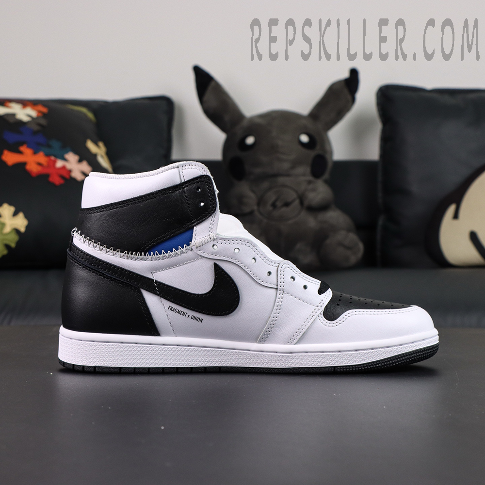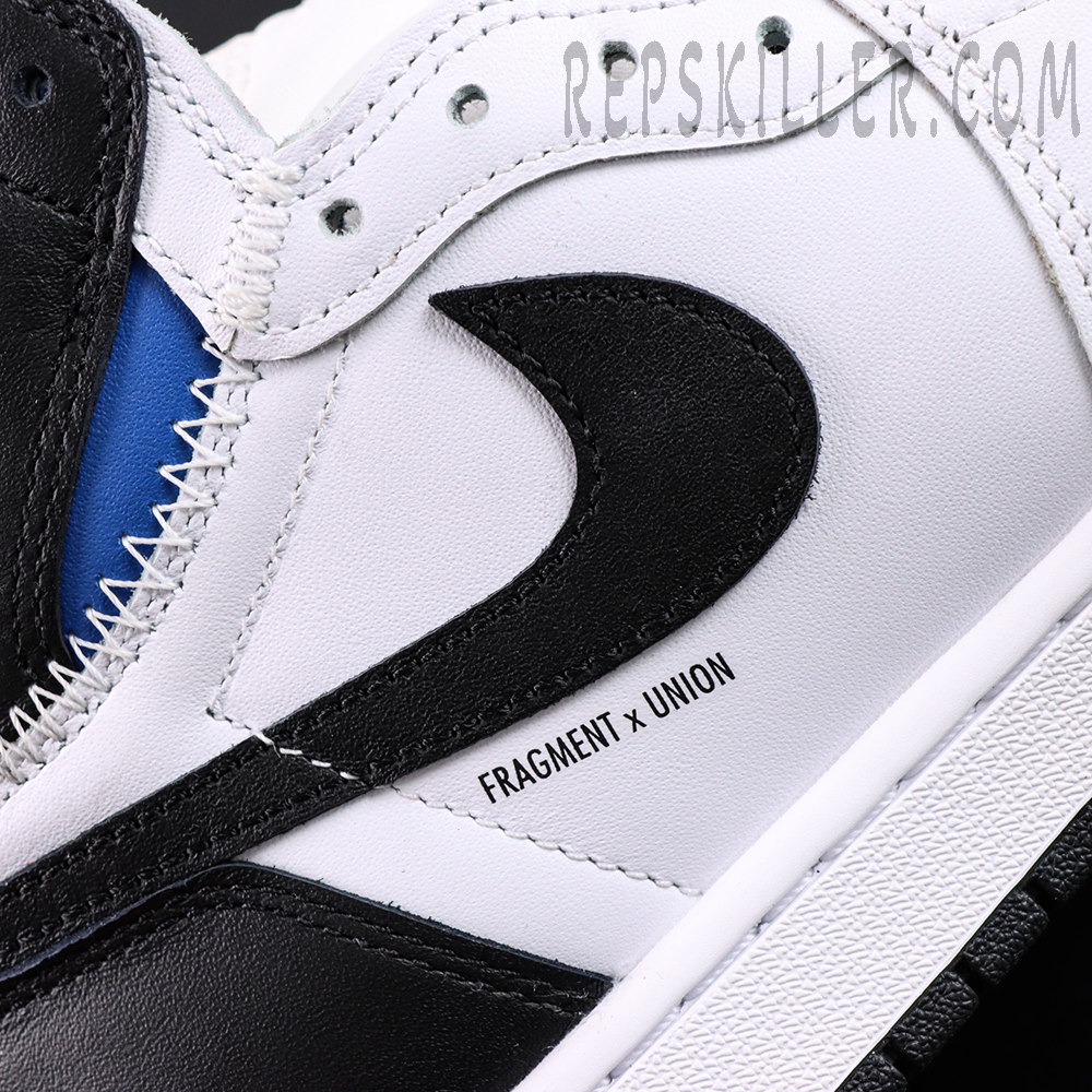 The upper features a premium white leather base contrasted by black leather overlays on the Swoosh, heel, and toe box. Union LA’s signature exposed stitching and layered construction give the shoe a deconstructed, archival feel, while Fragment Design branding adds understated exclusivity. Subtle co-branding elements appear throughout, reinforcing the collaborative identity without overwhelming the classic Jordan 1 silhouette.