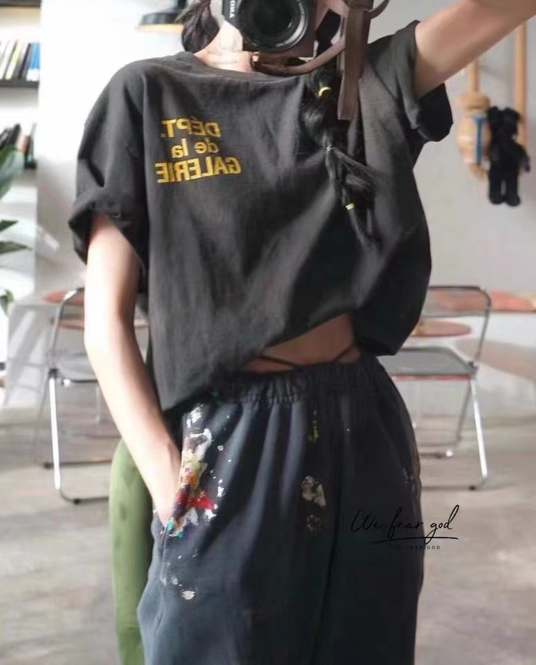 The Gallery Dept Distressed French Letter Logo Print T-Shirt features a faded, worn-out French text logo that channels the brand’s signature raw, deconstructed aesthetic. The lettering mimics chipped wall graffiti, with hand-scrawled imperfection and expressive texture. Crafted from soft cotton fabric and cut in a relaxed oversized fit, this tee blends underground art culture with streetwear defiance, making it a statement piece for any creative wardrobe.
