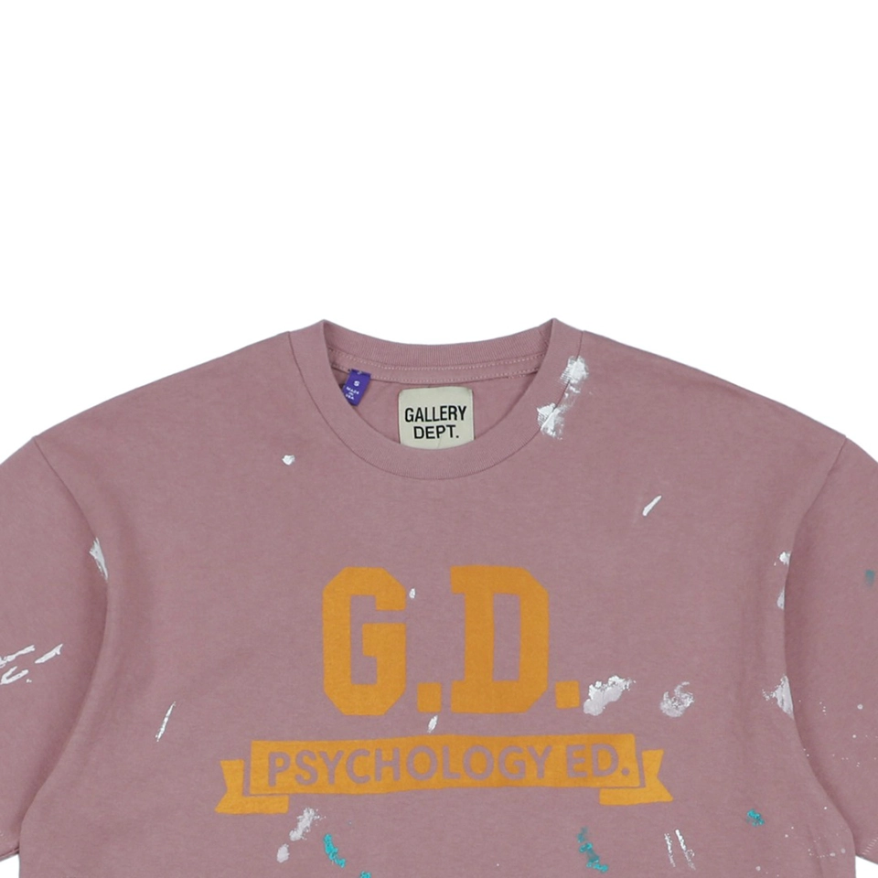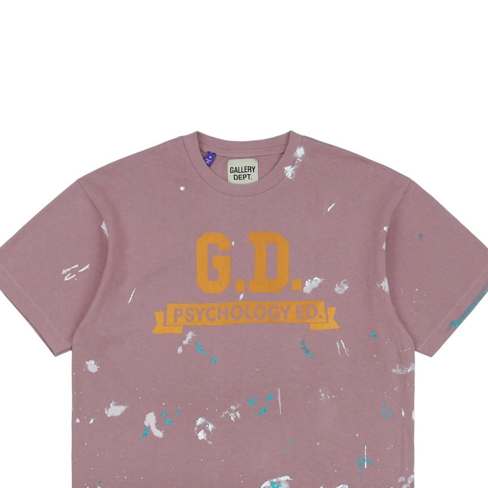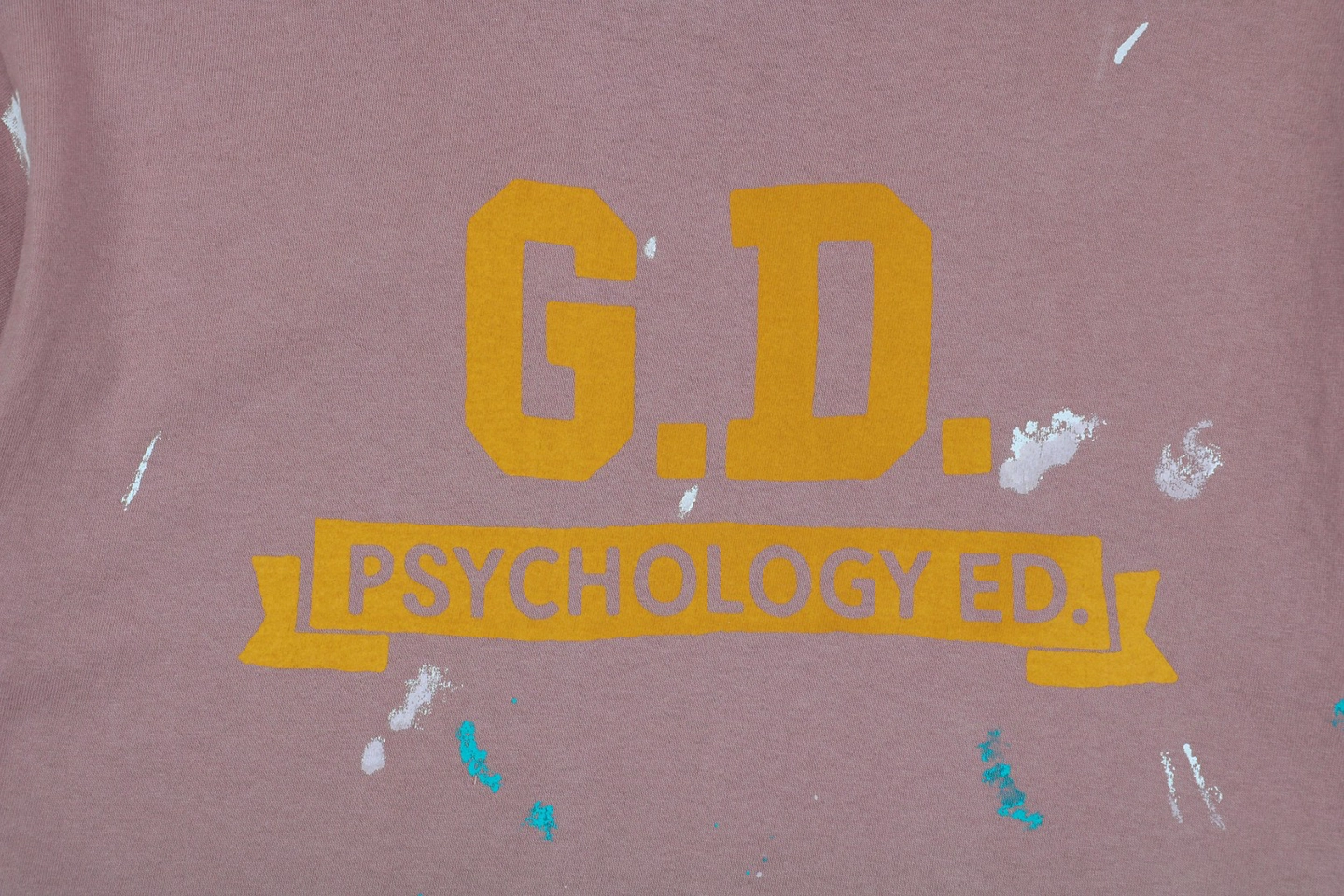 The Gallery Dept GD Scroll Letter Print T-shirt – Dirty Pink captures the label’s deconstructed, paint-splattered signature style. Crafted from soft cotton, the tee features a bold yellow “G.D.” typography over a scroll banner reading “PSYCHOLOGY ED.” across the chest, contrasted against an artfully distressed dirty pink backdrop. White and turquoise paint splatter effects add a DIY-inspired edge, while the relaxed silhouette offers effortless wearability. Finished with a single turquoise paint patch at the back for a one-of-a-kind aesthetic.