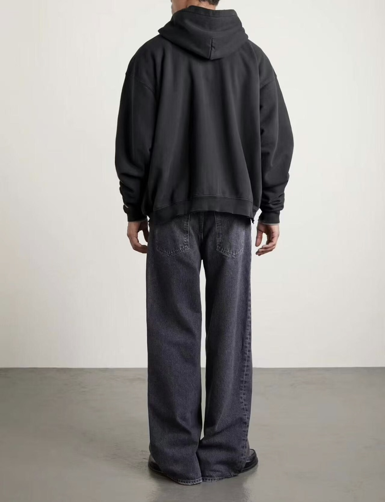 Constructed from heavyweight 430g custom cotton fleece, the hoodie offers exceptional structure while maintaining a soft and comfortable feel. The fabric undergoes a garment-washing process, enhancing the texture and creating a subtle vintage color depth that gives the hoodie its unique worn-in character.
