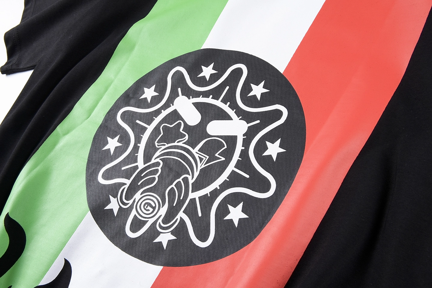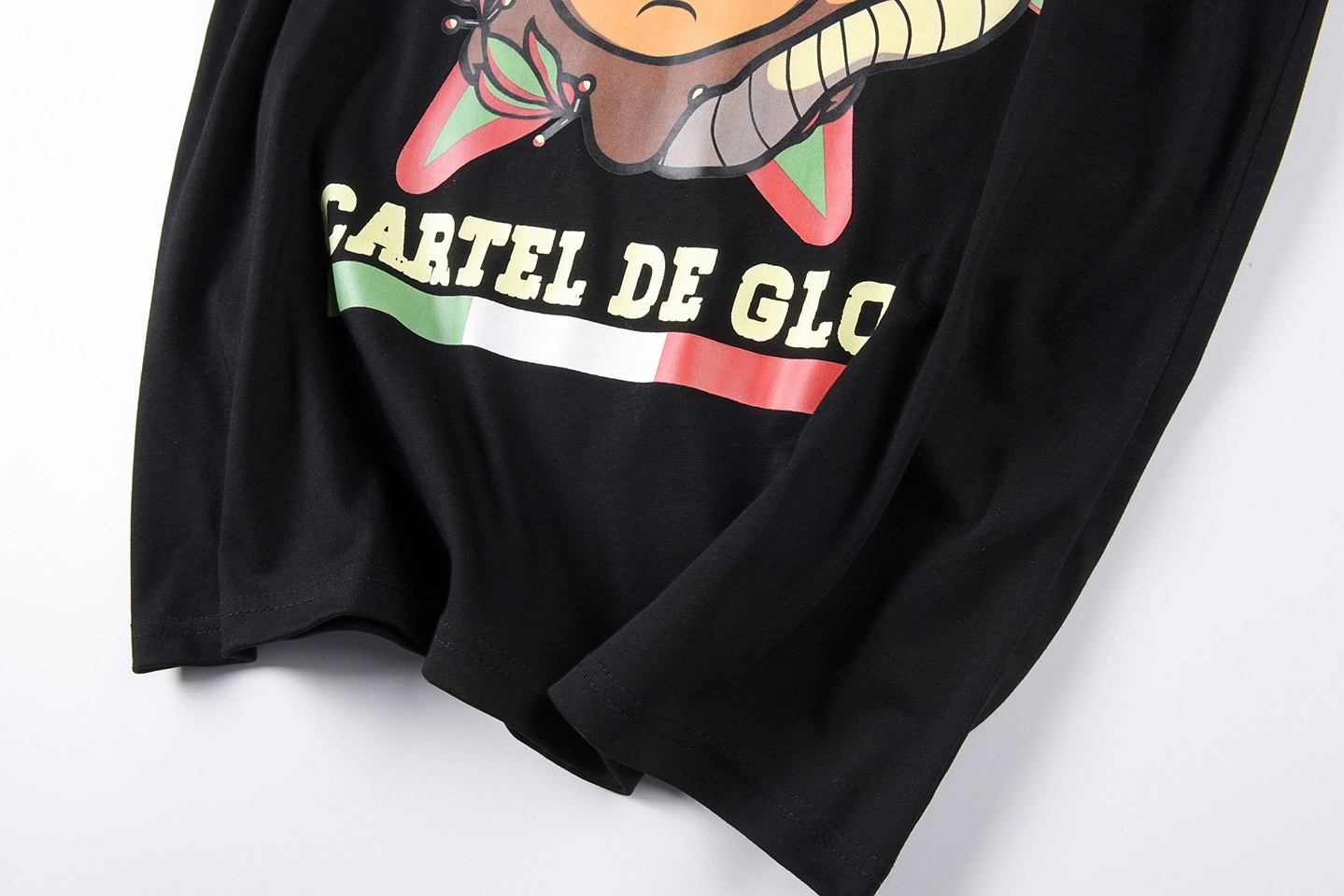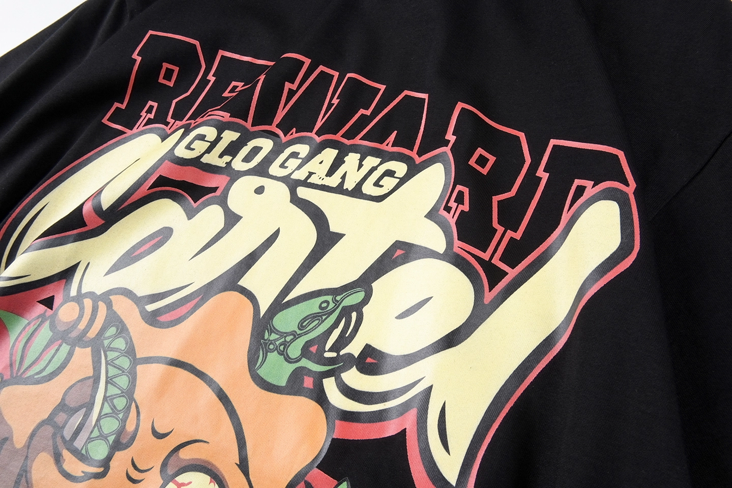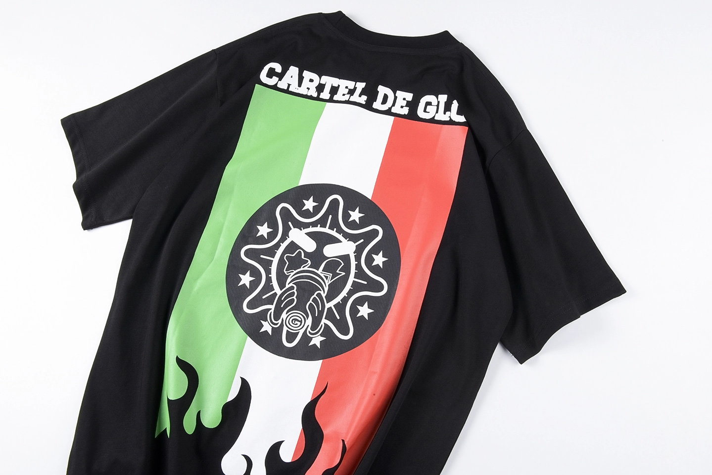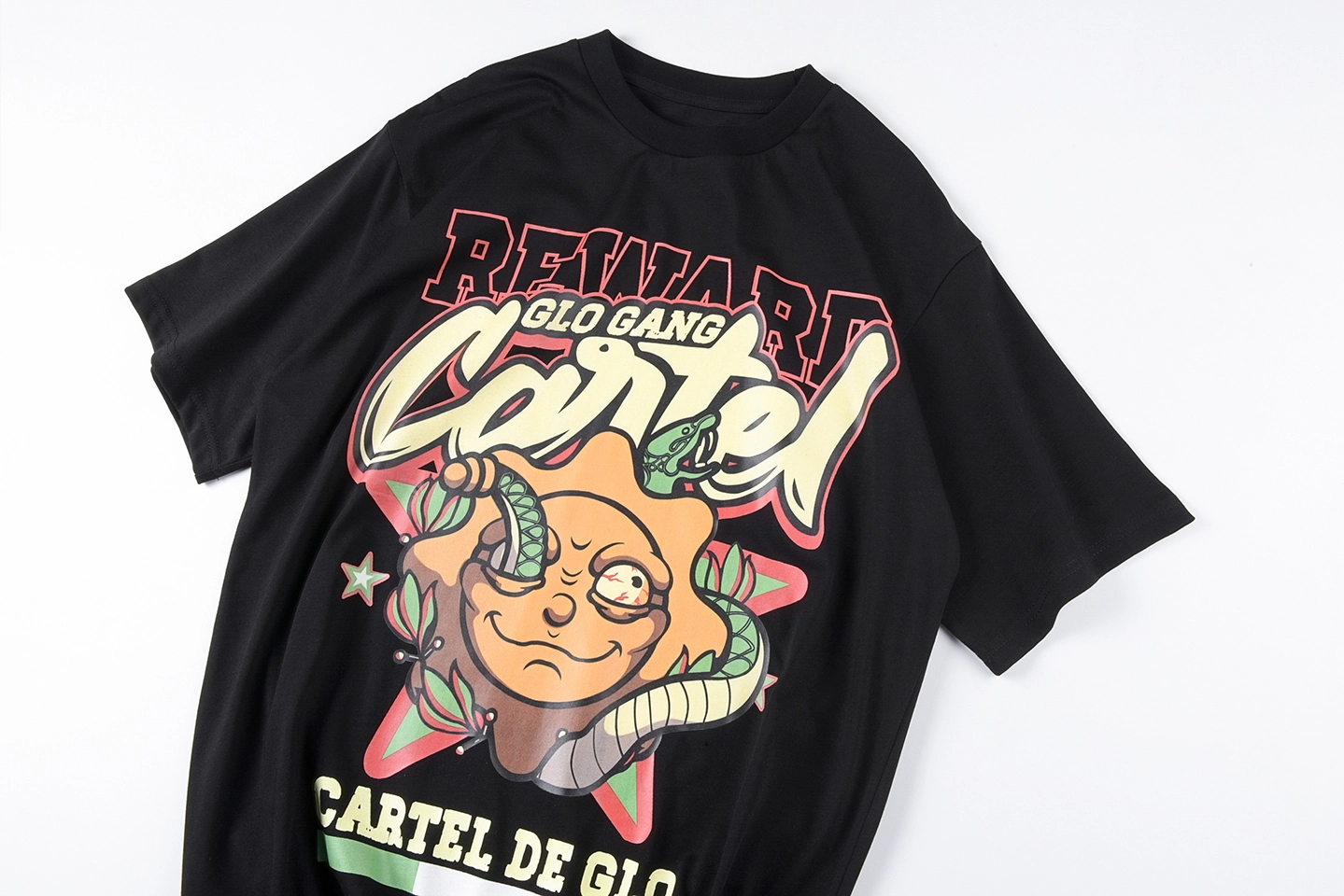 The Glo Gang Cartel de Glo Graphic T-Shirt combines bold street culture with cartoon-inspired menace. The front design features a sun-faced character entwined with serpents, paired with large graffiti-style “Cartel” lettering and the slogan “REWARD” in collegiate red. The bottom text “Cartel de Glo” nods to cartel themes with the Mexican flag tricolor beneath. On the back, a powerful flame graphic overlays a green-white-red vertical stripe and a black gas mask face emblem, reinforcing the rebellious vibe. Made with durable cotton, this tee makes a fierce visual statement.