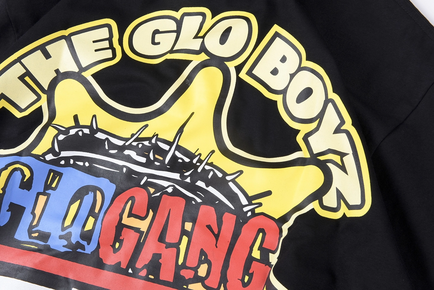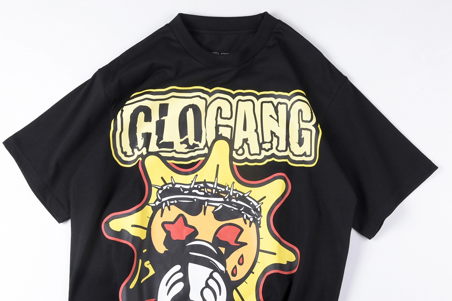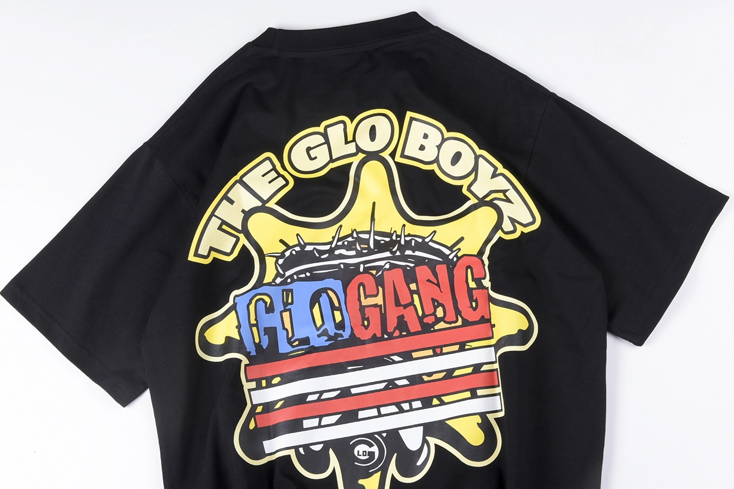 The Glo Gang Child of the Sun Graphic T-Shirt – Black is a bold tribute to the streetwear iconography of Chief Keef’s label. Crafted from premium cotton, this tee commands attention with a front graphic featuring the signature sun mascot crowned in thorns, holding a mic, with bold “CHILD OF THE SUN” lettering. The back is just as vivid, showcasing a flag-themed Glo Gang logo surrounded by “THE GLO BOYZ” and “WRLDWD” slogans. It blends rebellious energy, cosmic motifs, and hip-hop pride into a collectible tee designed for fans who live loud.