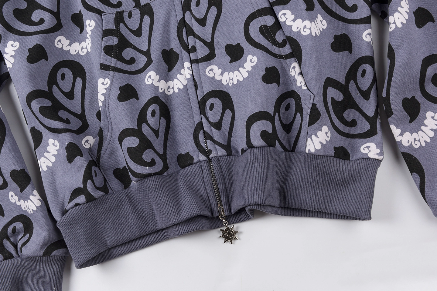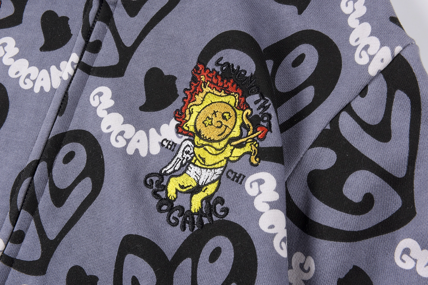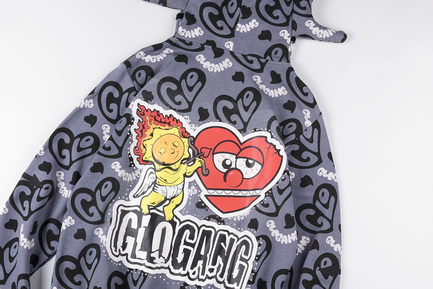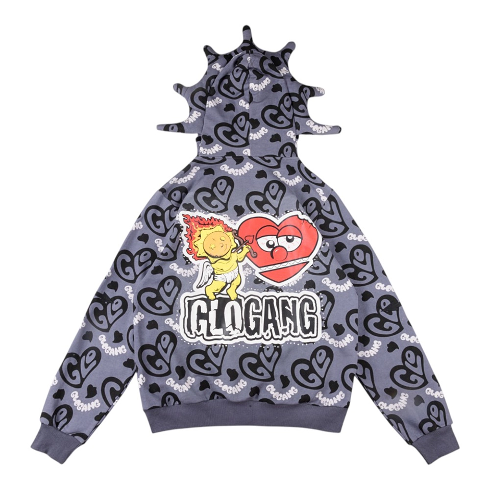 The Glo Gang Cupid Heart Graphic Full Zip Hoodie fuses playful street art with iconic cartoon-inspired imagery. Dominated by all-over “Glo” heart logos, the back features an oversized embroidered motif of a fiery cupid aiming at a skeptical heart, delivering instant visual impact. The hood showcases the signature spiked crown silhouette with full zip-up face mask detailing, while front chest patches—like “I ❤️ LA”—add an urban flair. Constructed from heavyweight cotton fleece, it balances boldness with premium comfort.