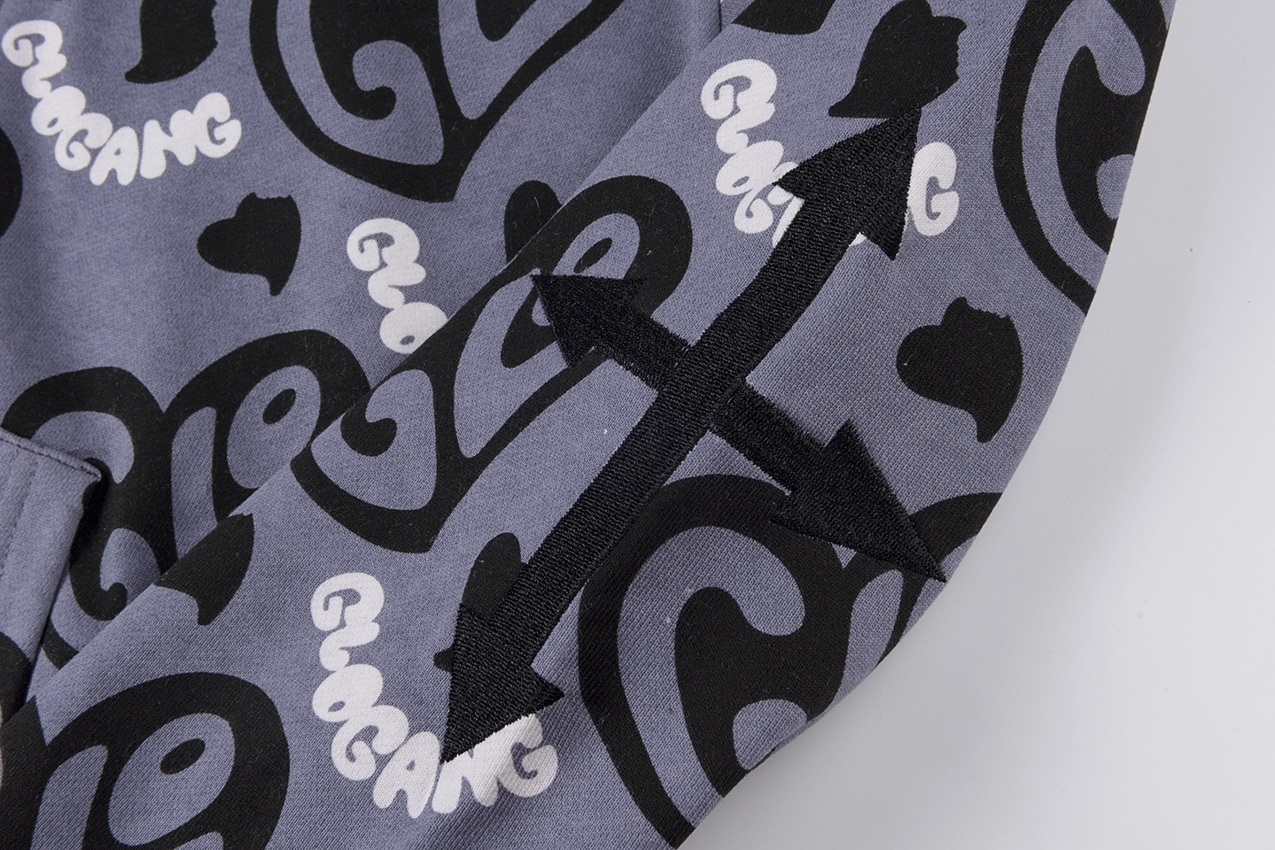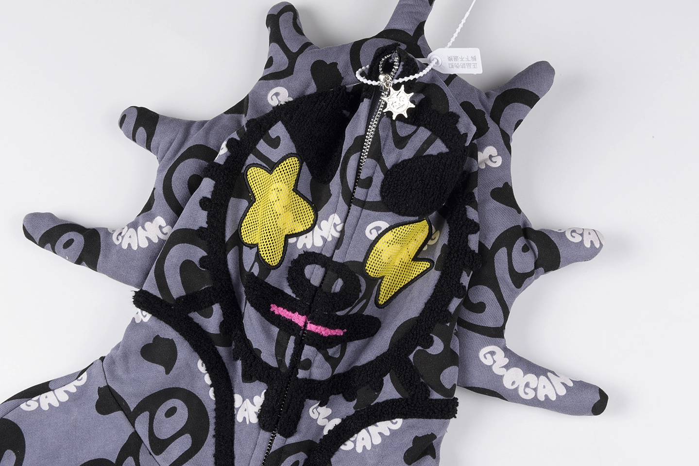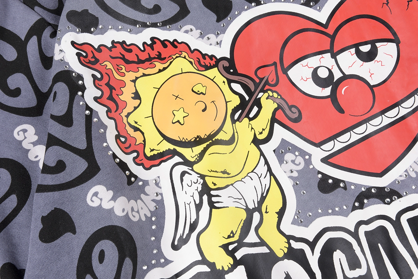 The Glo Gang Cupid Heart Graphic Full Zip Hoodie fuses playful street art with iconic cartoon-inspired imagery. Dominated by all-over “Glo” heart logos, the back features an oversized embroidered motif of a fiery cupid aiming at a skeptical heart, delivering instant visual impact. The hood showcases the signature spiked crown silhouette with full zip-up face mask detailing, while front chest patches—like “I ❤️ LA”—add an urban flair. Constructed from heavyweight cotton fleece, it balances boldness with premium comfort.
