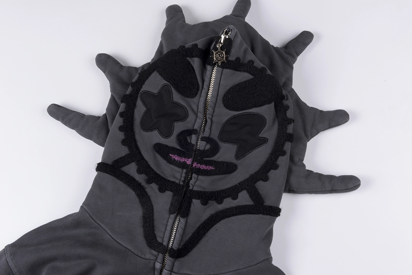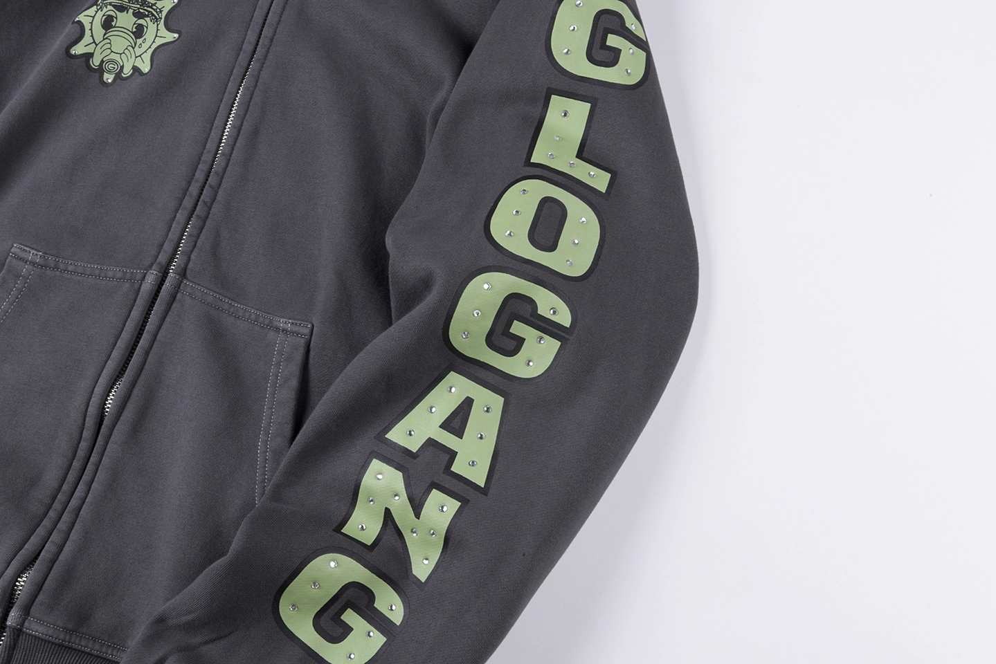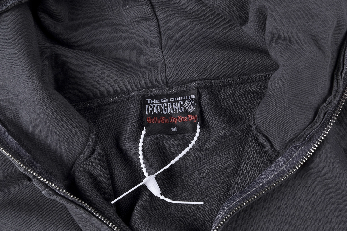 This Glo Gang Glory Boy Renegades Masked Zip-Up Hoodie stands out with a bold tribal-inspired back graphic and signature glow-green “GLOGANG” lettering down the sleeves. Crafted from heavyweight cotton, the piece features a full-face zip-up hood with spiked detailing and embroidered face accents, bringing a rebellious streetwear aesthetic. Finished with ribbed hems and functional kangaroo pockets, this hoodie combines comfort with expressive character.
