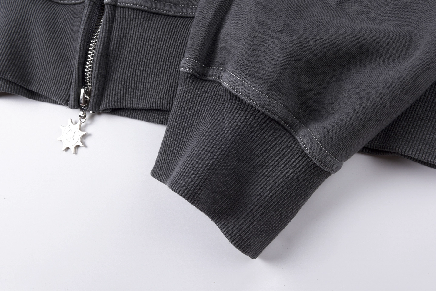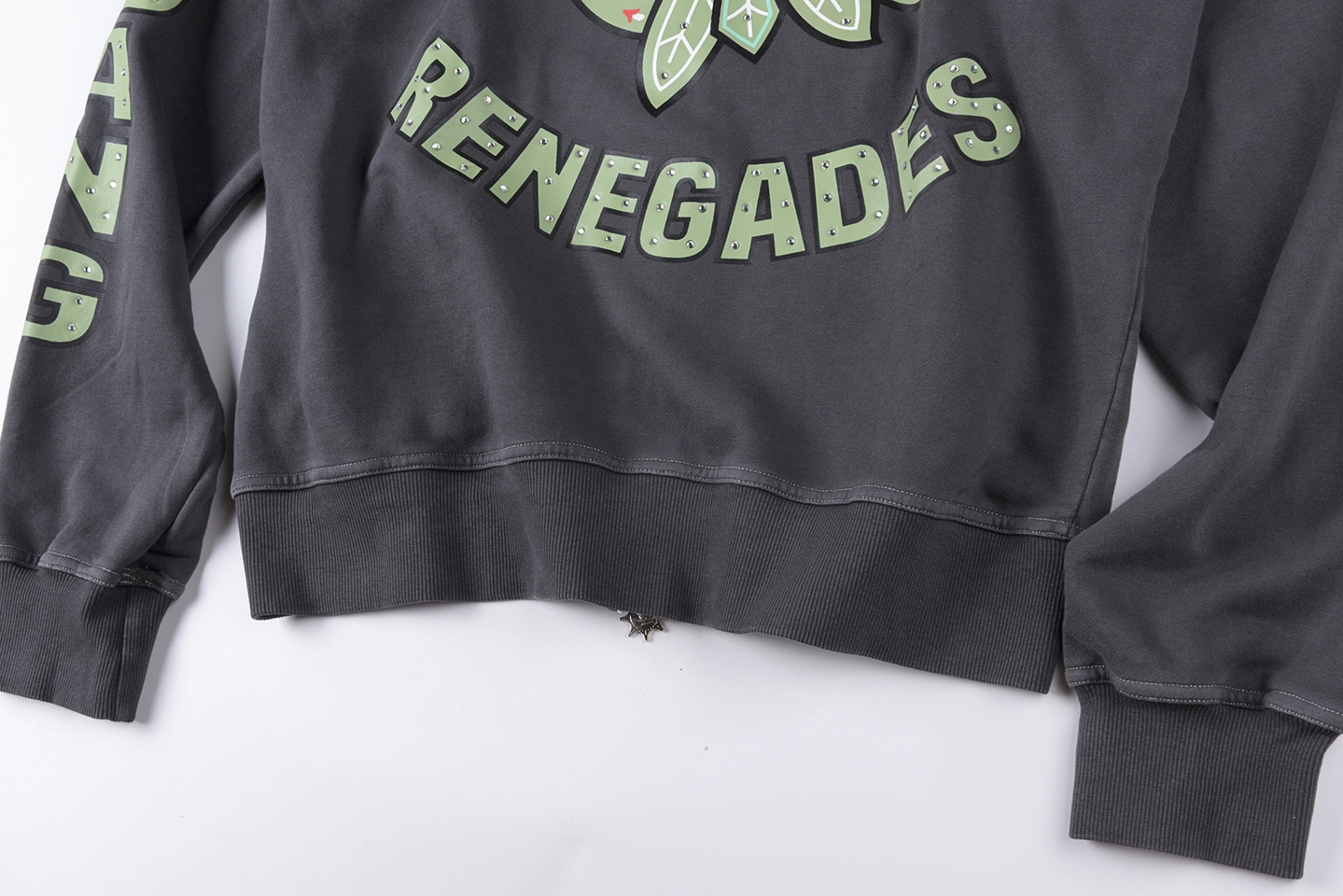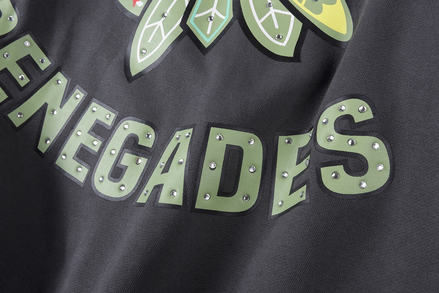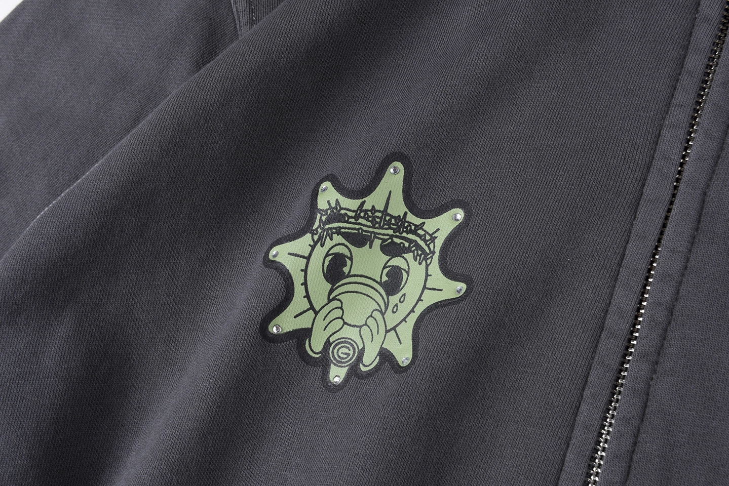 This Glo Gang Glory Boy Renegades Masked Zip-Up Hoodie stands out with a bold tribal-inspired back graphic and signature glow-green “GLOGANG” lettering down the sleeves. Crafted from heavyweight cotton, the piece features a full-face zip-up hood with spiked detailing and embroidered face accents, bringing a rebellious streetwear aesthetic. Finished with ribbed hems and functional kangaroo pockets, this hoodie combines comfort with expressive character.