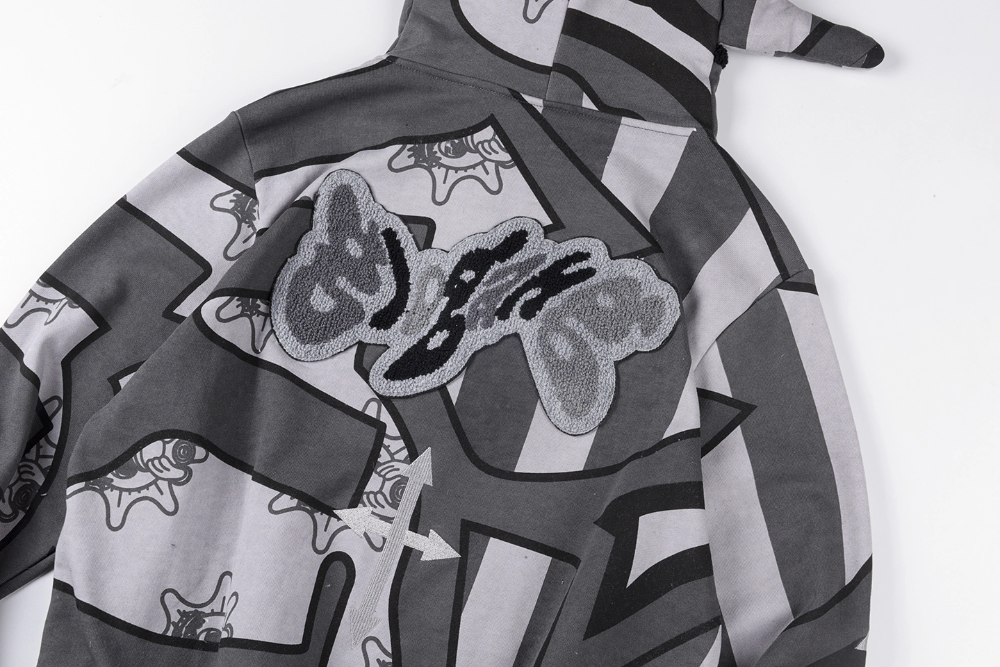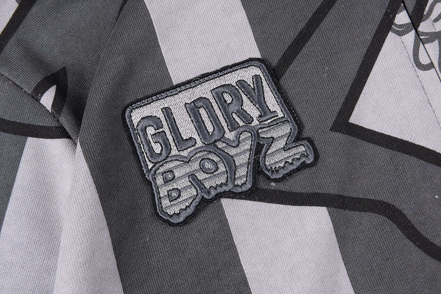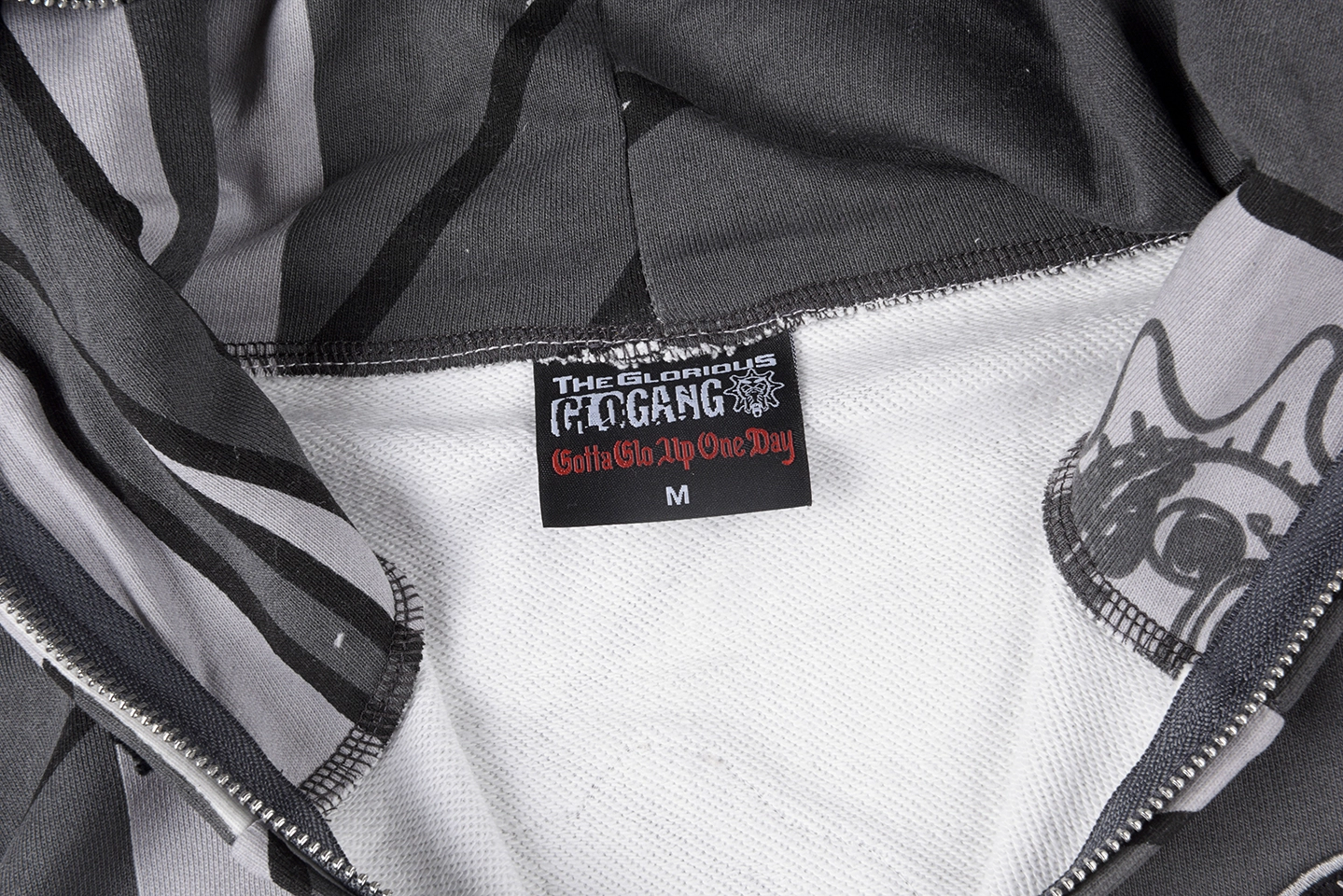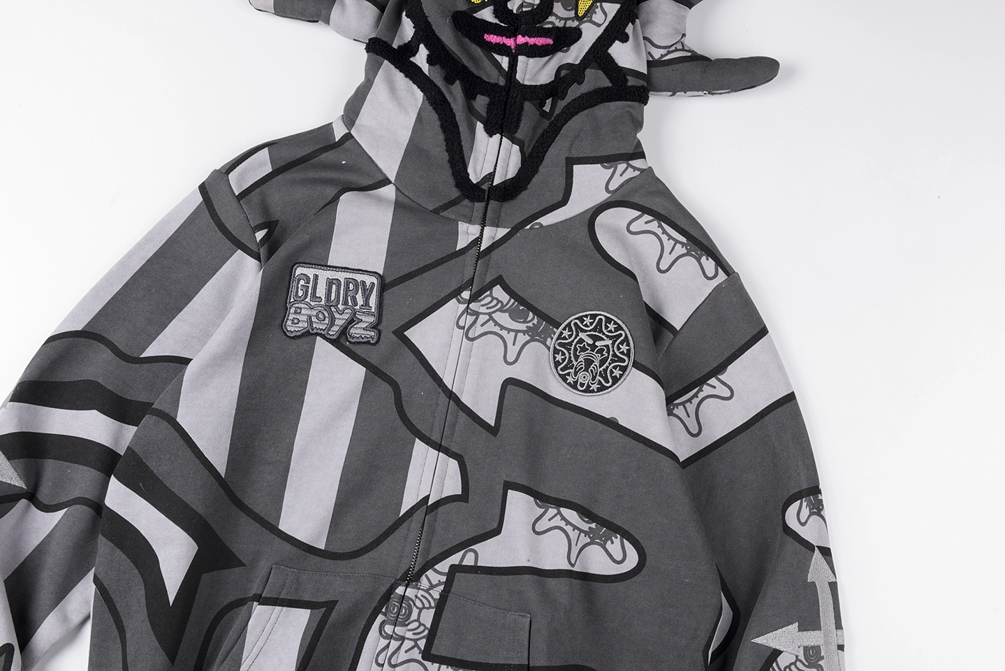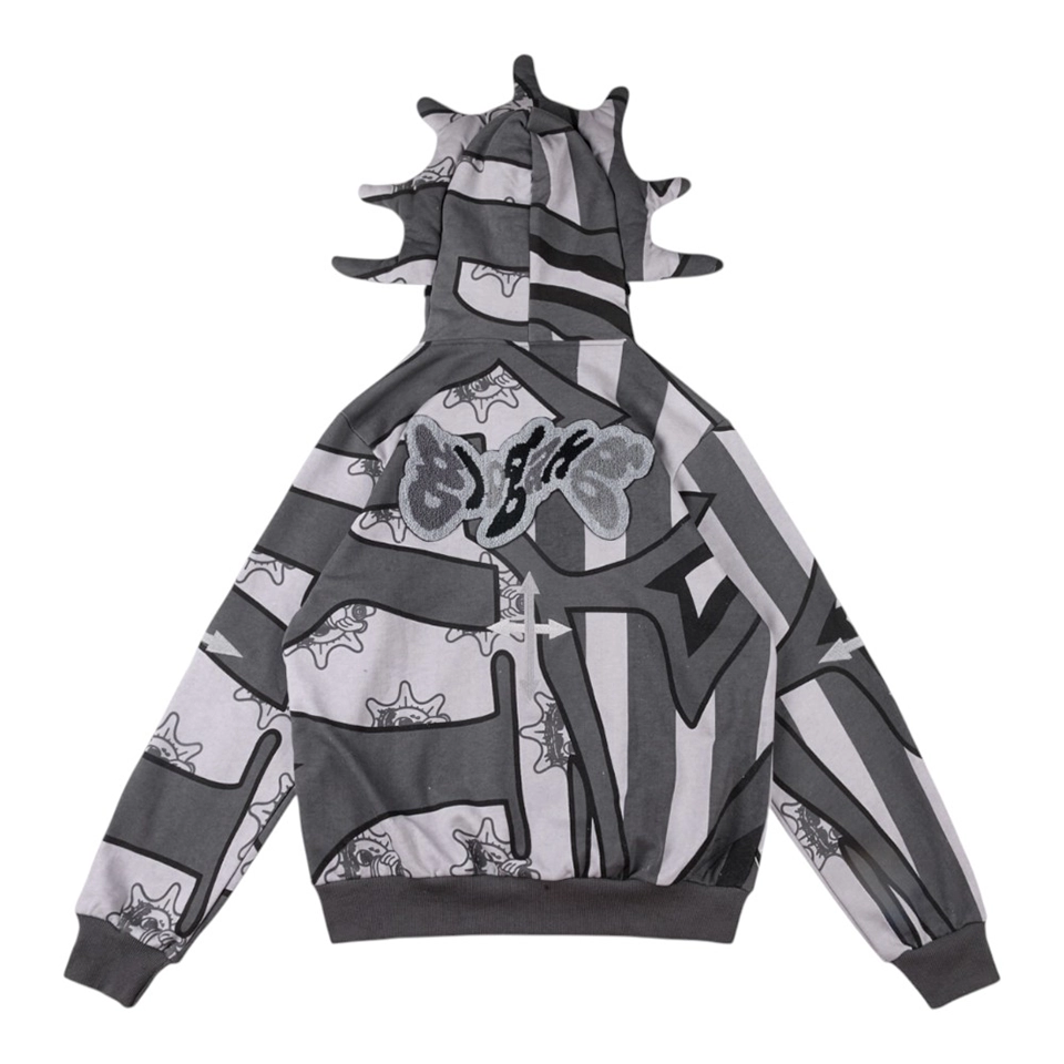 The Glo Gang Glory Boyz Stripe Mask Full-Zip Hoodie fuses surreal streetwear with unmistakable attitude. Featuring bold grayscale stripes interwoven with cartoonish Glo Gang sun-face motifs, this hoodie grabs attention with a full-zip mask hood complete with 3D spikes and vivid yellow star-eye embroidery. The chenille “Big Glo” back patch and “Glory Boyz” chest logo inject iconic branding, while ribbed cuffs and hem deliver a snug, comfortable fit. Perfect for fans of daring aesthetics and cultural symbolism.