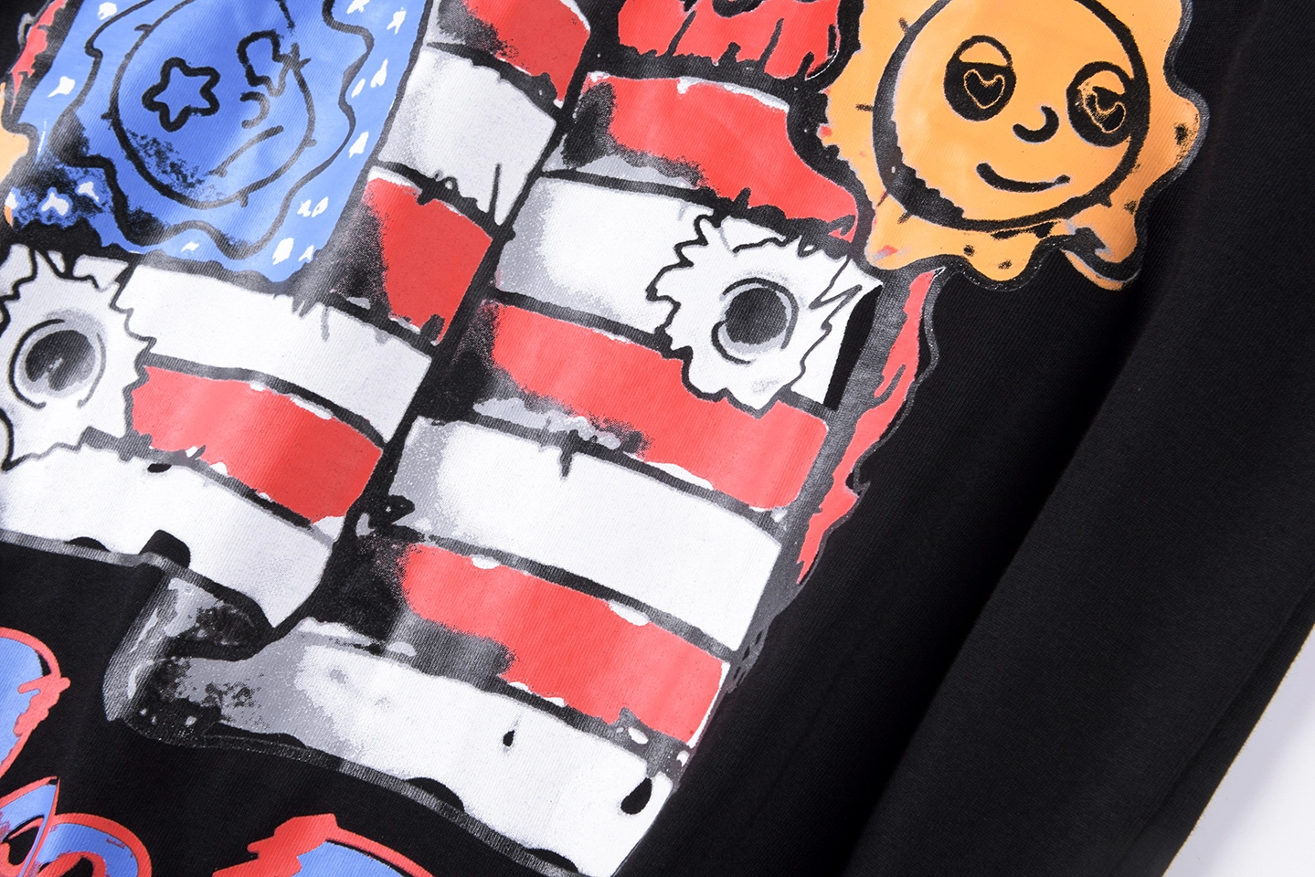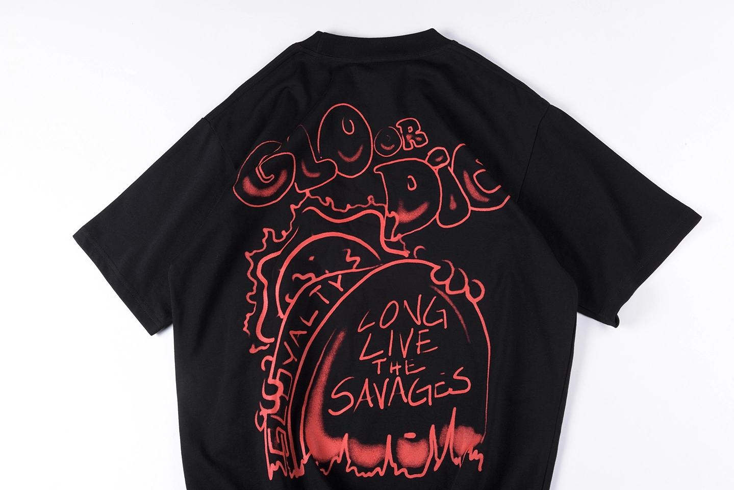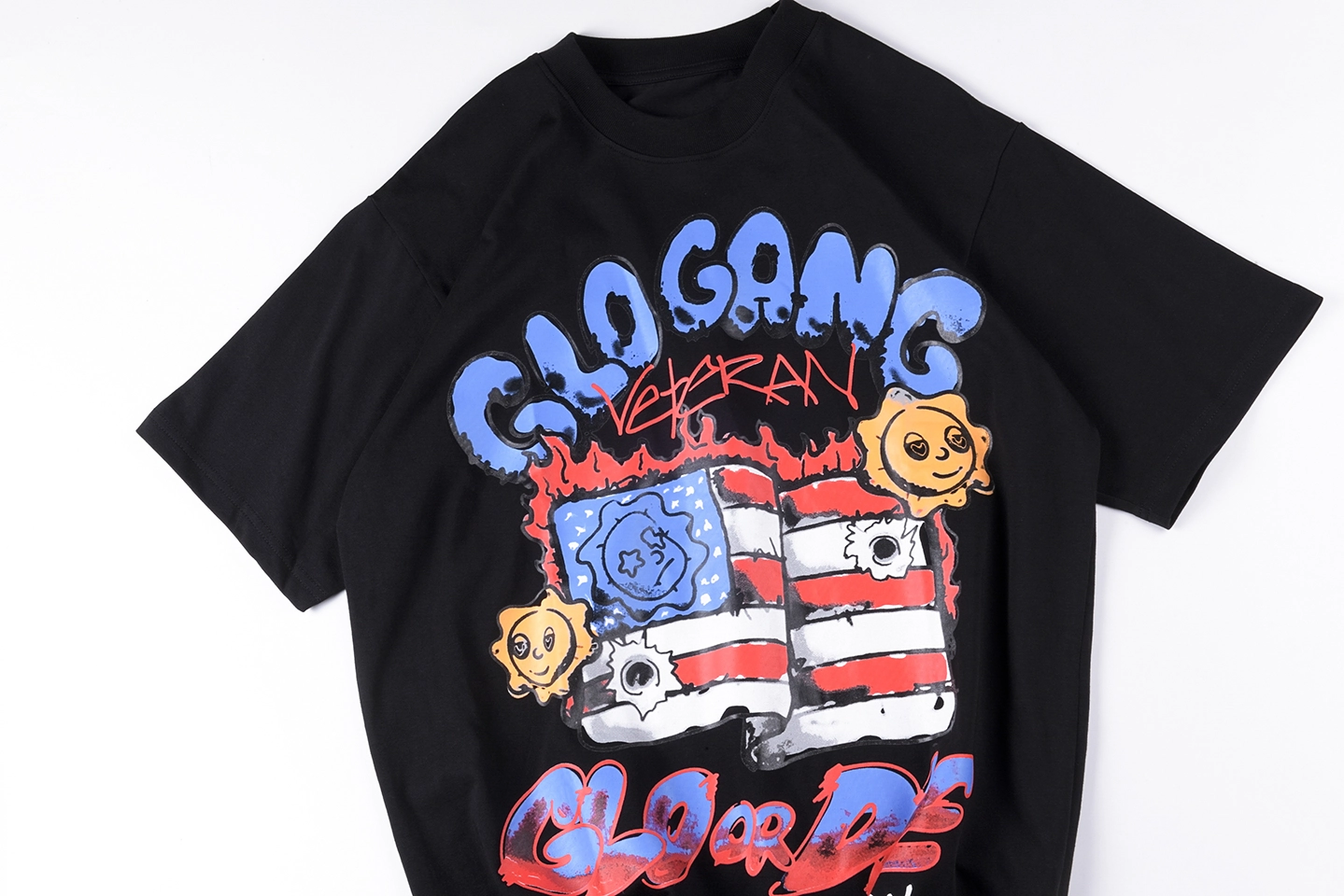 The Glo Gang Graphic Independence Black T-shirt bursts with bold political satire and street art vibes, combining “Glo or Die” slogans with cracked smiley faces and a bullet-ridden American flag design. This tee captures the rebellious essence of the Glo Gang aesthetic, using vivid red, blue, and yellow to emphasize contrast against the jet-black cotton base. An oversized back graphic inscribed with “Loyalty” and “Long Live the Savages” delivers punchy attitude and underground credibility.