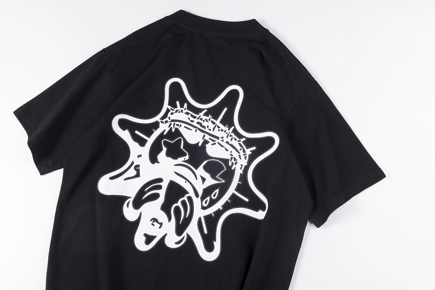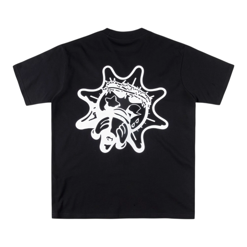 The Glo Gang Red Heart Knife Graphic T-shirt features a mischievous red heart character gripping a knife and soda can, surrounded by puff clouds and topped with bold, distressed “GLOGANG” lettering. Crafted from soft 100% cotton in jet black, this piece fuses street-style rebellion with playful cartoon aggression. The back sports a large monochrome Glo Gang mascot wearing a spiked crown, adding a bold and symbolic layer to the look. A must-have for fans of Glo Gang’s visual anarchy.