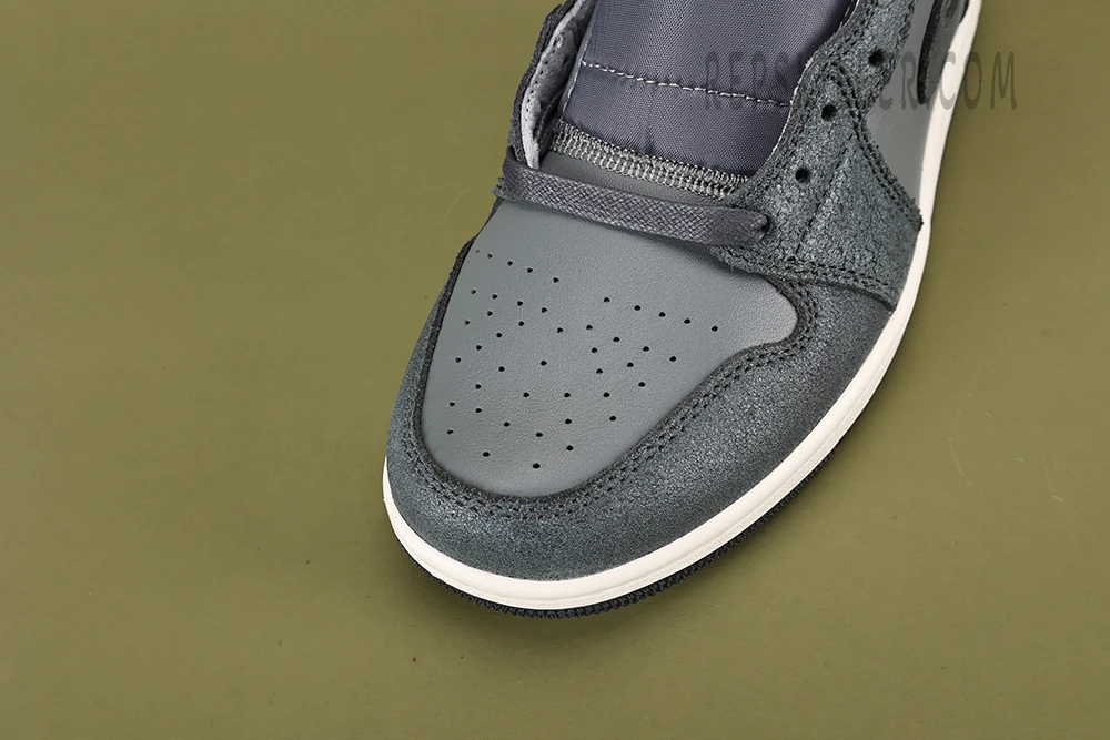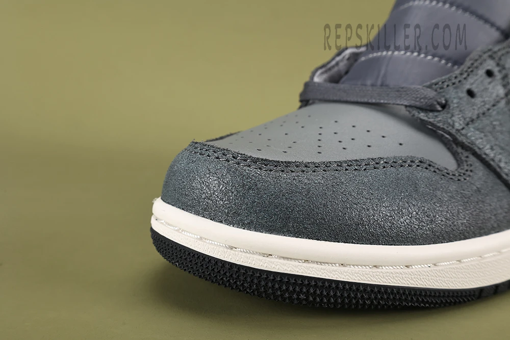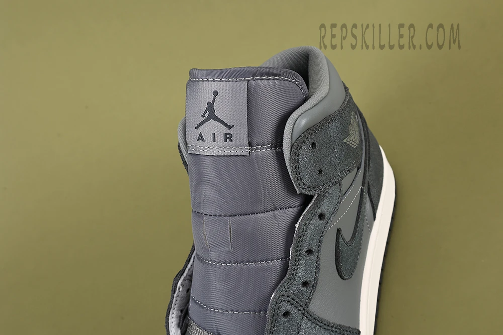 The ‘Distressed Smoke Grey’ colorway stands out with its muted yet impactful palette. The upper is predominantly constructed from a combination of grey suede and leather, giving the sneaker a rugged, worn-in look that’s both stylish and versatile. The distressed effect adds a layer of character, making each pair slightly unique with variations in the weathered finish. This grey base is complemented by black accents on the Swoosh, laces, and collar, adding depth and contrast to the design.