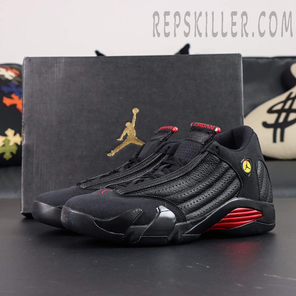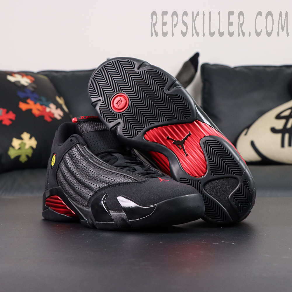 The Air Jordan 14 Retro ‘Last Shot’ 2018 is a powerful tribute to one of the most legendary moments in NBA history. Worn by Michael Jordan during his iconic game-winning shot in the 1998 NBA Finals, this silhouette returns with all the original details intact. Dressed in black tumbled leather and suede overlays, the shoe features Ferrari-inspired design cues, including a sculpted midsole and the signature yellow Jumpman shield emblem. Red accents at the heel and midfoot deliver contrast and energy, cementing this model’s legacy as a symbol of greatness.