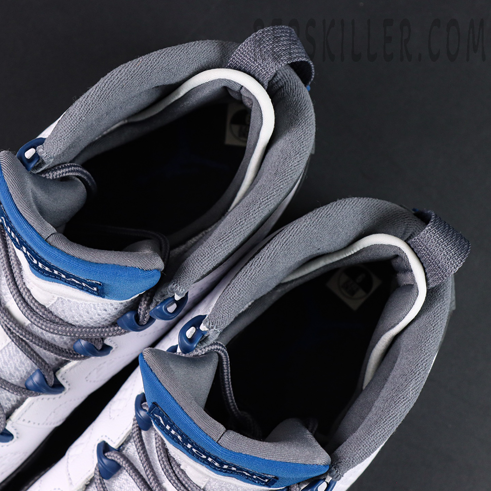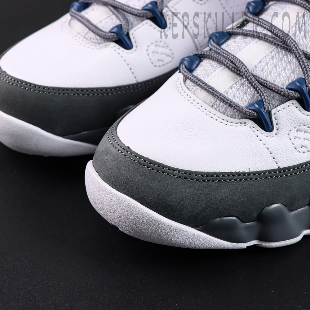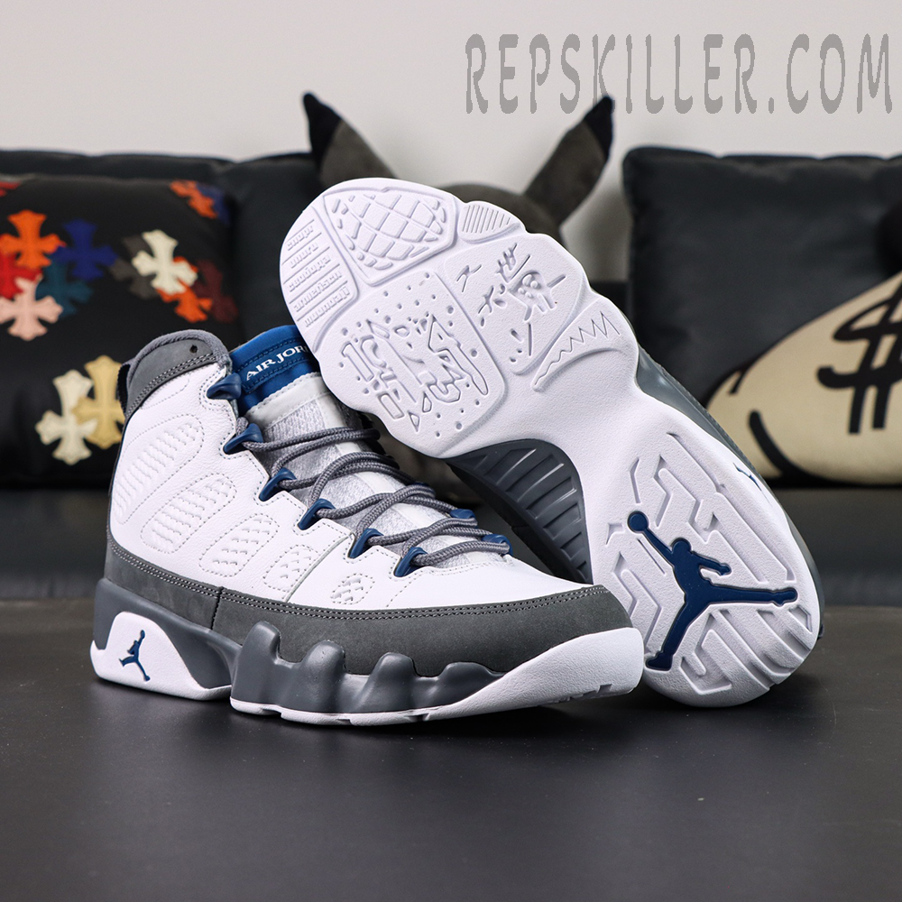 The upper features a premium white leather base paired with soft grey nubuck overlays, delivering a balanced mix of texture and durability. Signature stitched paneling along the sidewalls enhances depth and structure, while subtle French Blue accents appear on the Air Jordan tongue tag and the embroidered “23” on the heel, adding a refined pop of color that stays true to the original design. These details make the pair stand out among high-quality Jordan 9 reps and premium sneaker reps.