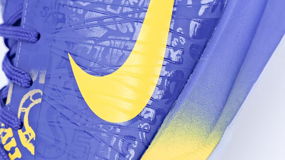 The Zoom Kobe 5 Protro ‘5 Rings’ features a vivid color scheme, predominantly in Concord, a rich purple hue, accented with vibrant midsole graphics that showcase a laser-etched design commemorating Kobe’s five championship rings. The design also includes gold detailing, further emphasizing the championship theme and adding a touch of luxury and prestige.