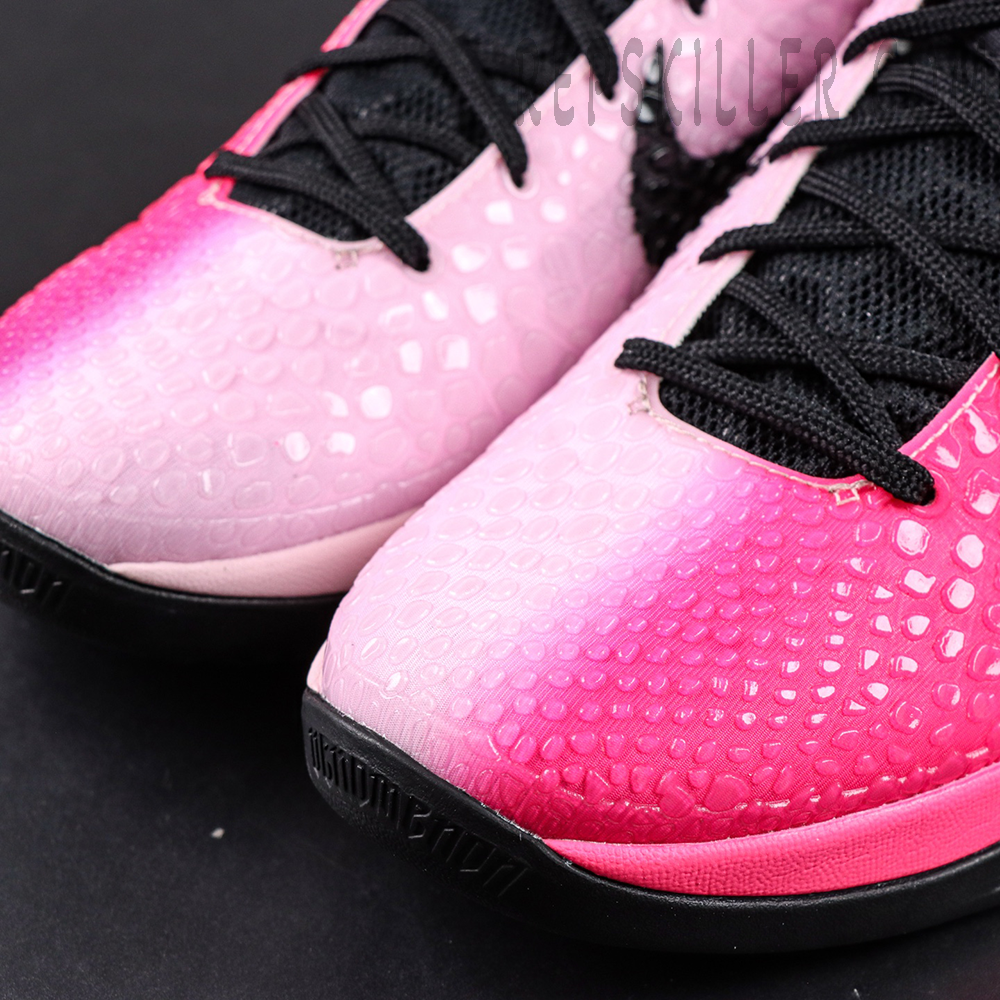 The upper showcases the signature Kobe 6 snakeskin-textured material, finished in a striking gradient of vibrant pink and soft blush tones. Black accents on the Swoosh, laces, and heel counter provide sharp contrast while enhancing the aggressive silhouette. Subtle branding details, including Kobe’s signature and heel logo, reinforce the premium, performance-driven design that defines top-tier Kobe 6 Protro reps.