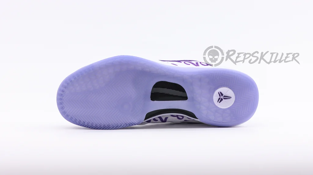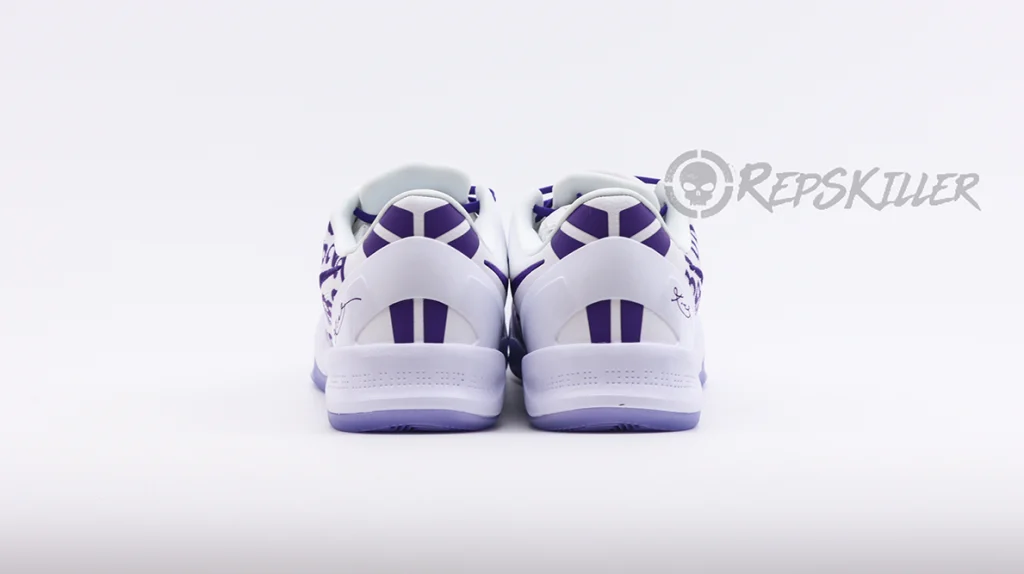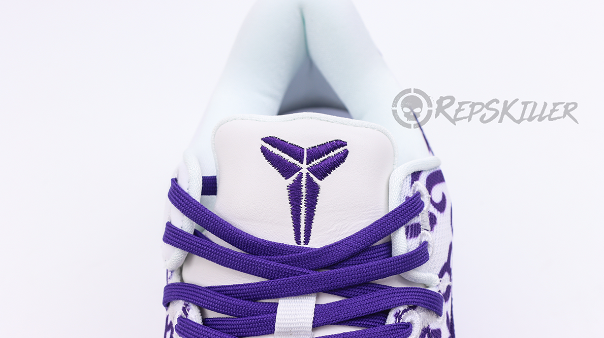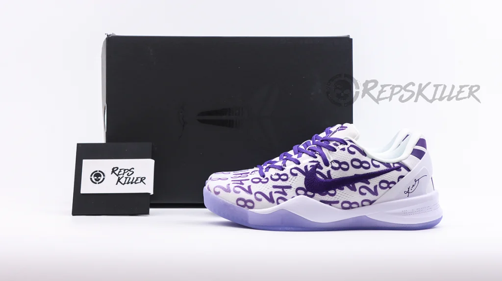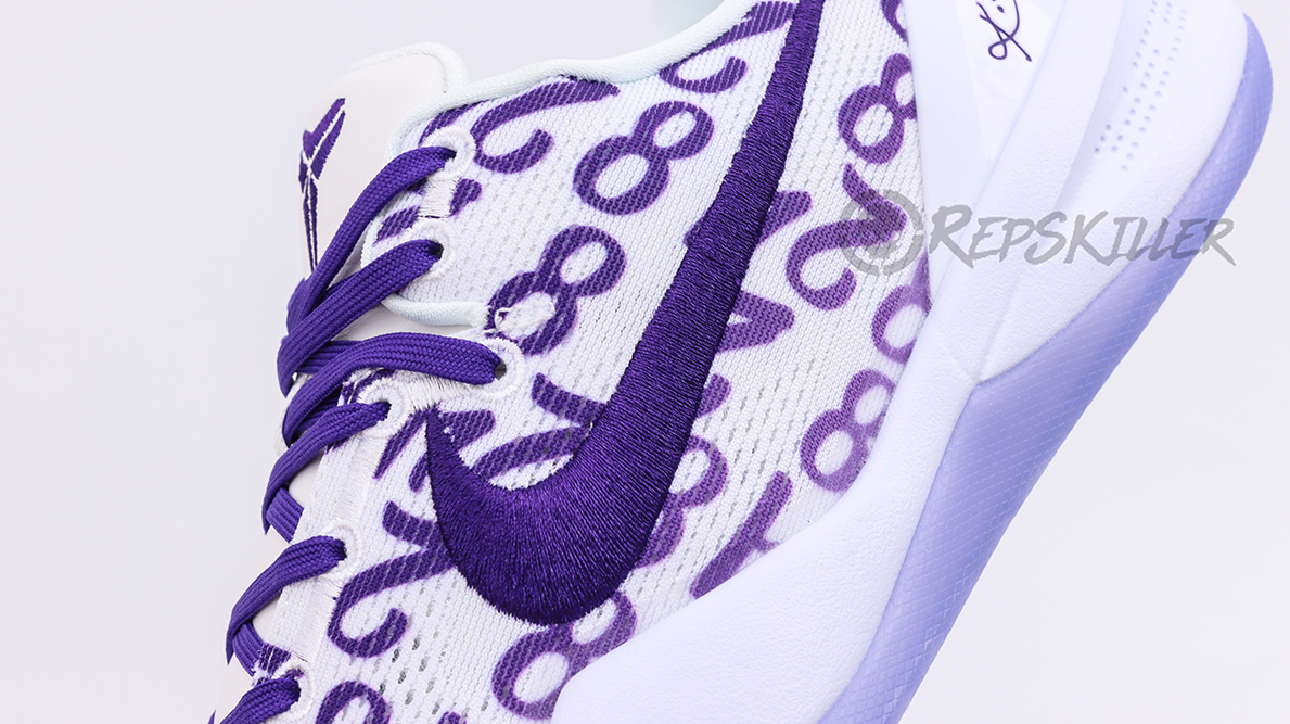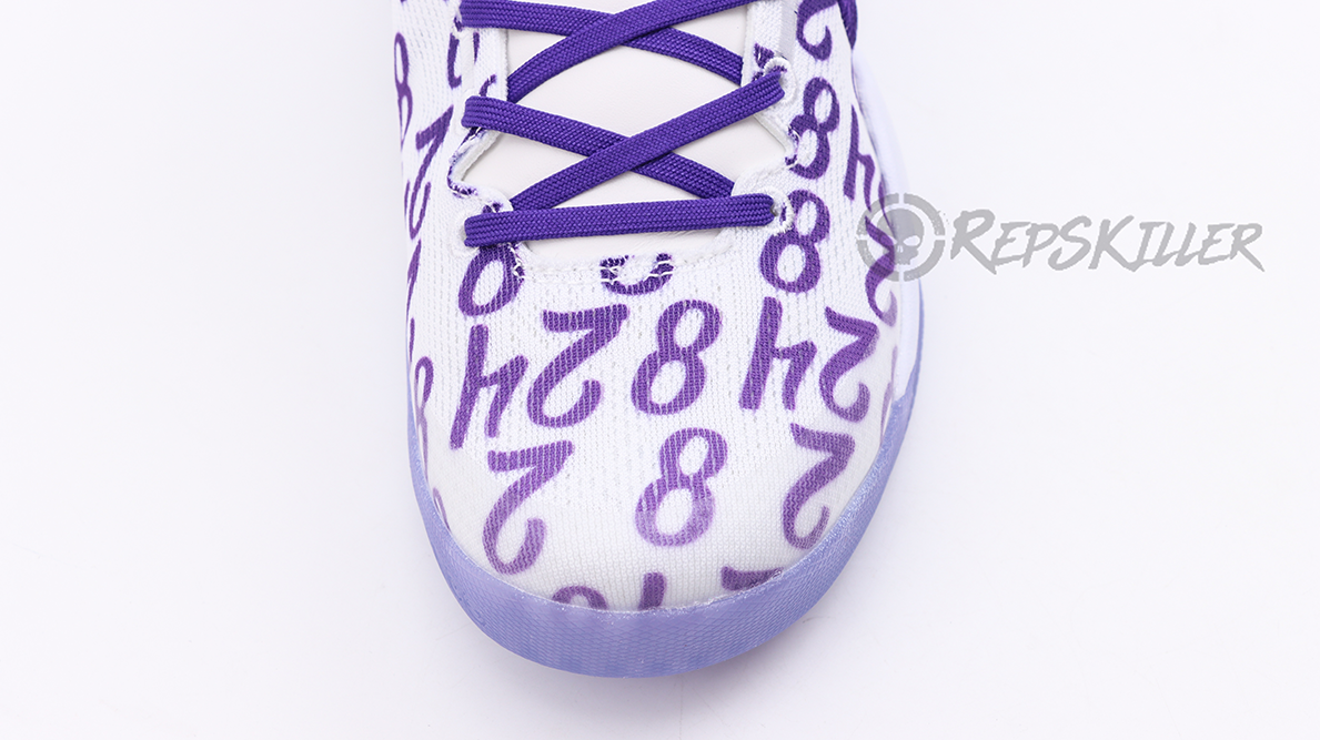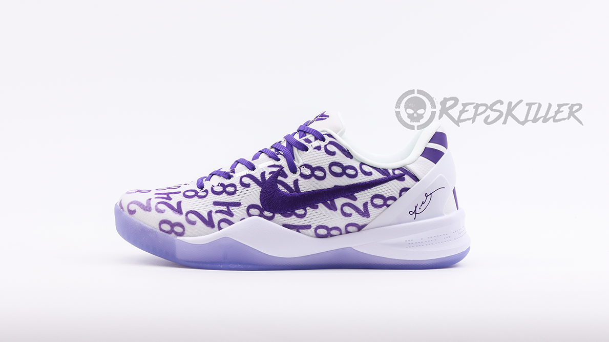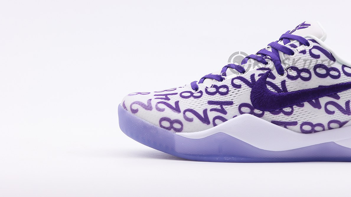 The “8” and “24” are arranged in a repeating pattern on a white engineered mesh upper that is secured with purple laces and features a padded low-top collar. A built-in React foam midsole provides lightweight cushioning with every step. The footbed is purple translucent rubber that reveals a carbon fiber sole to ensure midfoot stability.