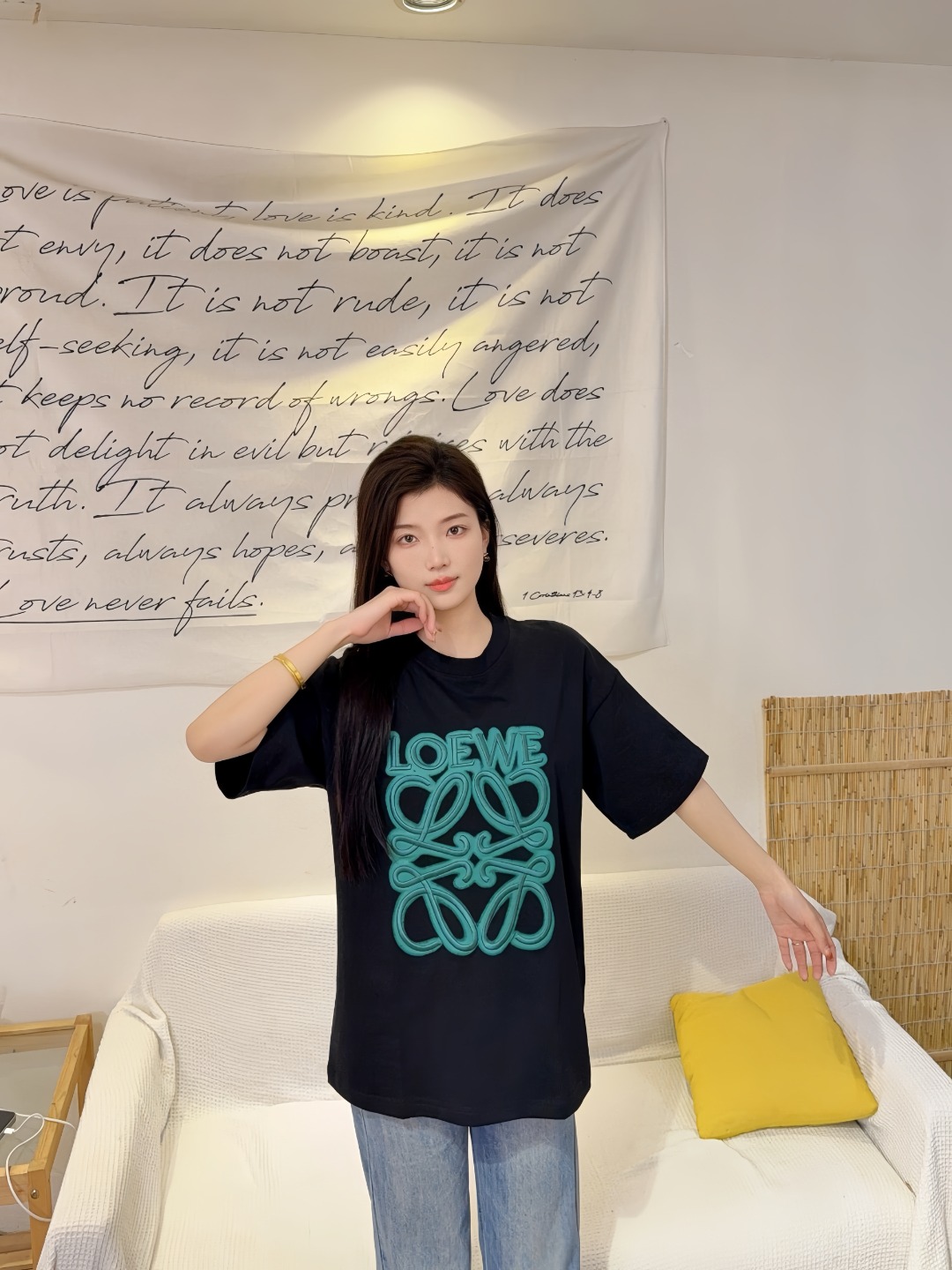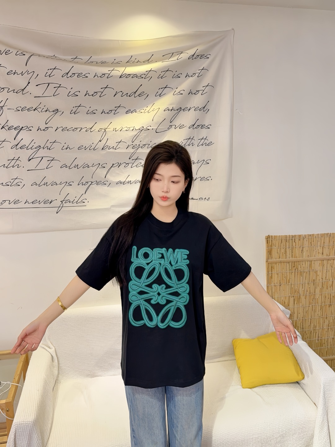 The L Neon Anagram Embroidery T-shirt fuses minimalist structure with a bold emblematic statement. Crafted from high-quality cotton, the tee showcases a vibrant three-dimensional embroidered Anagram logo at the center front—available in contrasting neon hues like turquoise or amber for modern impact. Its soft hand-feel, regular fit, and clean crew neckline make it a refined staple with elevated streetwear appeal.