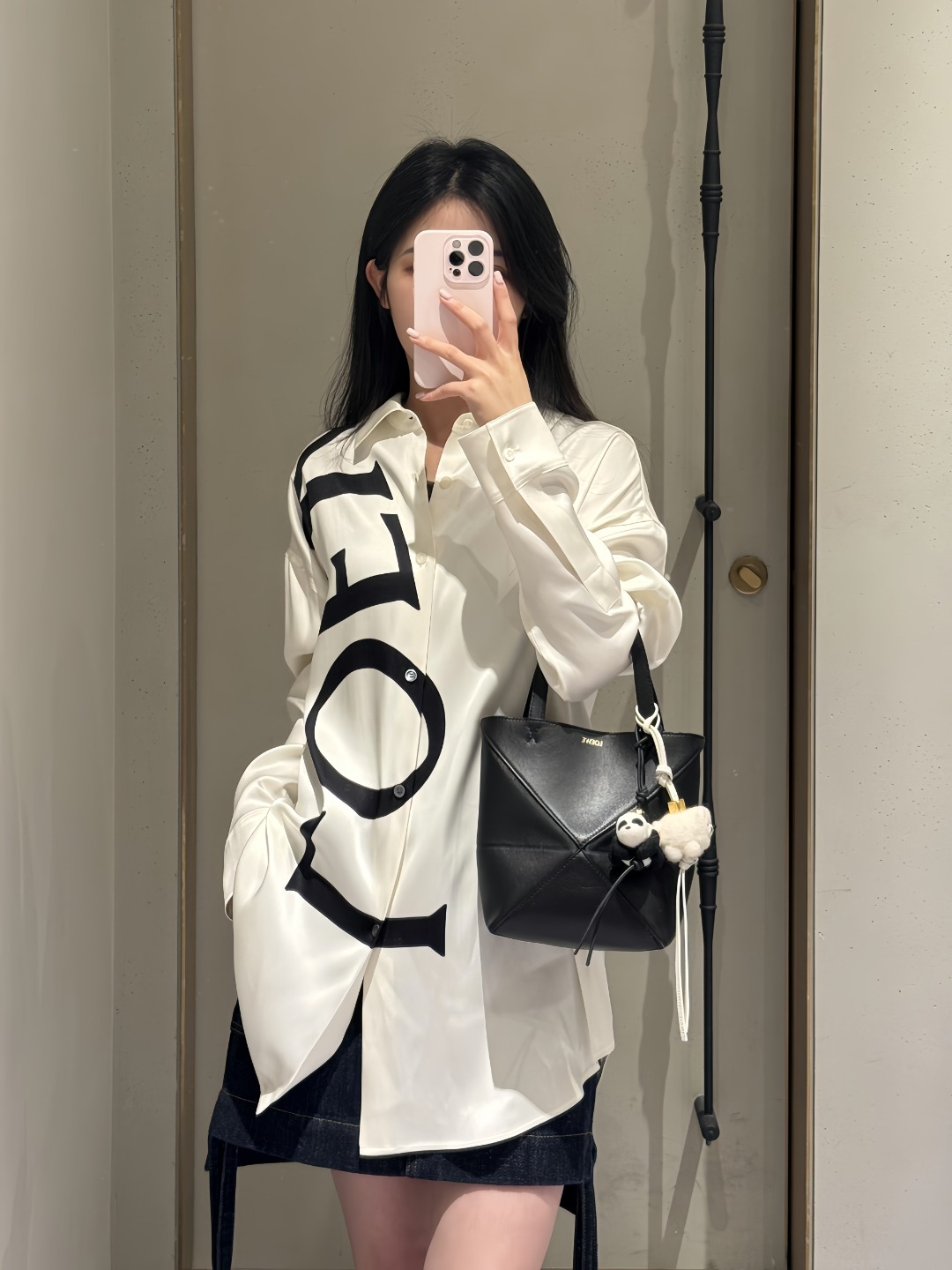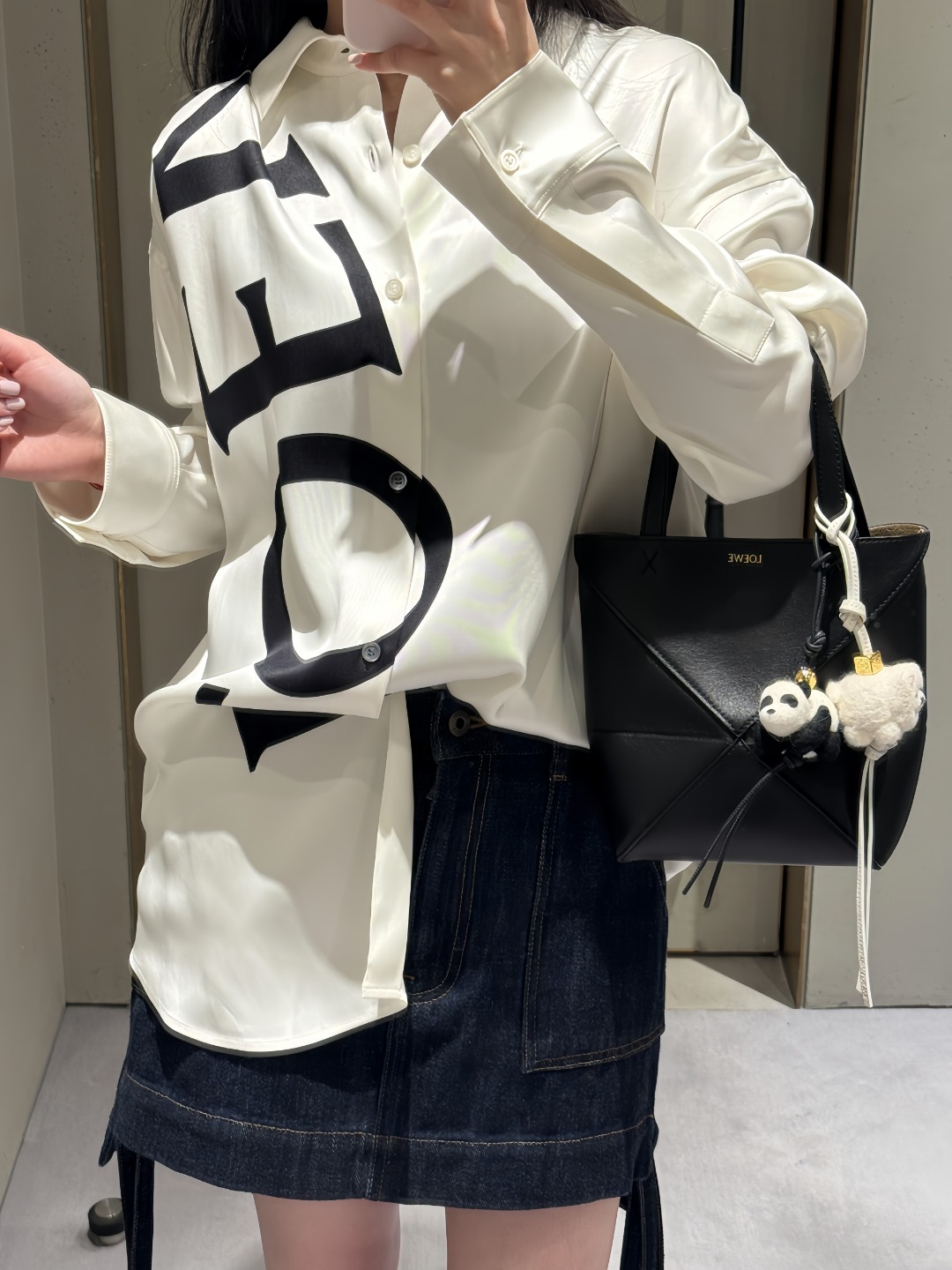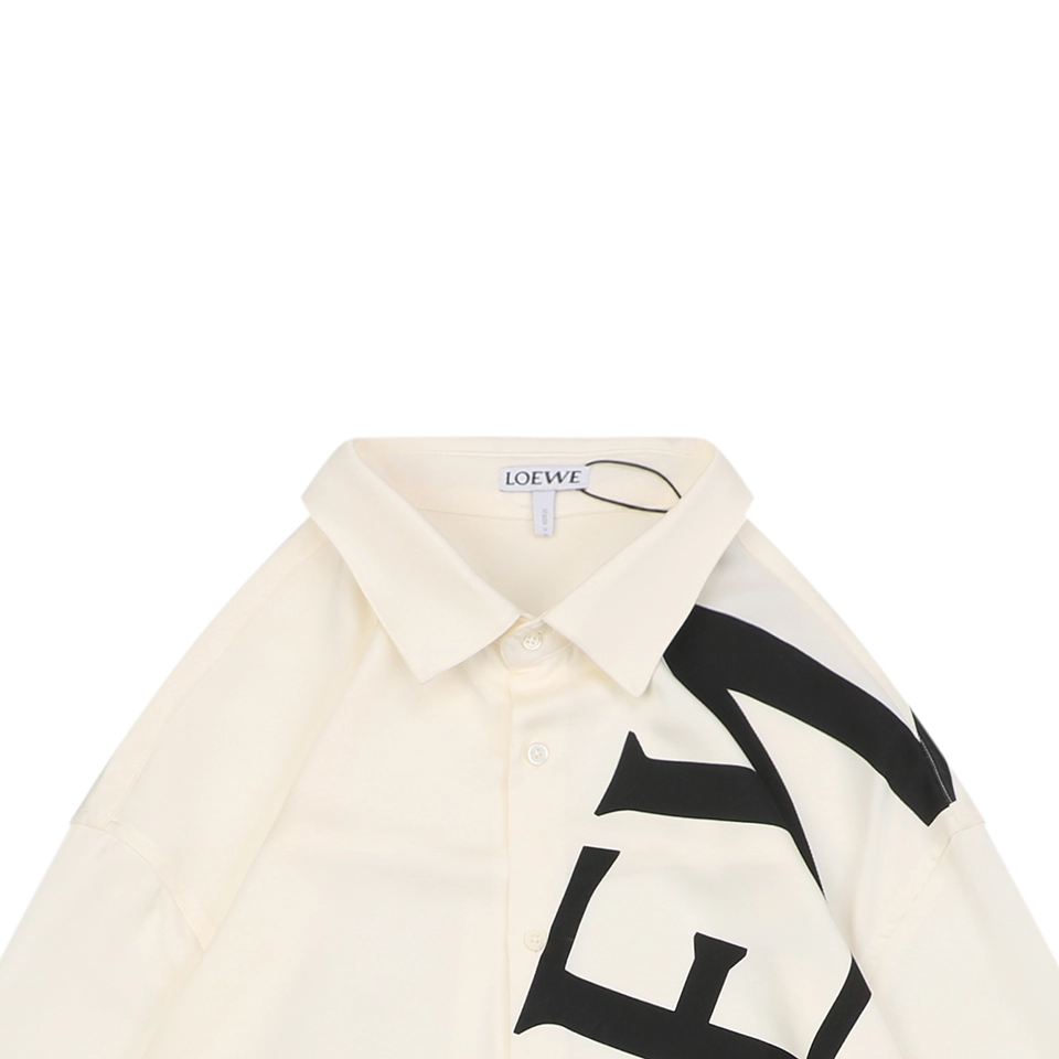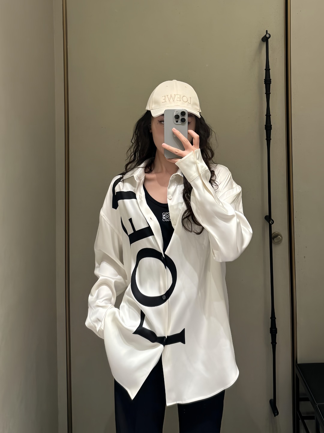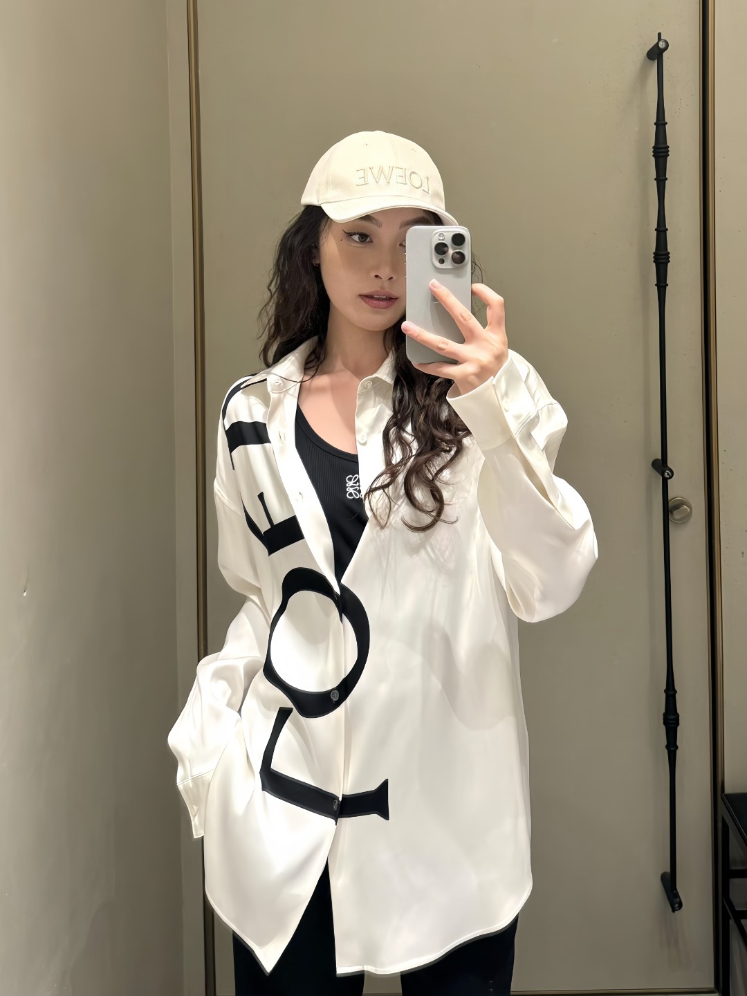 This L Oversized Logo Print Shirt makes a bold statement with its striking black L lettering slanted across the front and back. Crafted from a smooth, slightly lustrous cotton-blend fabric, it combines minimal elegance with graphic impact. The curved hem and relaxed silhouette offer effortless drape, while the dropped shoulder seam adds to the casual-luxe appeal.