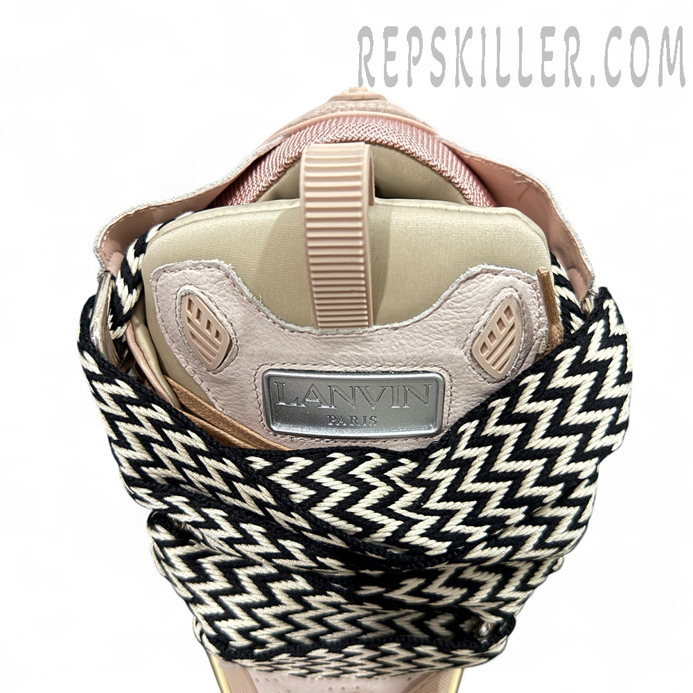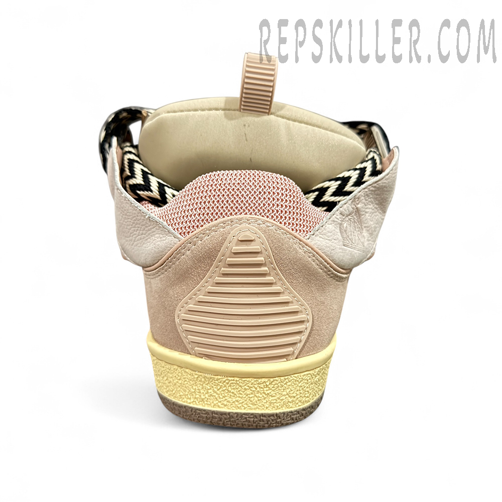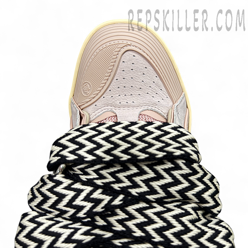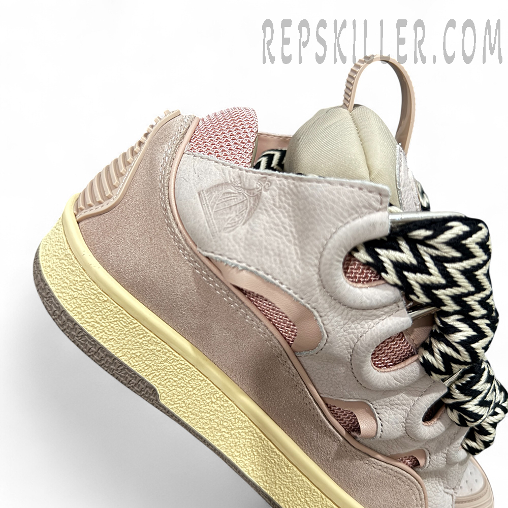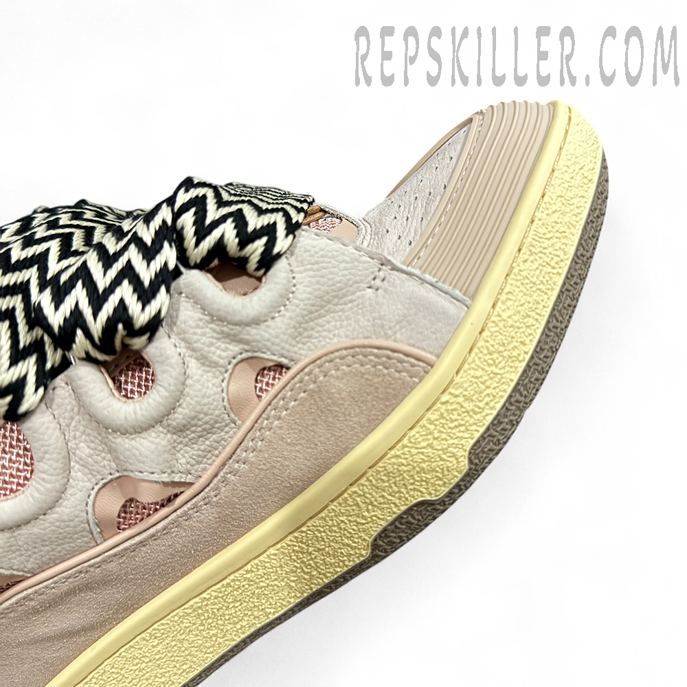 The Lanvin Curb Sneakers ‘Beige Pink’ deliver a striking fusion of skate-inspired boldness and luxury craftsmanship. The upper combines premium nappa leather, suede, and breathable mesh, defined by curvy overlays and intricate paneling. Signature oversized zig-zag woven laces dominate the aesthetic, while the vintage-effect yellowed midsole adds retro character. Finished with an embossed Lanvin logo on the heel and a robust rubber outsole, this pair offers street-ready comfort with high-fashion appeal.