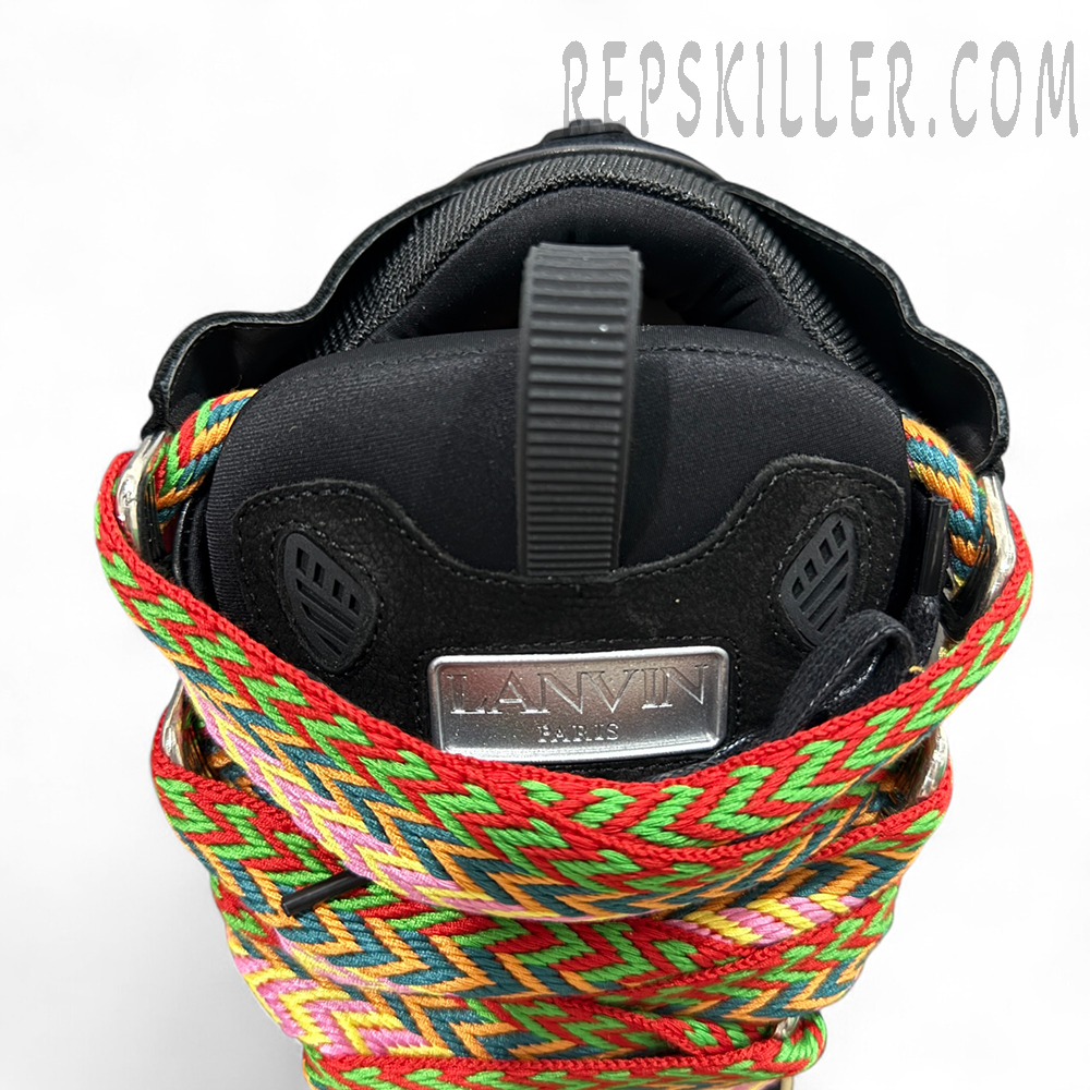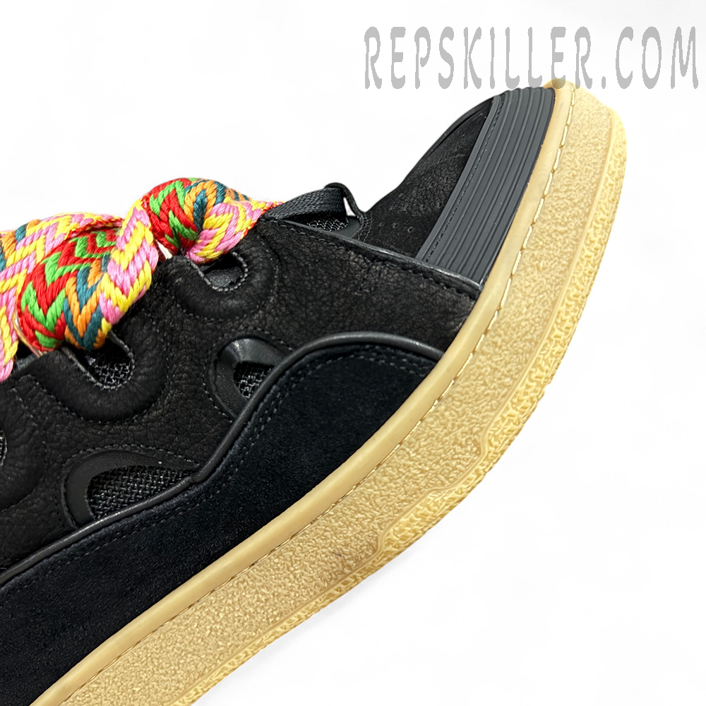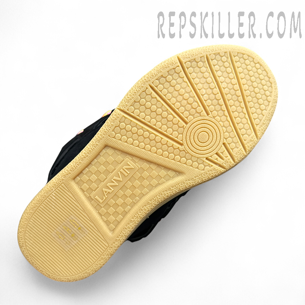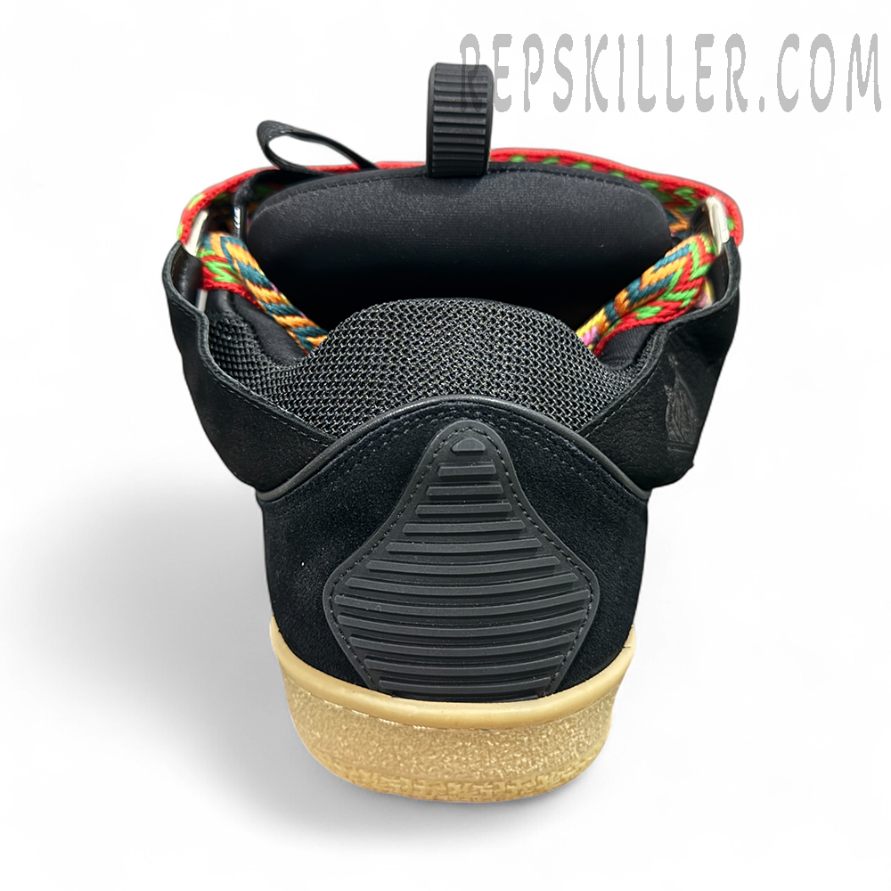 The Lanvin Curb Sneakers ‘Black Multicolor Laces’ blend luxurious materials with vibrant streetwear energy. This edition features an all-black upper crafted from premium suede, leather, and mesh, contrasted by the brand’s signature oversized flat laces in striking multicolor chevron patterns. The vintage-style gum sole enriches the retro-modern aesthetic, while the debossed Lanvin logo on the side panel and heel accentuates the brand’s craftsmanship. Designed for statement-makers, this pair balances bold design with comfort for standout everyday wear.