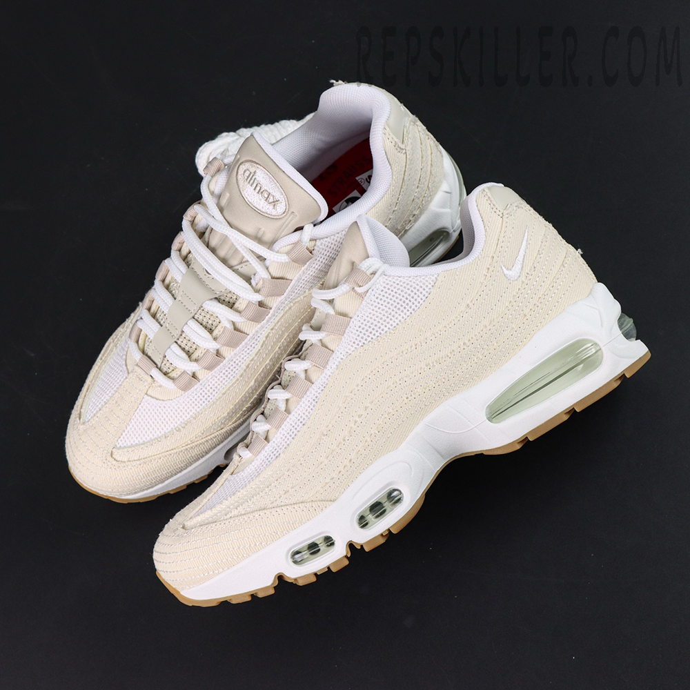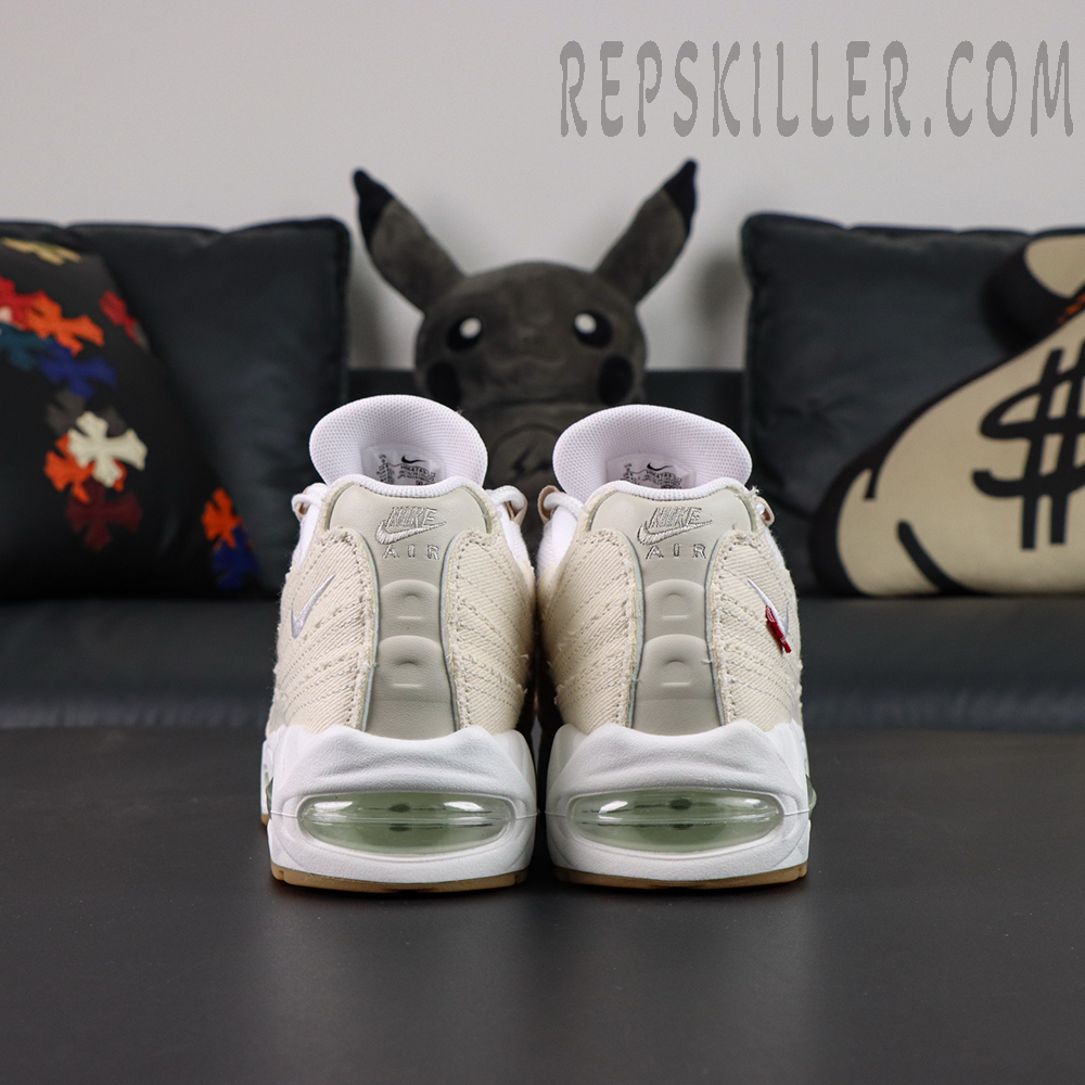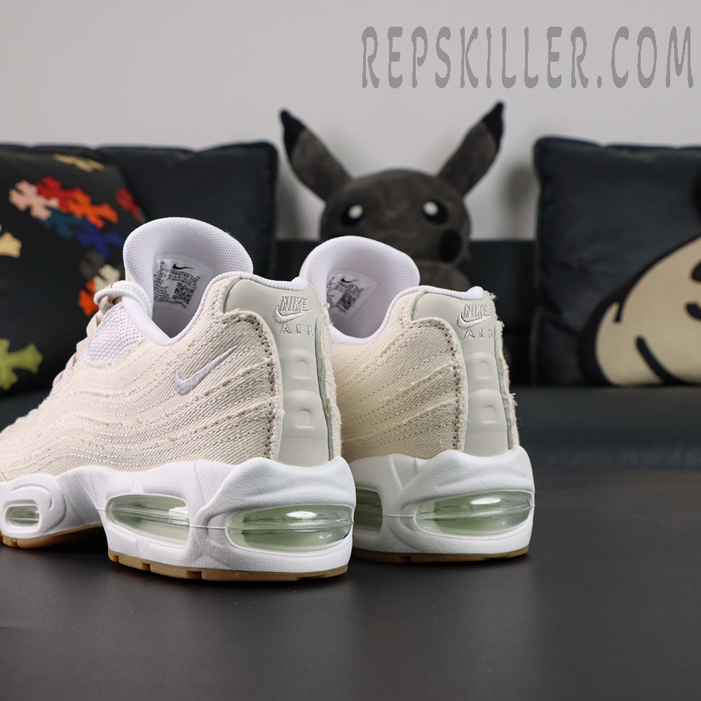 The upper is constructed from ivory-toned denim, featuring signature frayed edges that highlight Levi’s authentic workwear DNA. The Air Max 95’s signature wavy side panels remain intact, creating depth and texture while elevating the overall visual profile. Subtle branding details—including Air Max tongue branding, a mini embroidered Swoosh, and Levi’s classic red woven tag on the lateral heel—reinforce the premium identity that defines high-quality Levi’s reps and Nike Air Max reps.