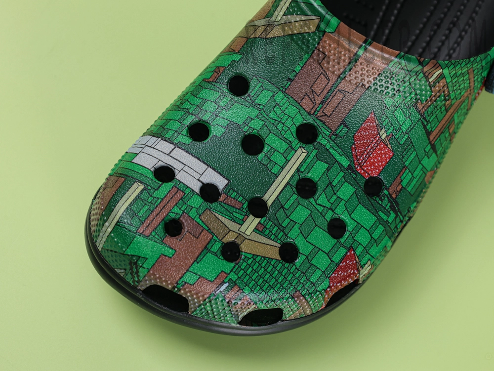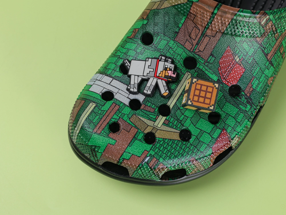 The Minecraft x Classic Clog ‘Dark Forest’ brings the mysterious in-game biome to life with a full-print design on a green Croslite™ foam upper. Ventilation ports boost airflow and help shed water, while the pivoting heel strap — detailed with Minecraft branding — ensures a secure, adjustable fit. This edition comes with exclusive Jibbitz™ charms, including a Creeper, iron pickaxe, wood block, and crafting table, making it both customizable and collectible for fans.