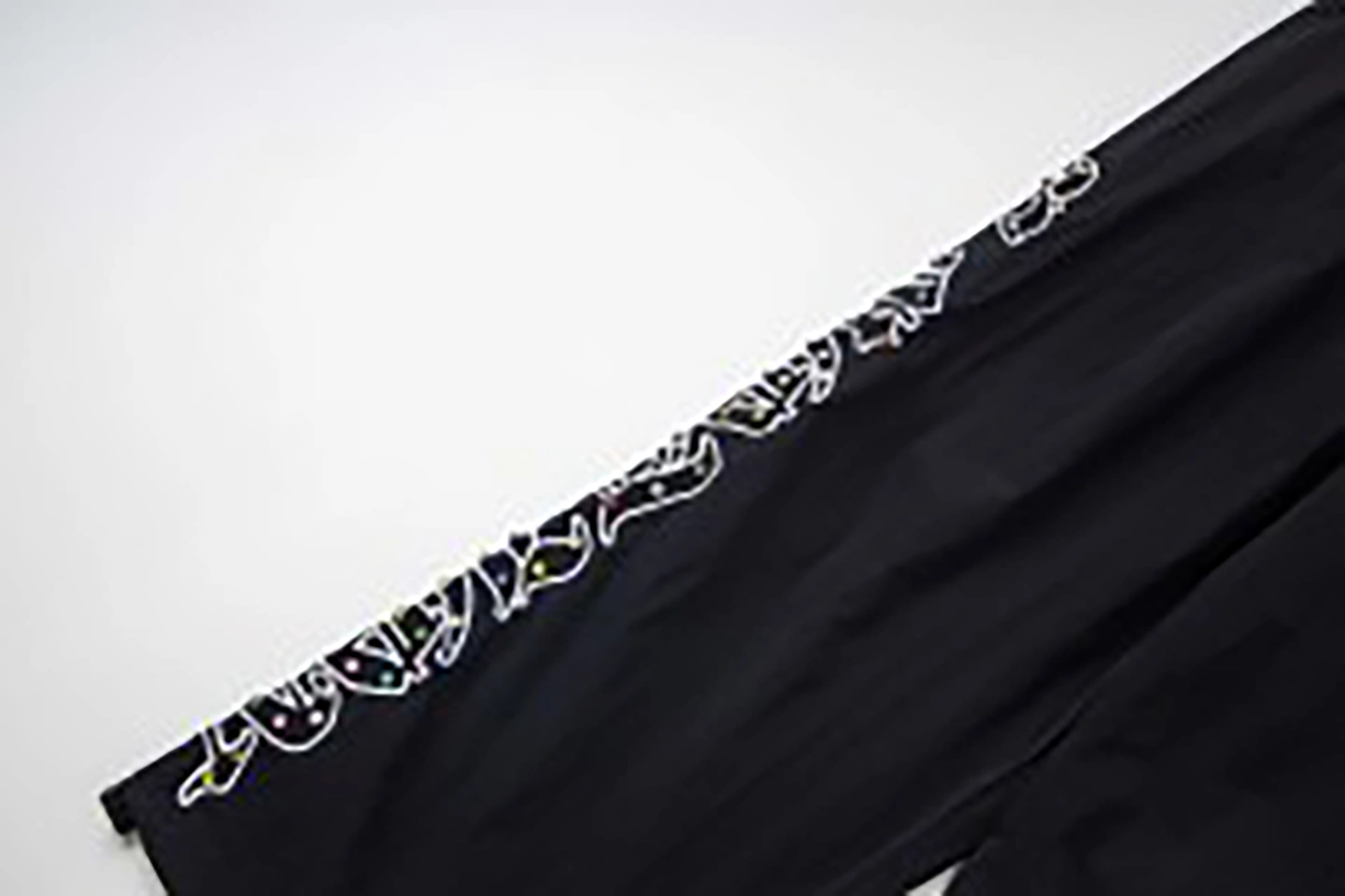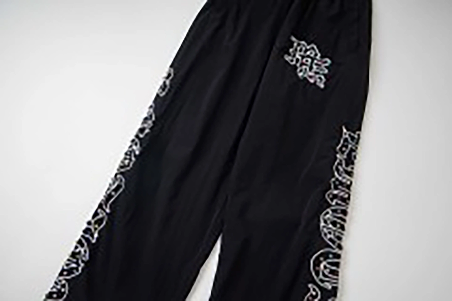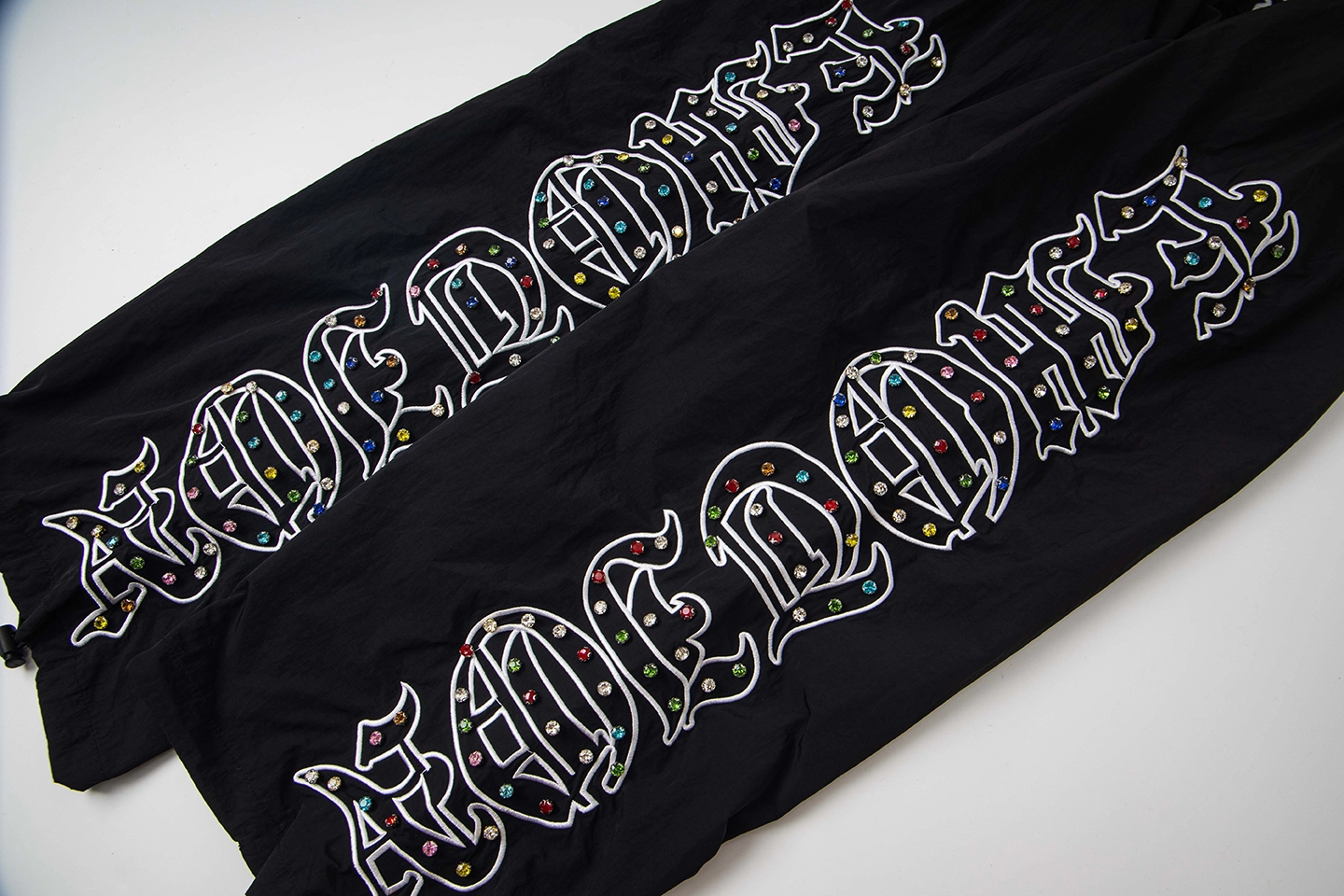 The Mixed Emotion Reflective Gothic Script Black Pants deliver a striking combination of gothic influence and urban energy. Bold reflective gothic-style lettering runs down both legs, flanked by an intricate “ME” monogram near the waist. The blacked-out base allows the holographic outlines and dot textures within the fonts to glow under light. Finished with toggle-adjustable hems and an elastic waistband, this piece blends comfort with raw visual power.