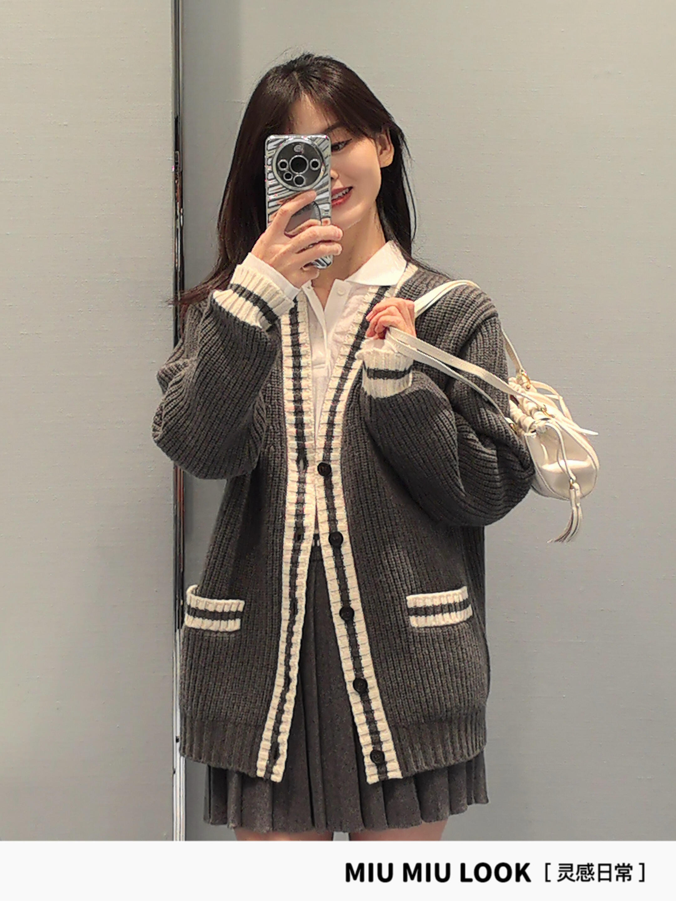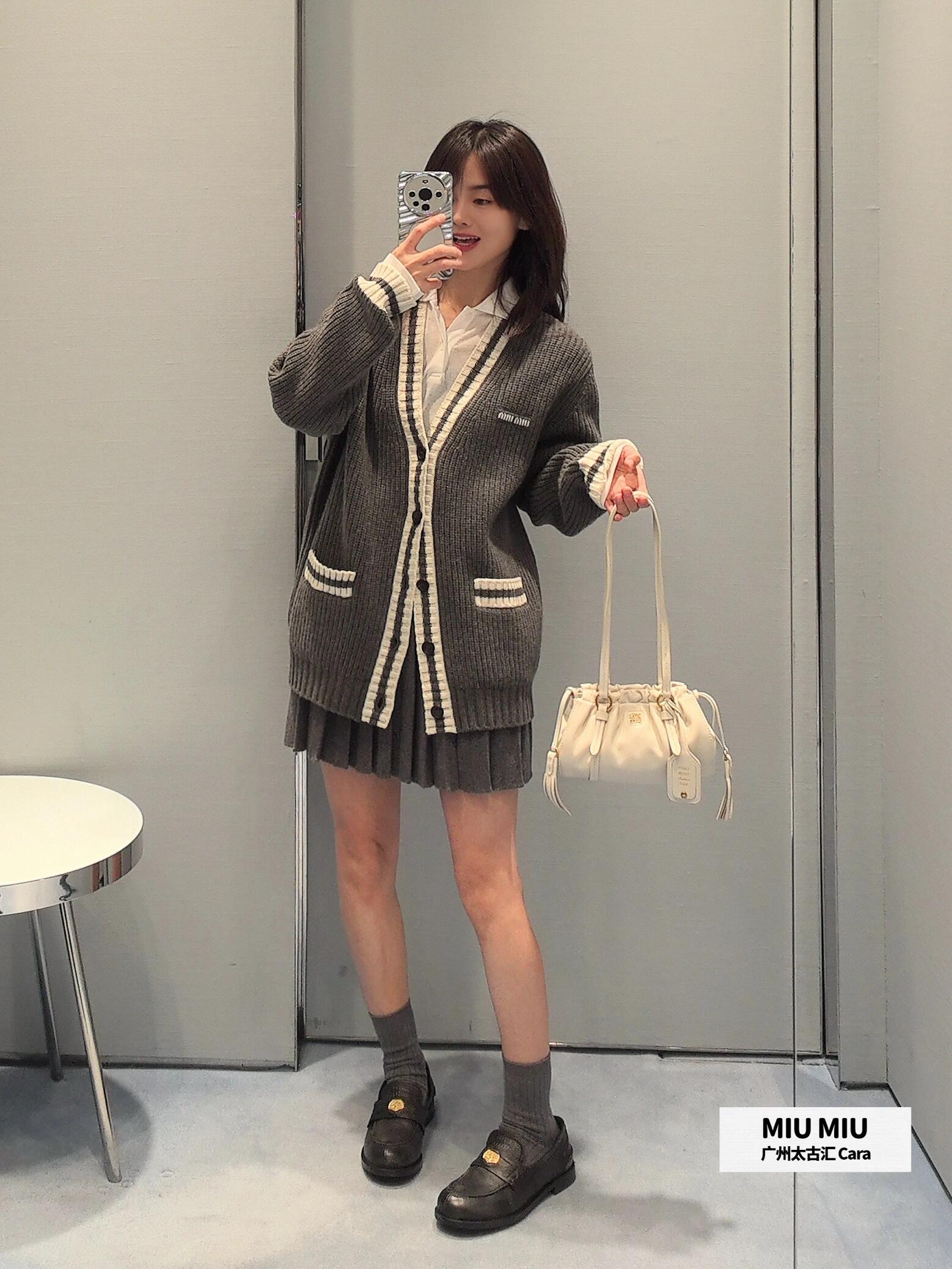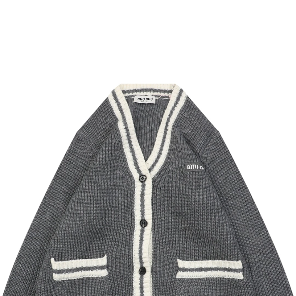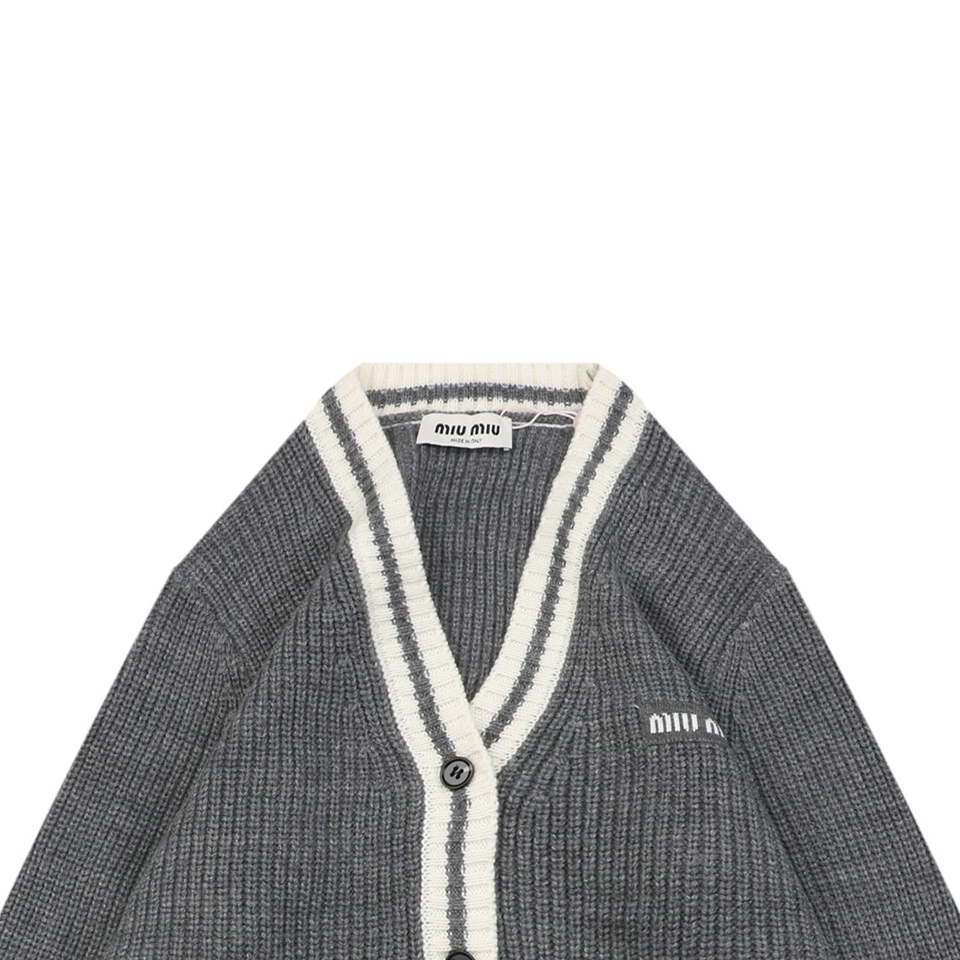 The MM Grey/White Logo Trim Cardigan showcases a retro collegiate vibe with its contrast ribbed trims and classic V-neckline. Crafted from a soft and dense knit, the piece features front patch pockets and a subtle MM logo embroidery on the chest, delivering understated brand elegance. Button-up closure and cozy texture make it ideal for layering across seasons.