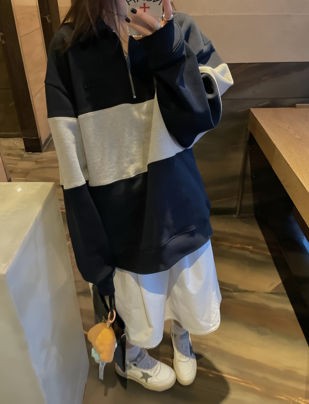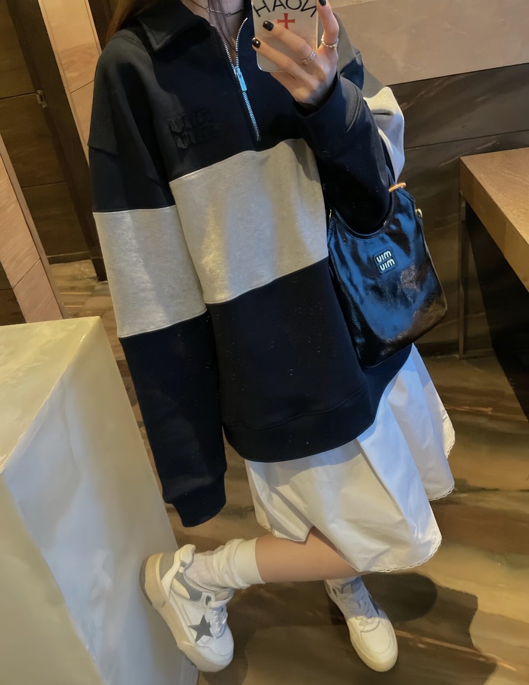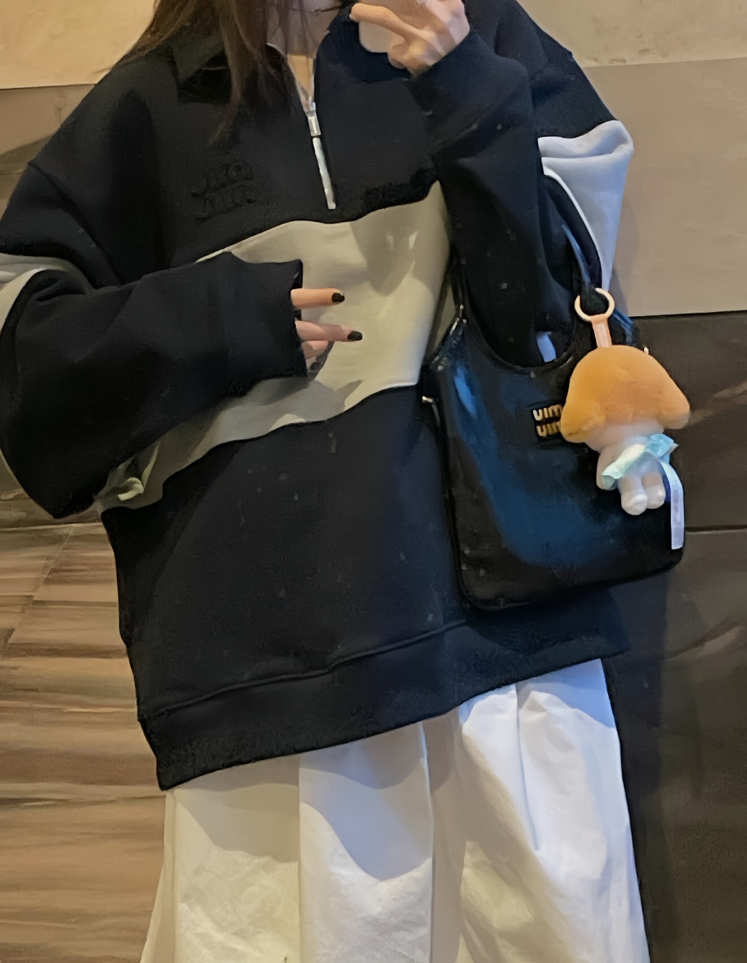 This MM Patch Logo Half-Zip Colorblock Sweatshirt combines minimalist streetwear charm with classic athletic aesthetics. Featuring a tri-tone colorblock pattern in navy and light grey, it’s detailed with a subtle MM tonal patch on the chest and a sleek half-zip design. Crafted from soft cotton-blend fleece, this piece offers both structure and comfort—ideal for layering or standalone wear. The ribbed cuffs and hem complete the silhouette with a snug, finished edge.
