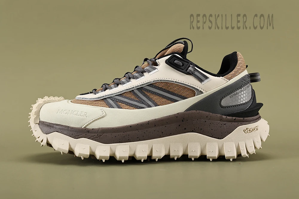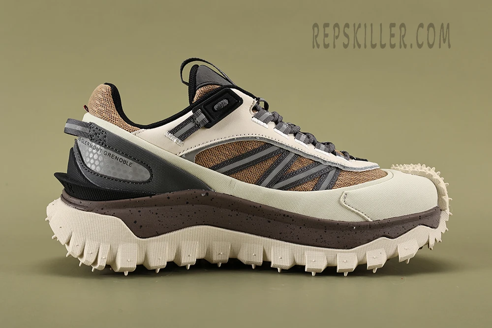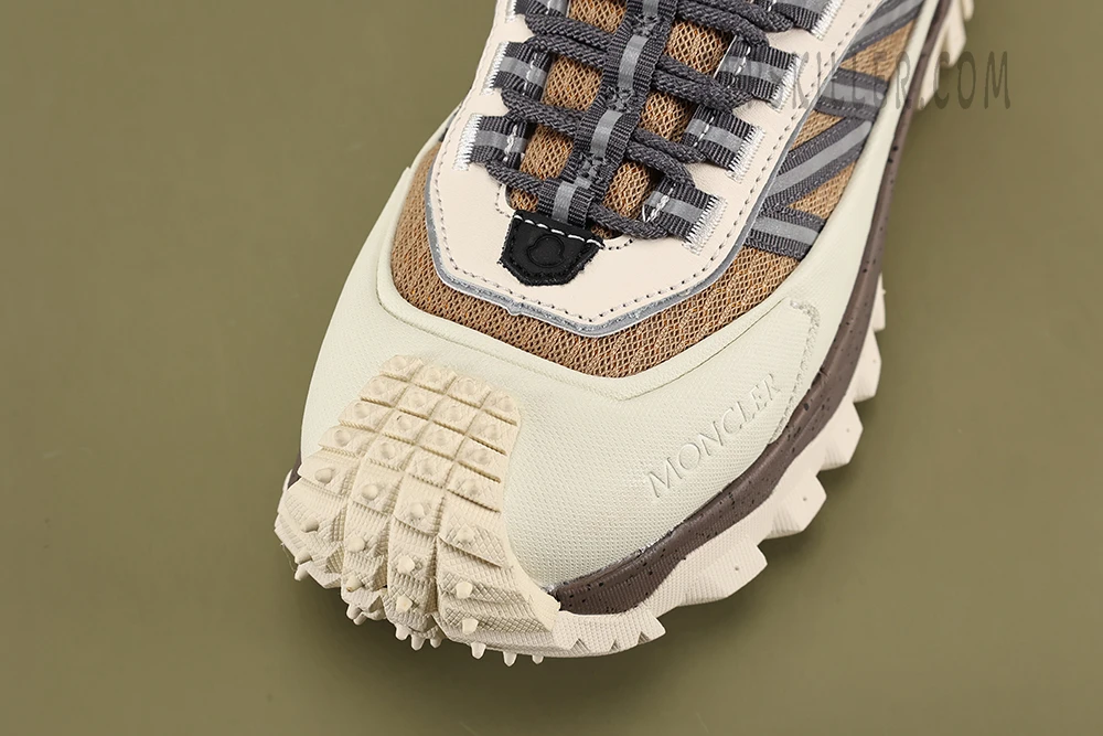 The Mxxcler Trailgrip showcases an exquisite Beige White colorway that effortlessly blends into both urban and natural landscapes. Its sophisticated palette features subtle beige tones complemented by pristine white accents, making it versatile for any setting, whether you’re navigating city streets or rugged trails. The sleek design is highlighted by Moncler’s signature logo, which adds a touch of luxury to the robust exterior.