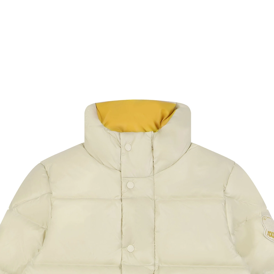 A high stand collar and elasticated cuffs enhance wind resistance and thermal performance, while the dual front closure—combining a zipper with snap buttons—provides flexibility and ease of wear. The chest is detailed with a subtle black flocked logo alongside a white embroidered circular badge, adding refined brand recognition without overpowering the minimalist design.