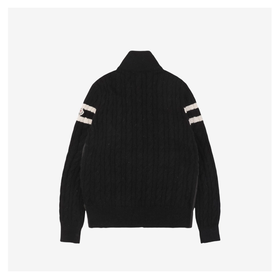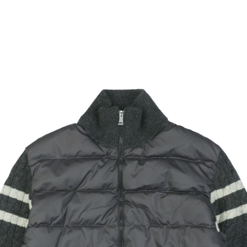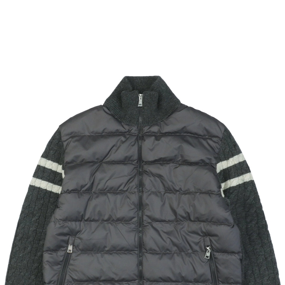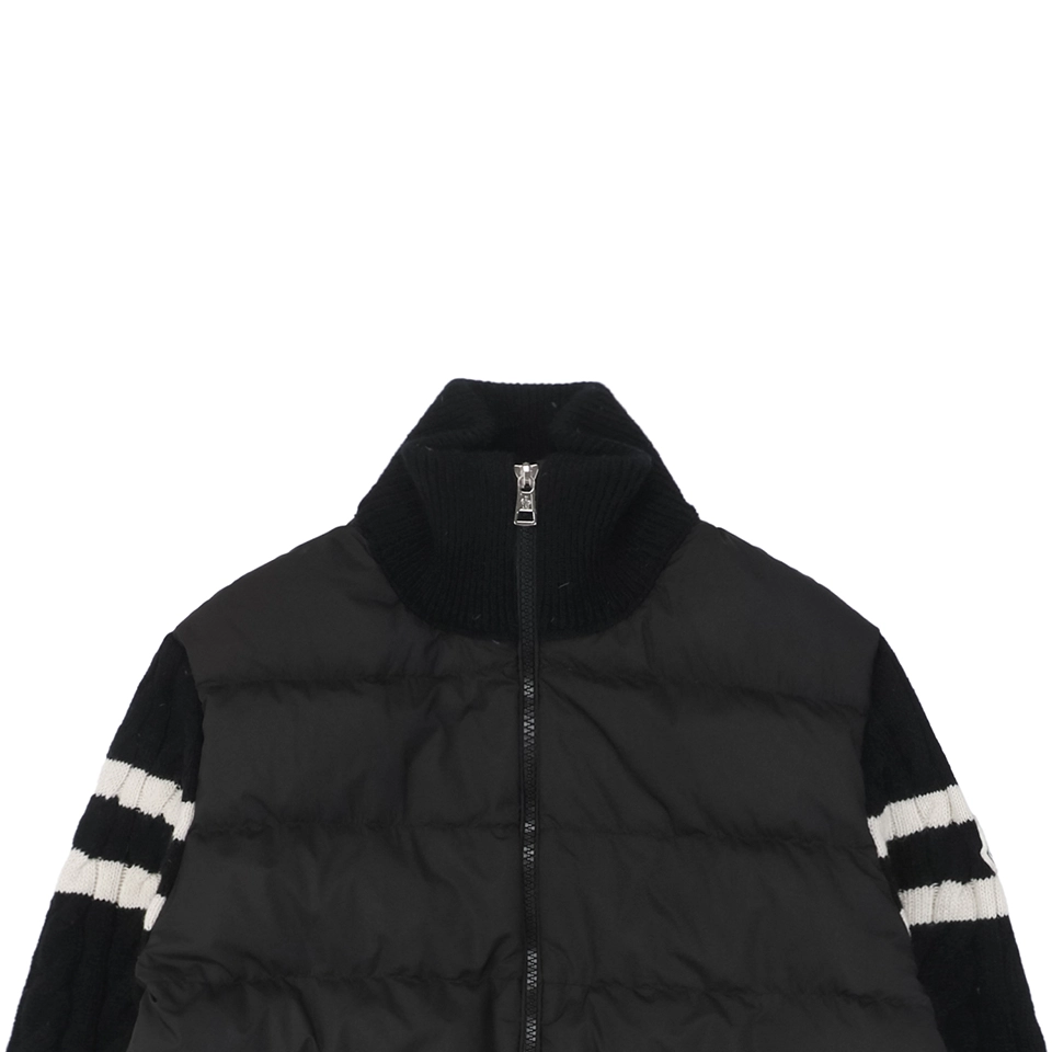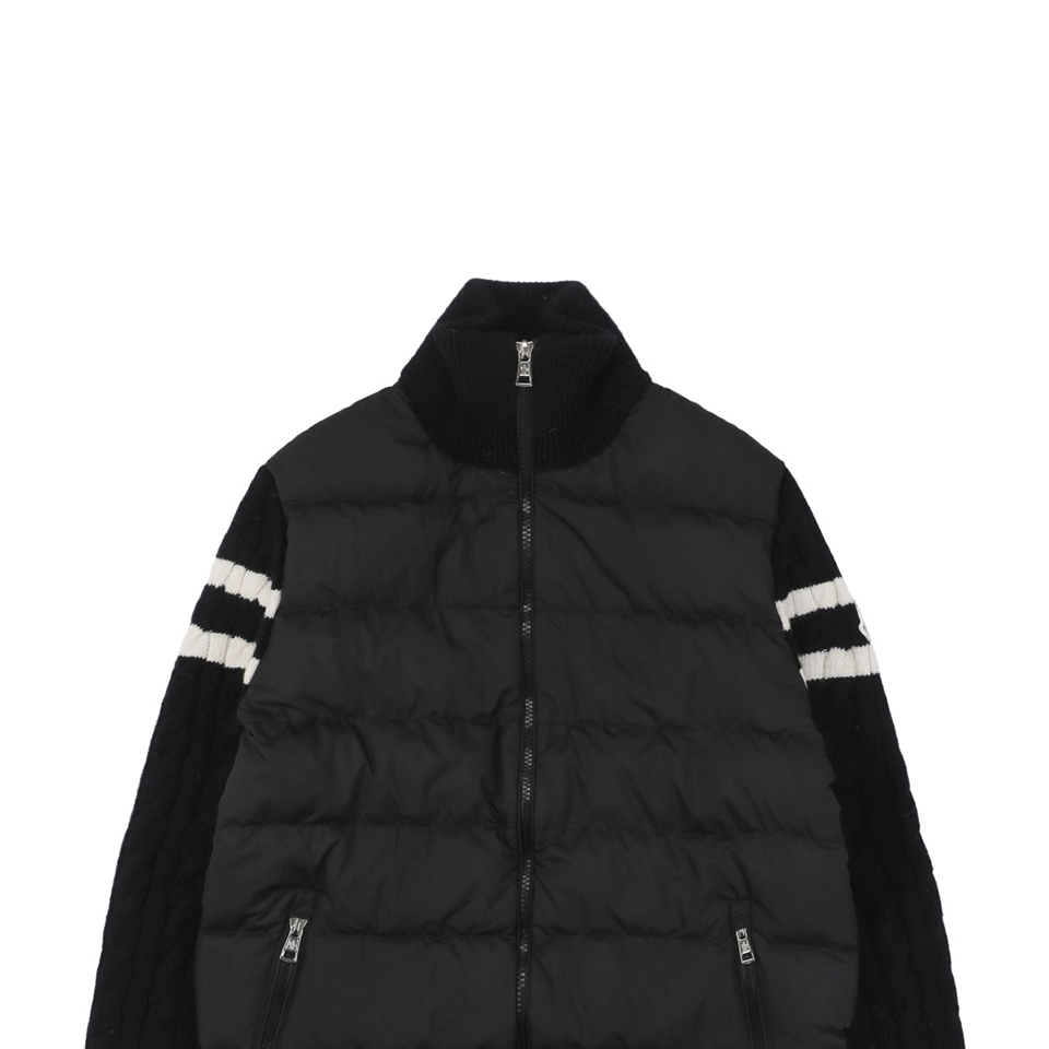 The Mxxcler Double-Stripe Sleeve Panel Down Jacket is a refined fusion of sports-inspired knitwear and high-performance down insulation. Featuring a quilted nylon front for warmth and contrast cable-knit sleeves in wool blend, this hybrid design delivers the comfort of a sweater with the functionality of outerwear. Signature double-stripe intarsia detailing on the sleeves and the Mxxcler logo patch on the arm add a distinctive finishing touch. Whether worn solo or layered, this piece is ideal for transitional weather or urban winter styling.