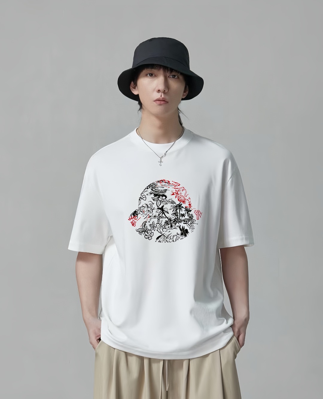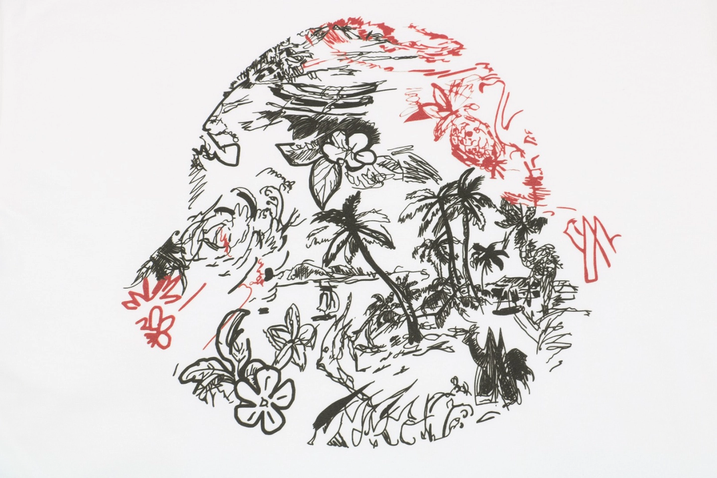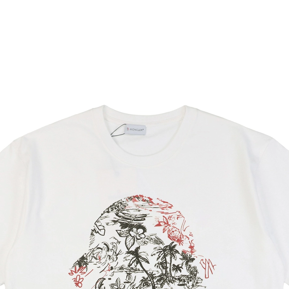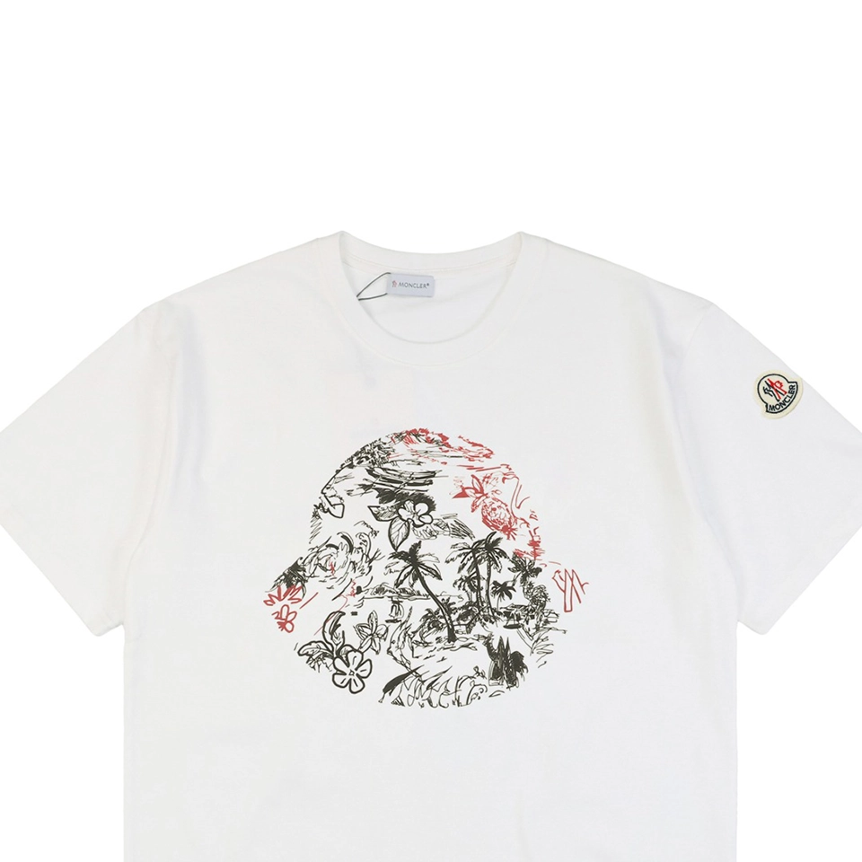 The Mxxcler Jungle Botanical Logo T-Shirt blends refined craftsmanship with an artistic twist. Made from premium white cotton, it features a relaxed fit with a classic crew neck. The front showcases a large circular graphic filled with jungle-inspired botanical sketches in black and red, bringing a hand-drawn aesthetic. The sleeve is adorned with the iconic Mxxcler patch, adding a signature finish to this expressive piece.