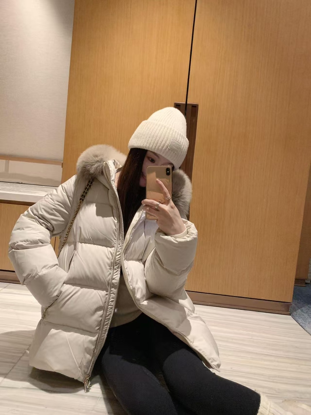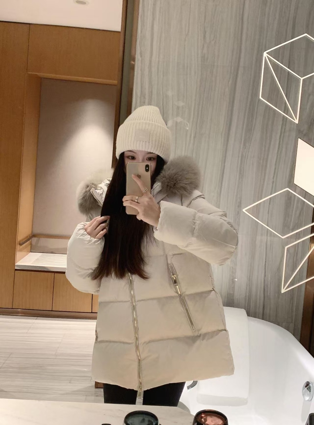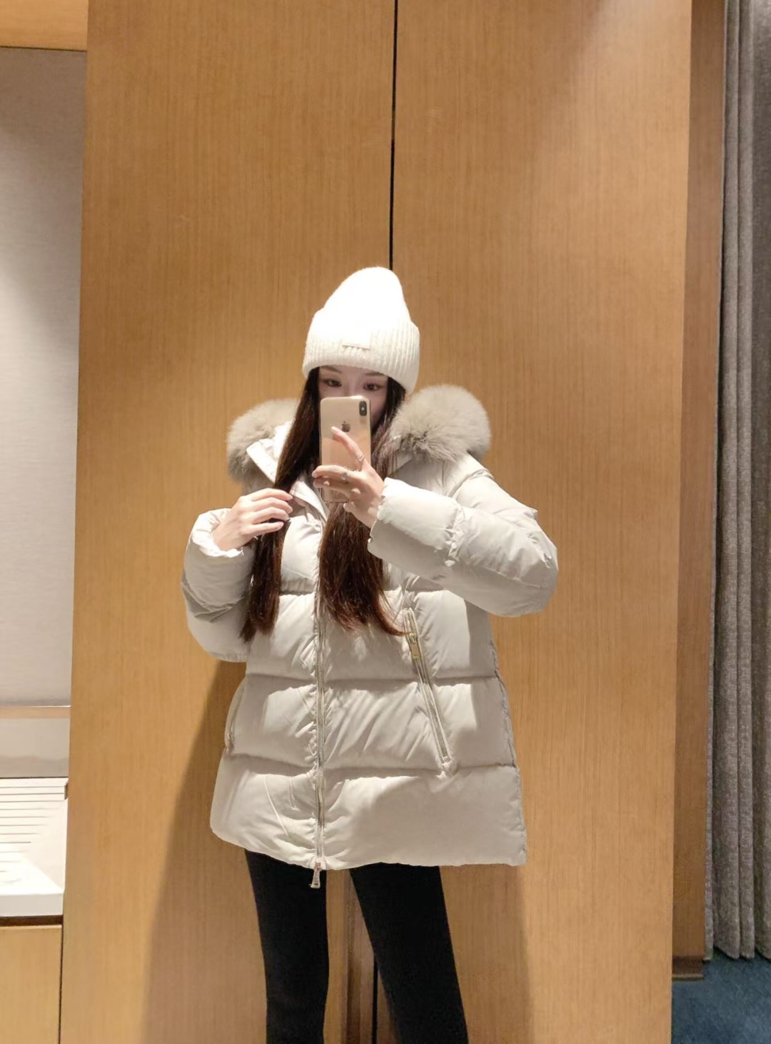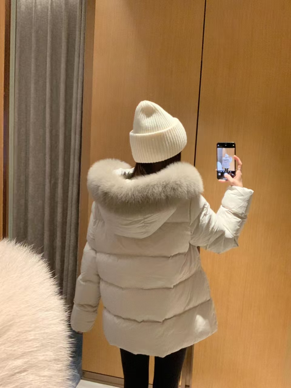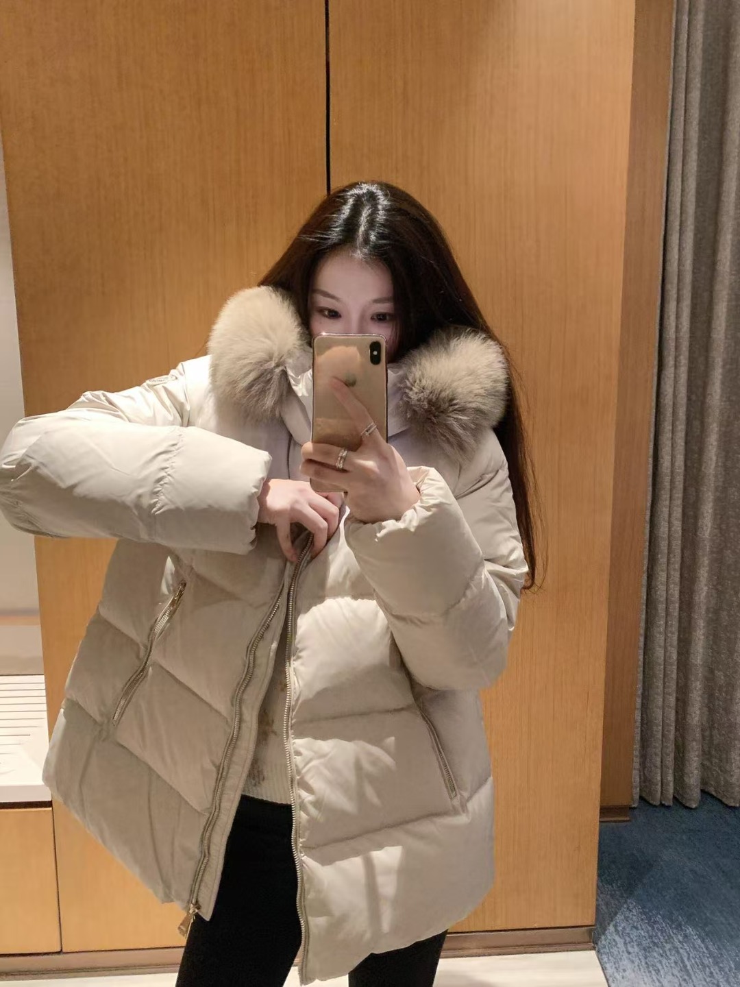 A standout detail is the detachable hood trim, made from imported fox fur that elevates the jacket’s visual richness while offering flexible styling options. Cut in a relaxed mid-length A-line silhouette, the design flatters the body with a gentle, feminine drape while maintaining all-day comfort. Functional zip pockets and a smooth front zip closure further enhance practicality, making it an ideal winter essential for daily wear, travel, and urban outdoor settings.