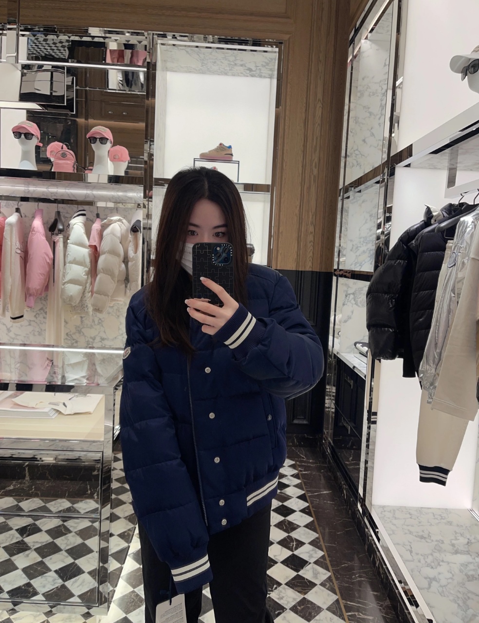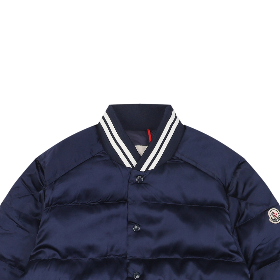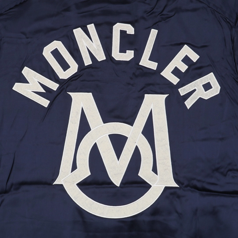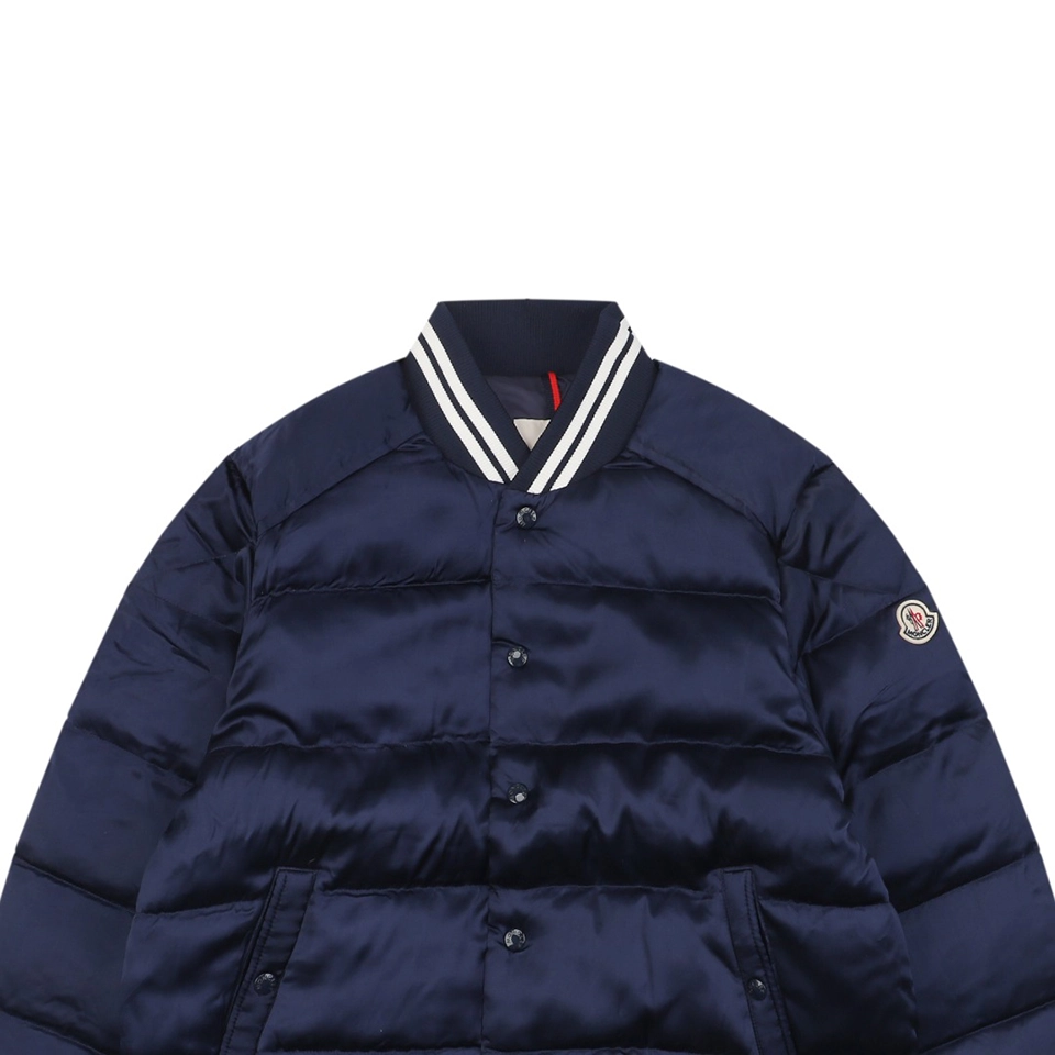 The Mxxcler Navy Logo Down Jacket brings varsity charm and cold-weather function into one elevated piece. Crafted from lustrous navy fabric with a quilted puffer construction, it features a bold oversized M and Mxxcler lettering embroidered across the back. Striped ribbed cuffs and hem echo collegiate influences, while the front snap-button closure adds ease of wear. Designed for style and insulation, this jacket balances warmth with signature flair.