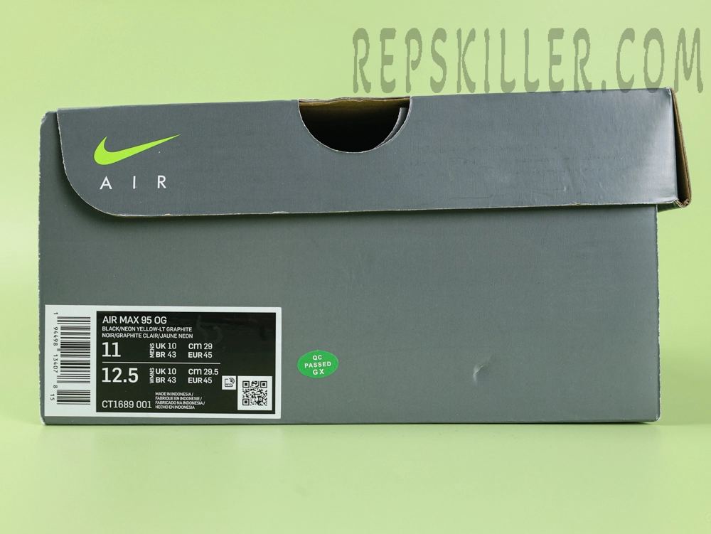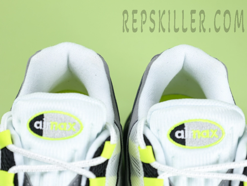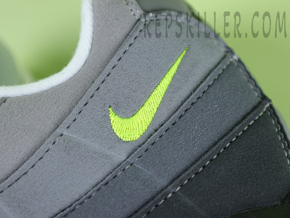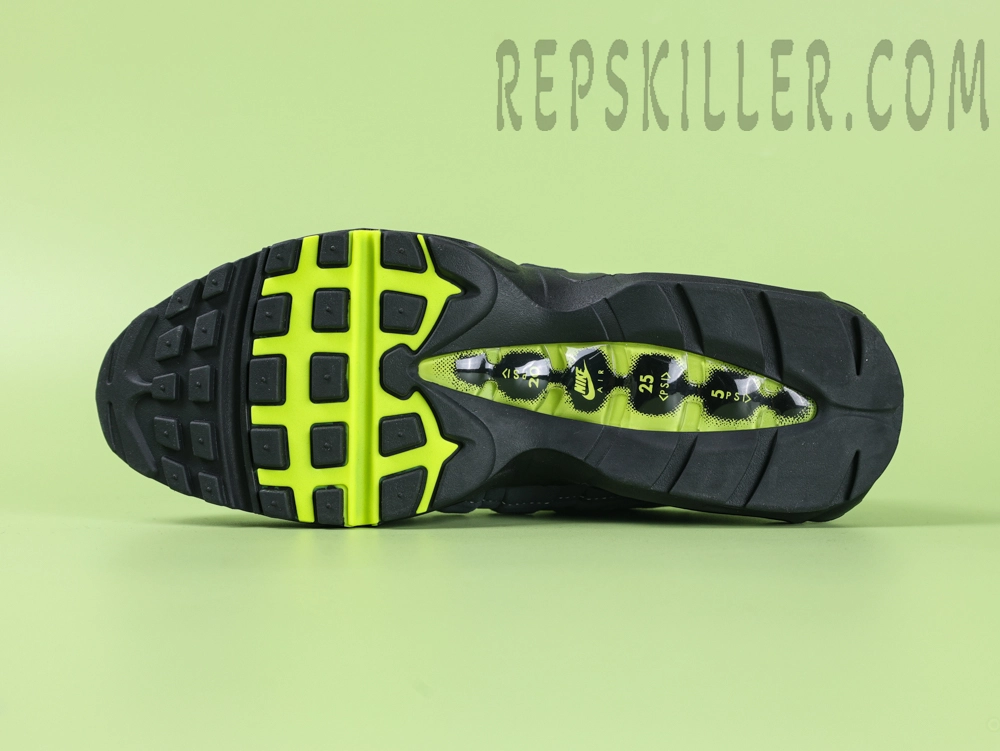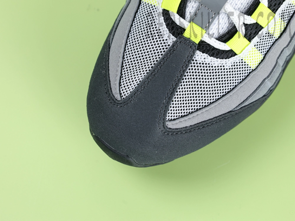 The Nike Air Max 95 OG ‘Neon’ is a faithful reissue of the iconic 1995 model, drawing inspiration from human anatomy. The upper features layered gradients of grey suede, mimicking muscle fibers, accented by vibrant neon green details for a striking visual contrast. Neon green highlights appear on the mini Swoosh logo at the ankle, lace loops, and the visible Air Max cushioning units, enhancing the shoe’s distinctive look. Reflective elements on the tongue and heel improve visibility in low-light conditions.