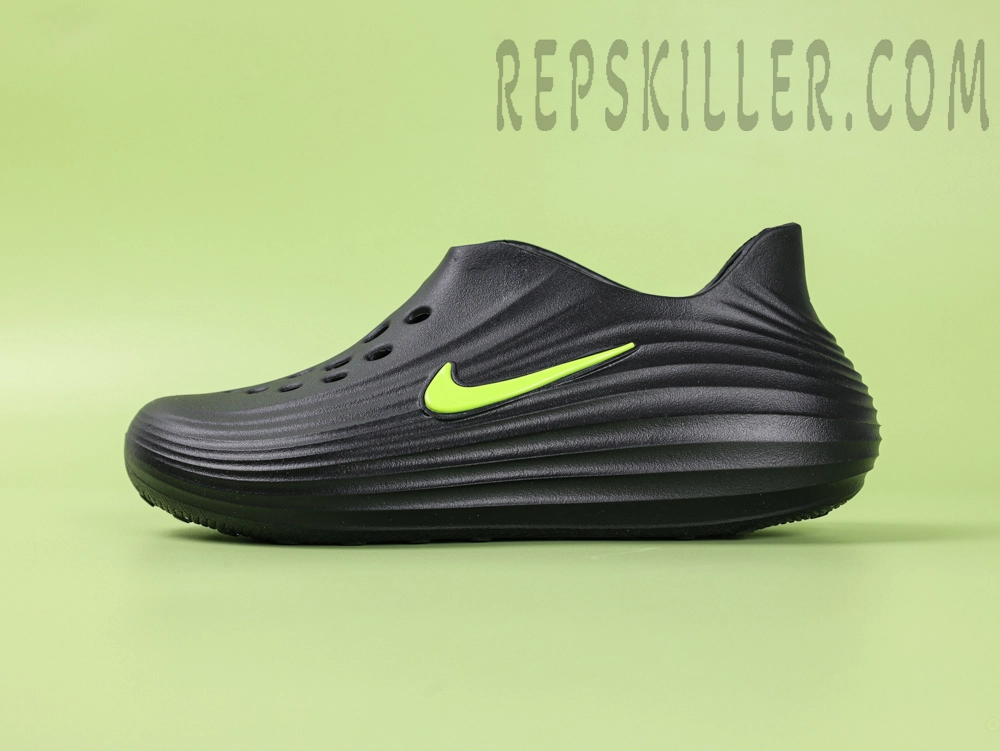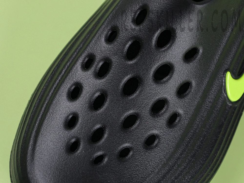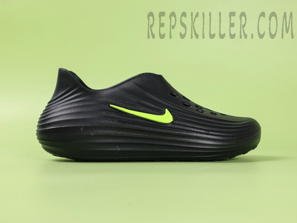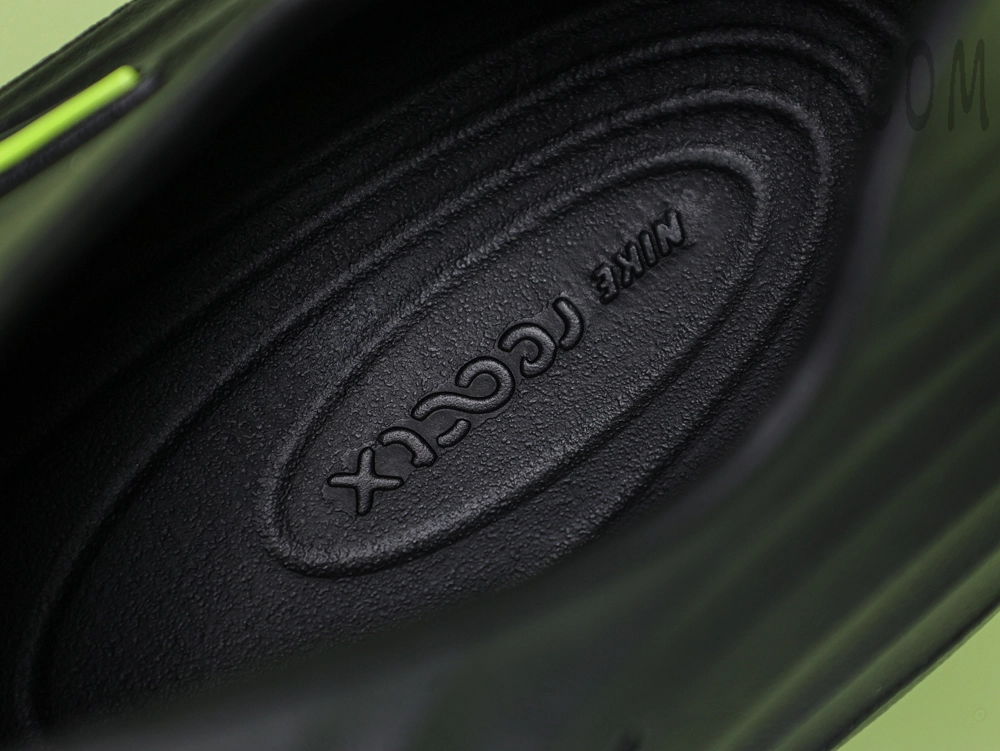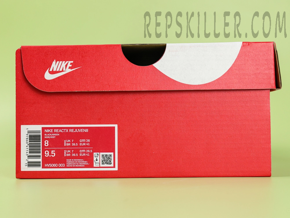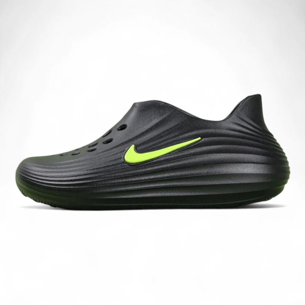 The Nike ReactX Rejuven8 “Black Volt” combines futuristic design with practical functionality. Its black upper contrasts sharply with the vibrant Volt green Swoosh, creating a bold visual statement. The one-piece ReactX foam construction offers soft and responsive cushioning, while ventilation holes enhance breathability. A sticky rubber outsole ensures reliable traction, and the widened forefoot accommodates various foot shapes for added comfort.