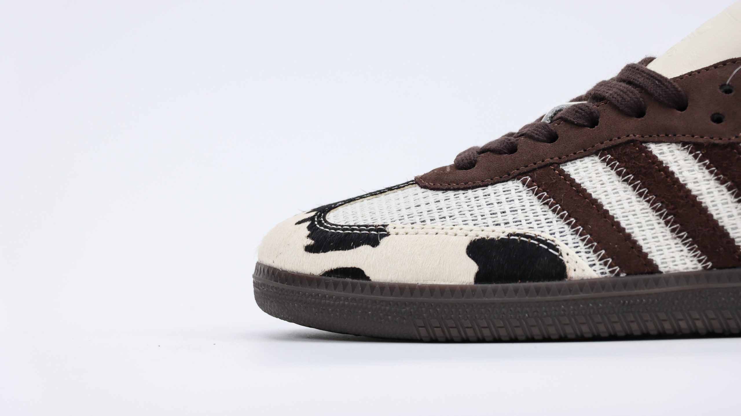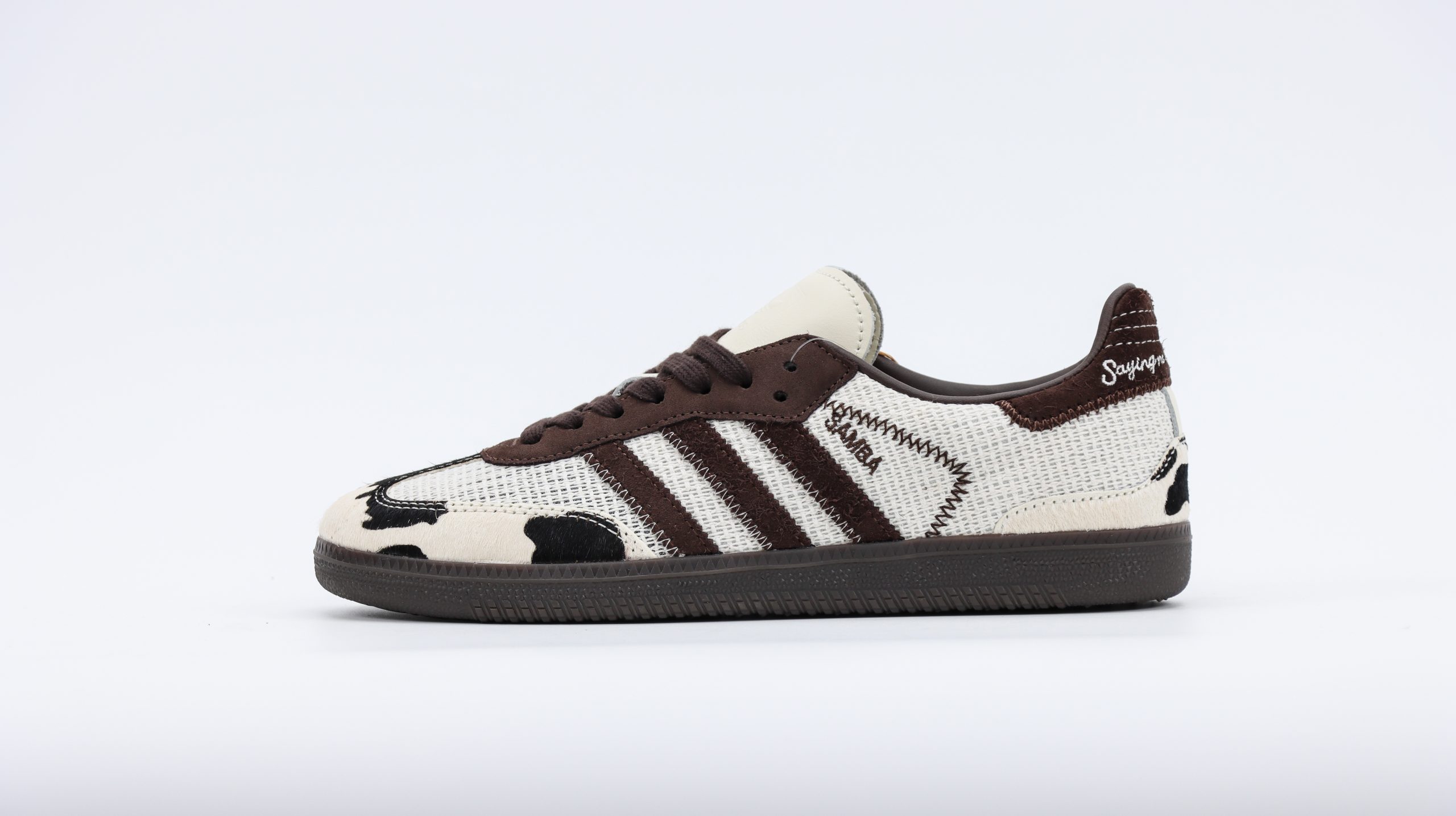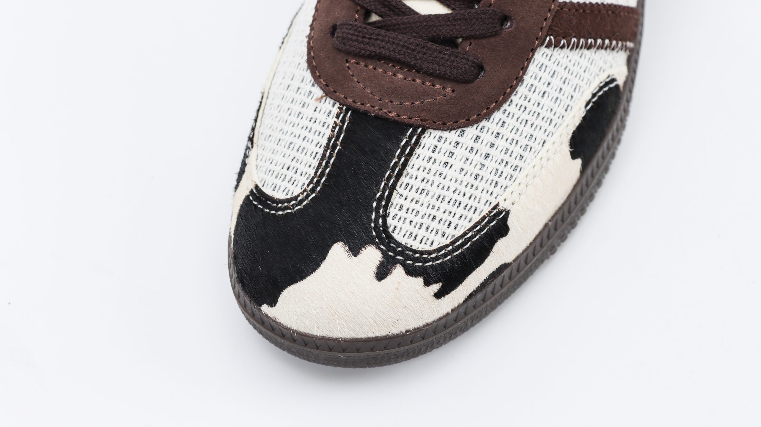 The cow print is complemented by classic Samba details such as the T-toe overlay and the three stripes, both rendered in smooth black leather which contrasts sharply against the playful background. This juxtaposition of the bold print with the iconic Samba elements preserves the shoe’s heritage while infusing it with a modern, eye-catching twist.