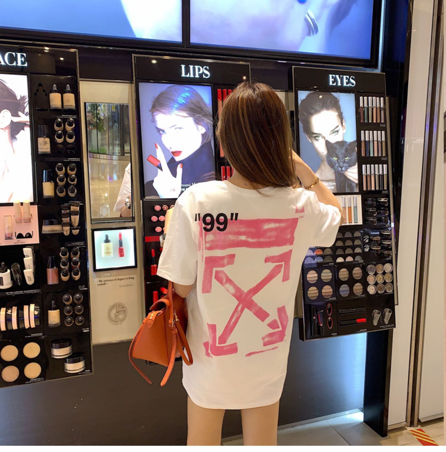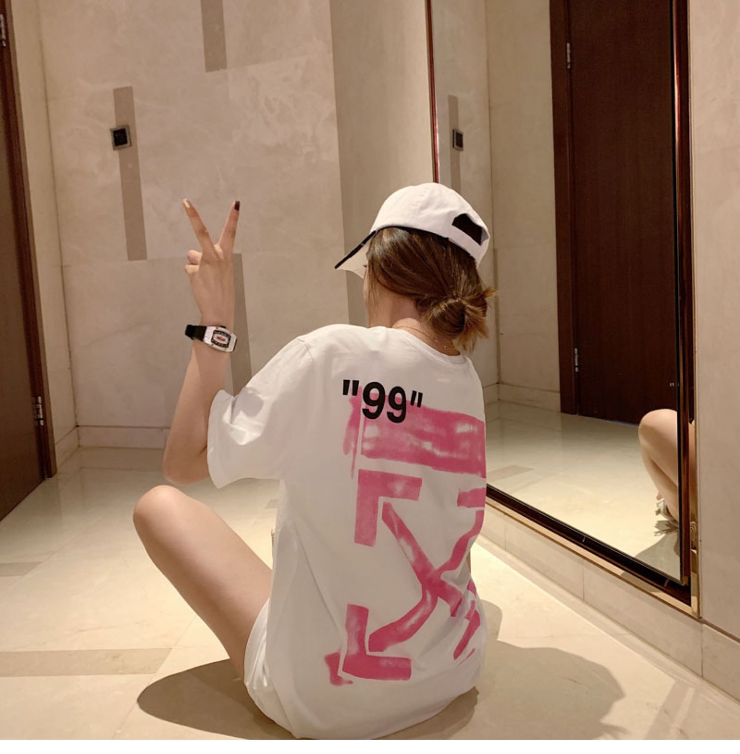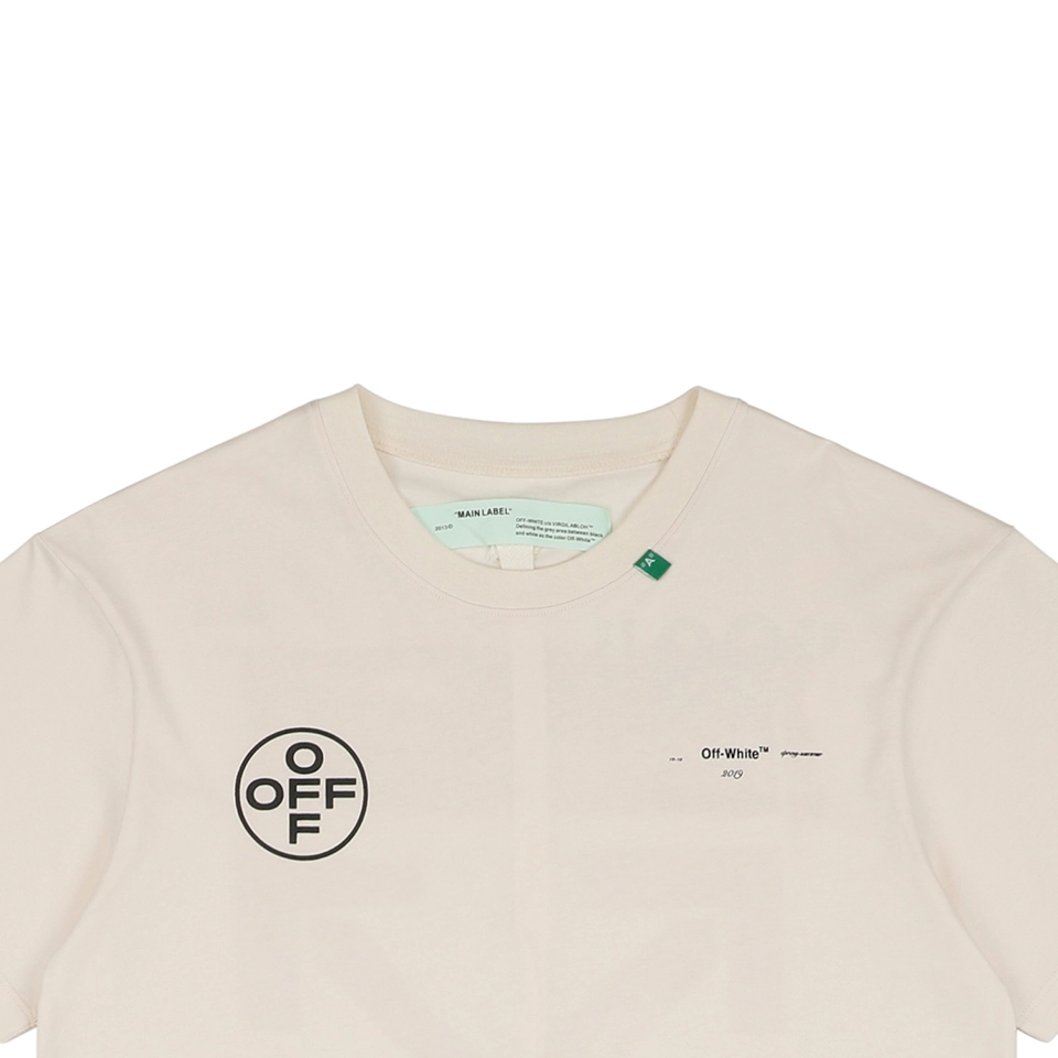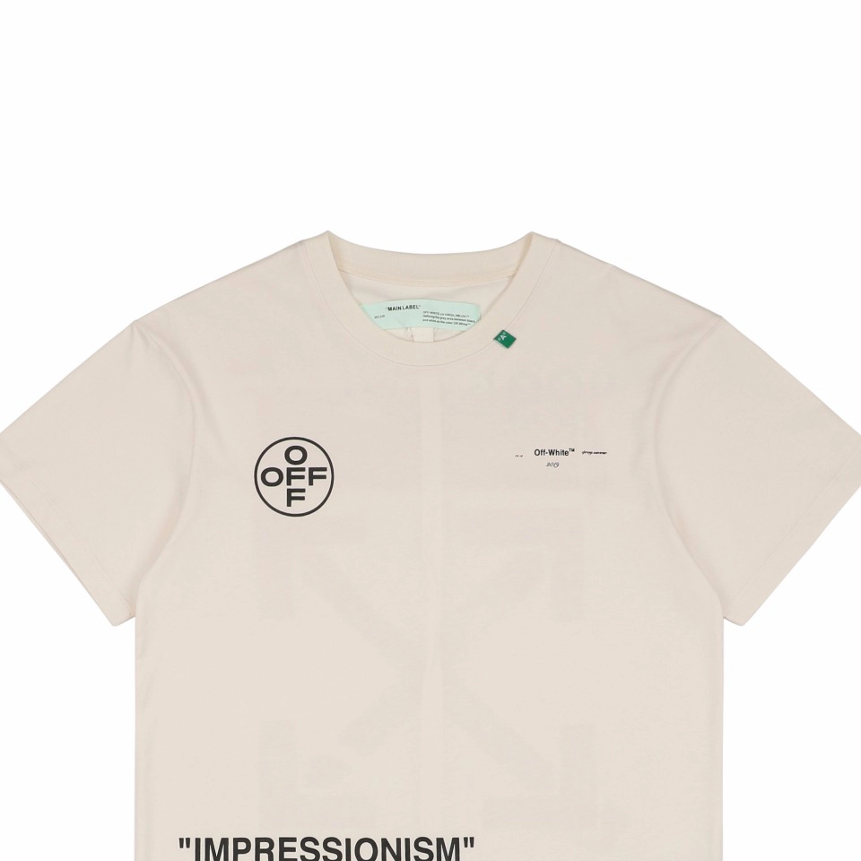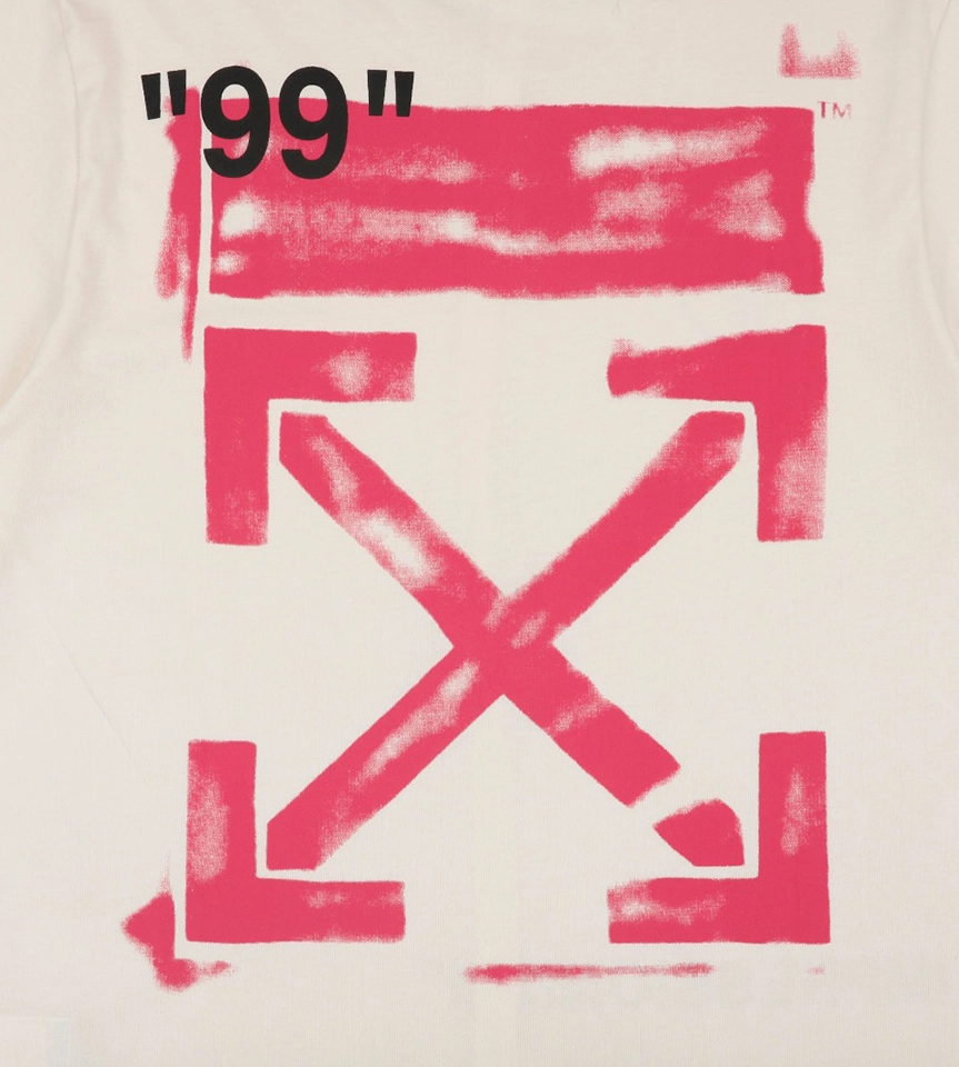 The OFF-WHITE “99” Arrow Graphic T-shirt combines high-concept aesthetics with bold streetwear attitude. Featuring a minimal ivory backdrop, the front showcases “IMPRESSIONISM” and OFF branding in black, while the back explodes with a spray-effect pink Arrow and “99” tag—signatures of Virgil Abloh’s design DNA. Crafted from soft cotton, this piece offers a structured, relaxed fit and speaks directly to the brand’s roots in contemporary urban art.