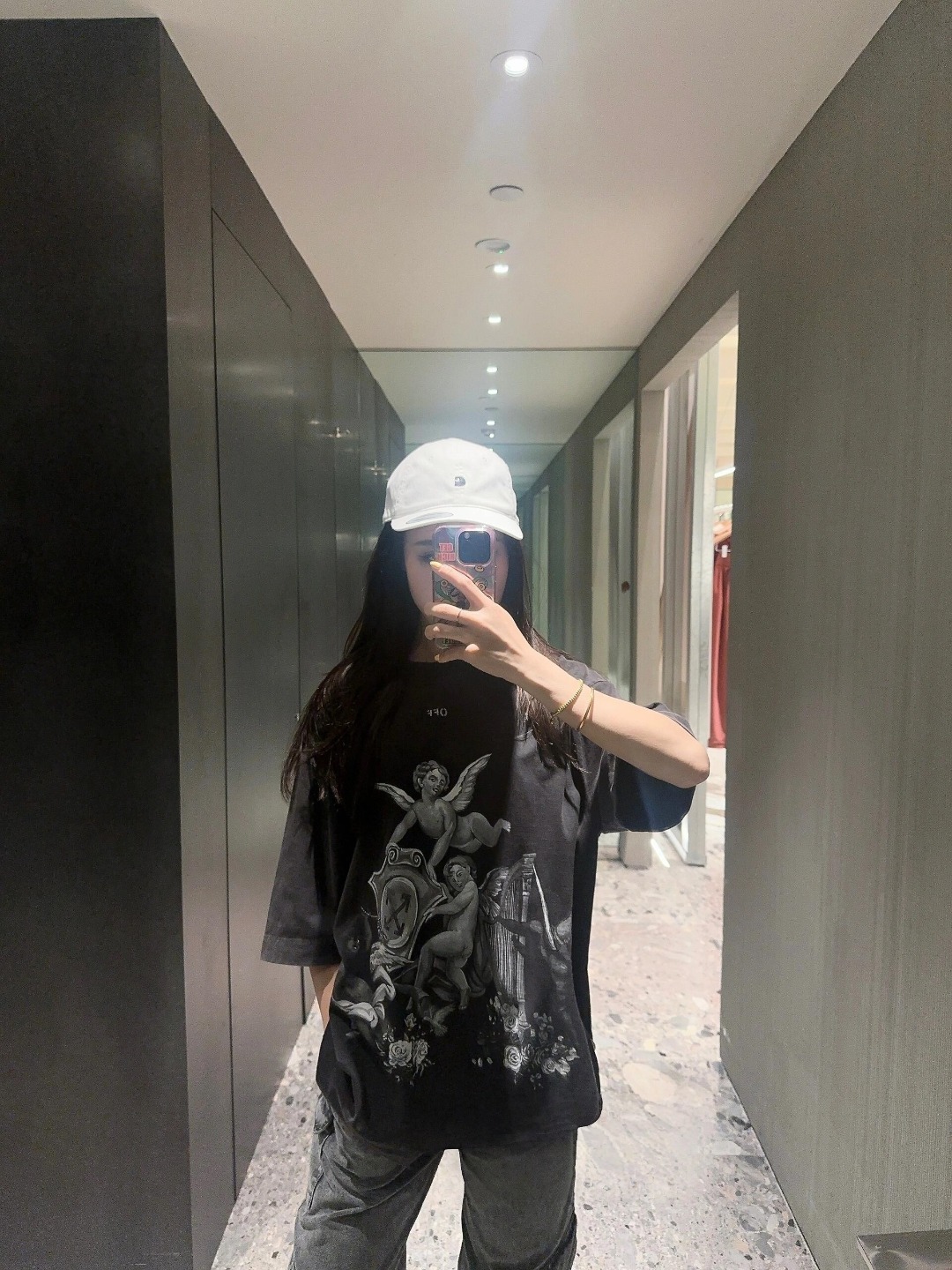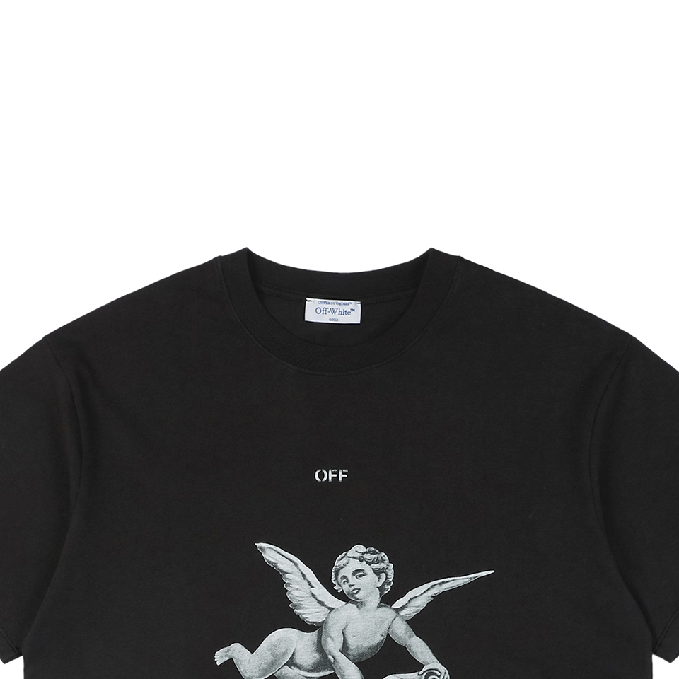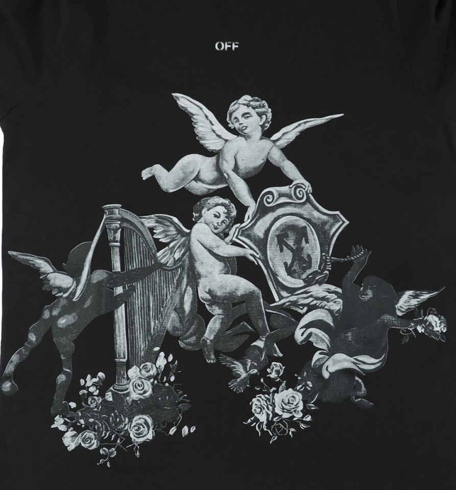 The OFF WHITE Angel with Harp Graphic T-Shirt blends spiritual iconography with urban streetwear sensibilities. A serene angel strumming a harp is center-printed across the chest, framed by washed textures that echo vintage religious art. Constructed from high-density cotton with a relaxed fit and drop-shoulder cut, this tee captures both tranquility and edge, creating a wearable canvas of celestial expression.