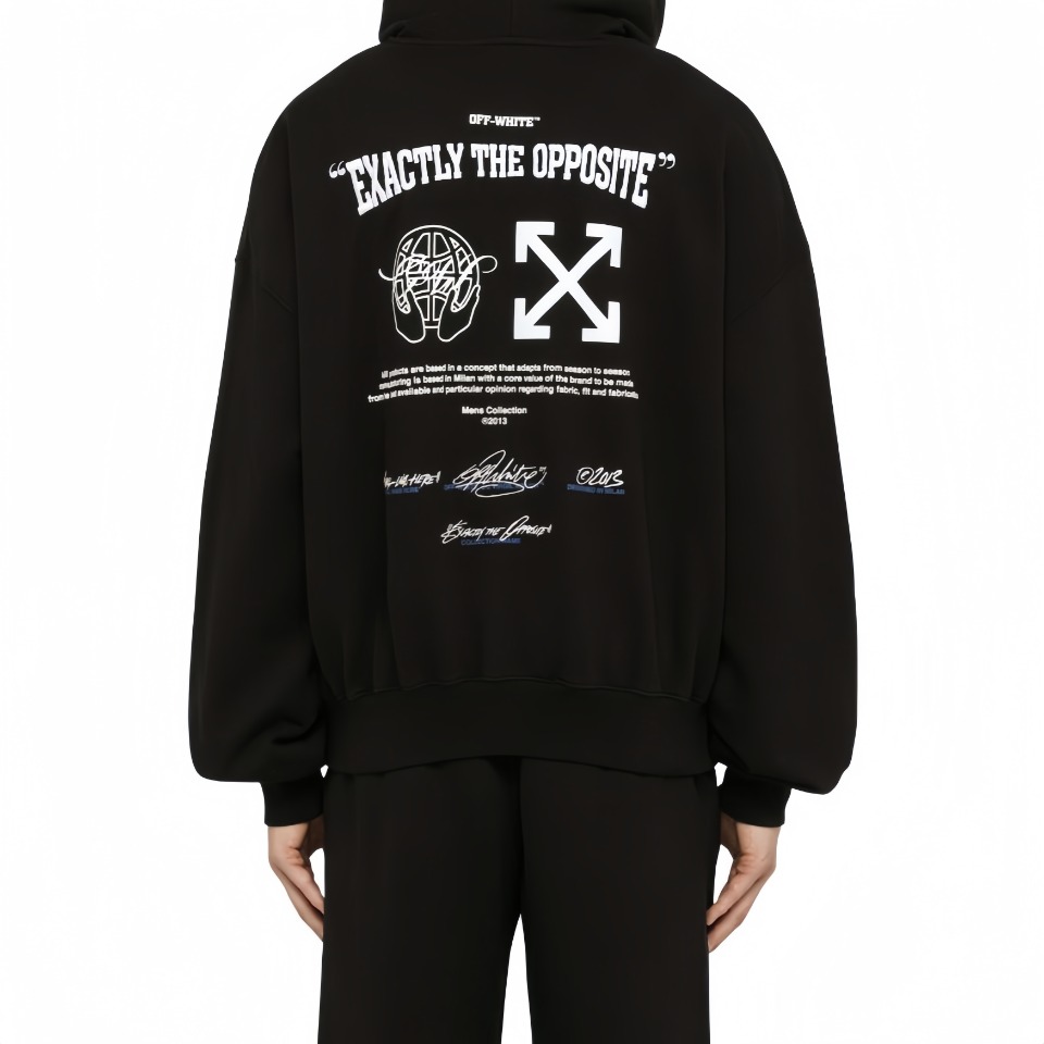 The Off-White Blue Arrow Earth Graphic Hoodie captures the brand’s signature visual storytelling with bold contrast. Featuring a clean front with a subtle “OFF” embroidery in blue and white, this piece surprises on the back with an expansive graphic that includes a globe sketch, arrows, and signature text elements. Crafted from soft fleece fabric, it’s designed for both comfort and statement-making style. The dropped shoulders and ribbed hems complete a relaxed silhouette perfect for streetwear layering.