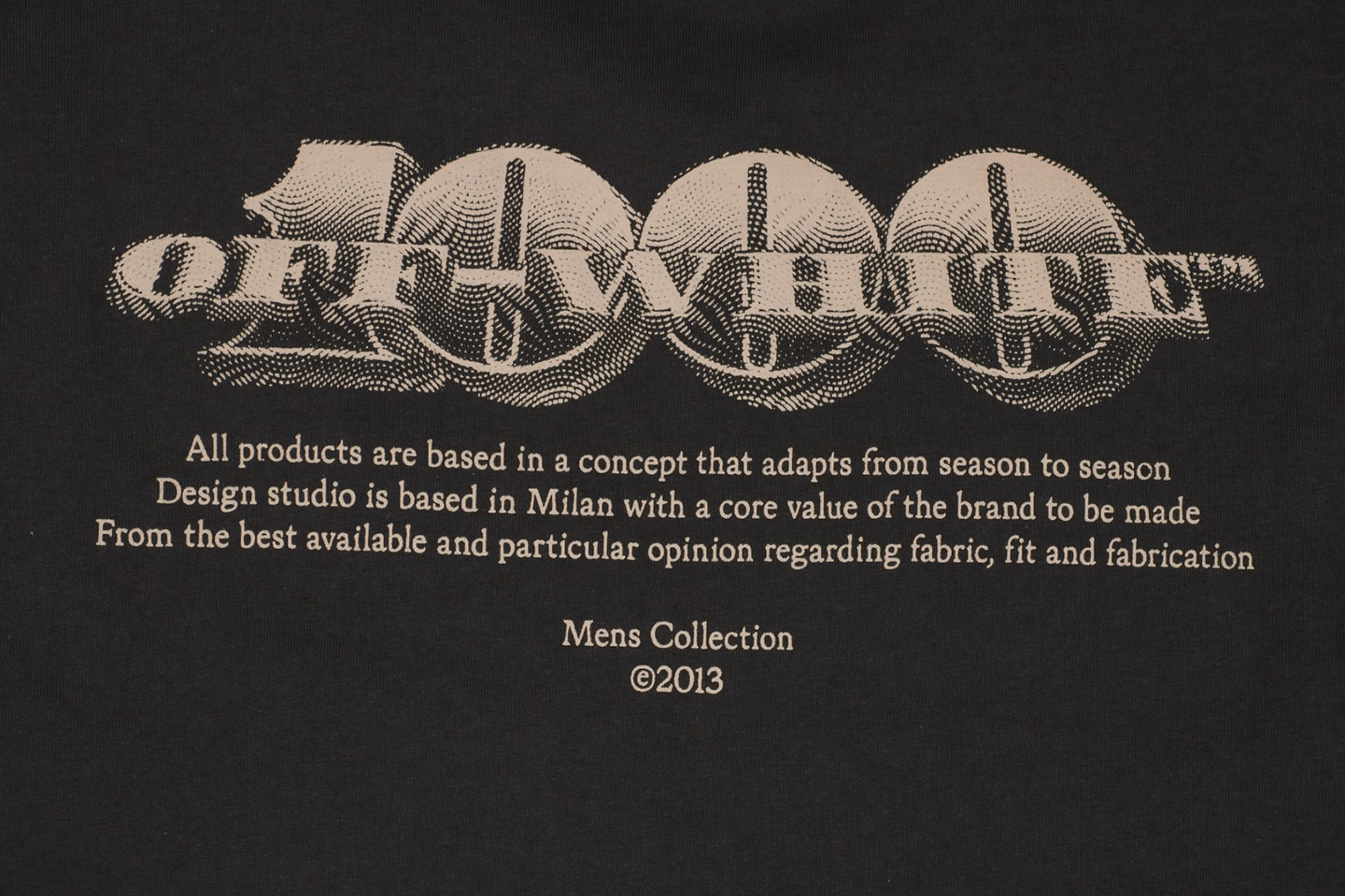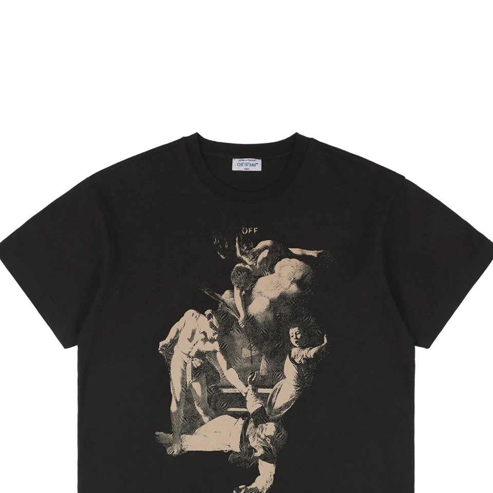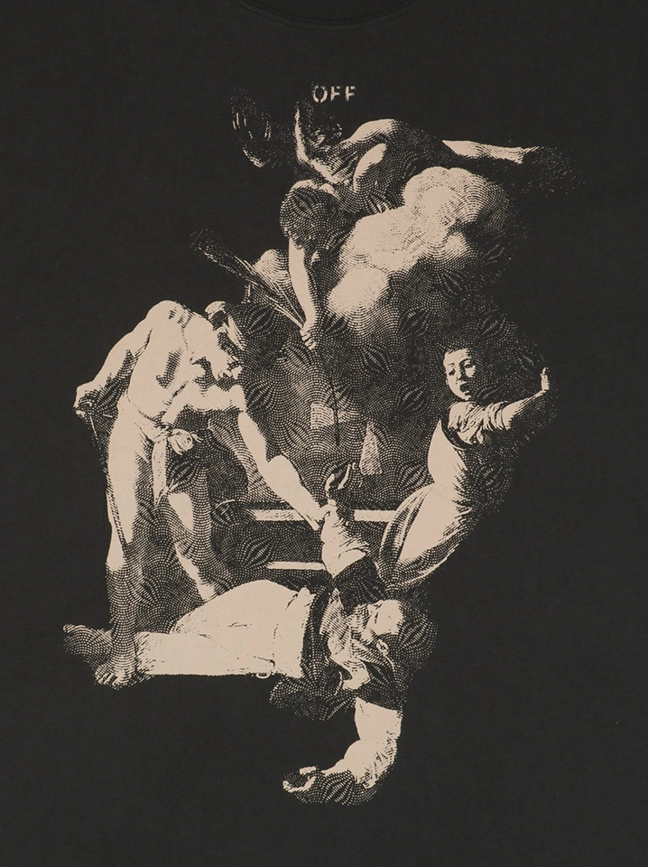 The OFF-WHITE Caravaggio Saint Matthew Martyr Graphic T-shirt features a dramatic reinterpretation of Caravaggio’s renowned “The Martyrdom of Saint Matthew” on the front, presented in a detailed monochrome print. The back is subtly adorned with the Off-White logo and collection text, adding a signature branding element. Crafted from premium cotton, this tee offers a soft touch and a structured fit, ideal for streetwear enthusiasts who appreciate art-driven fashion statements.