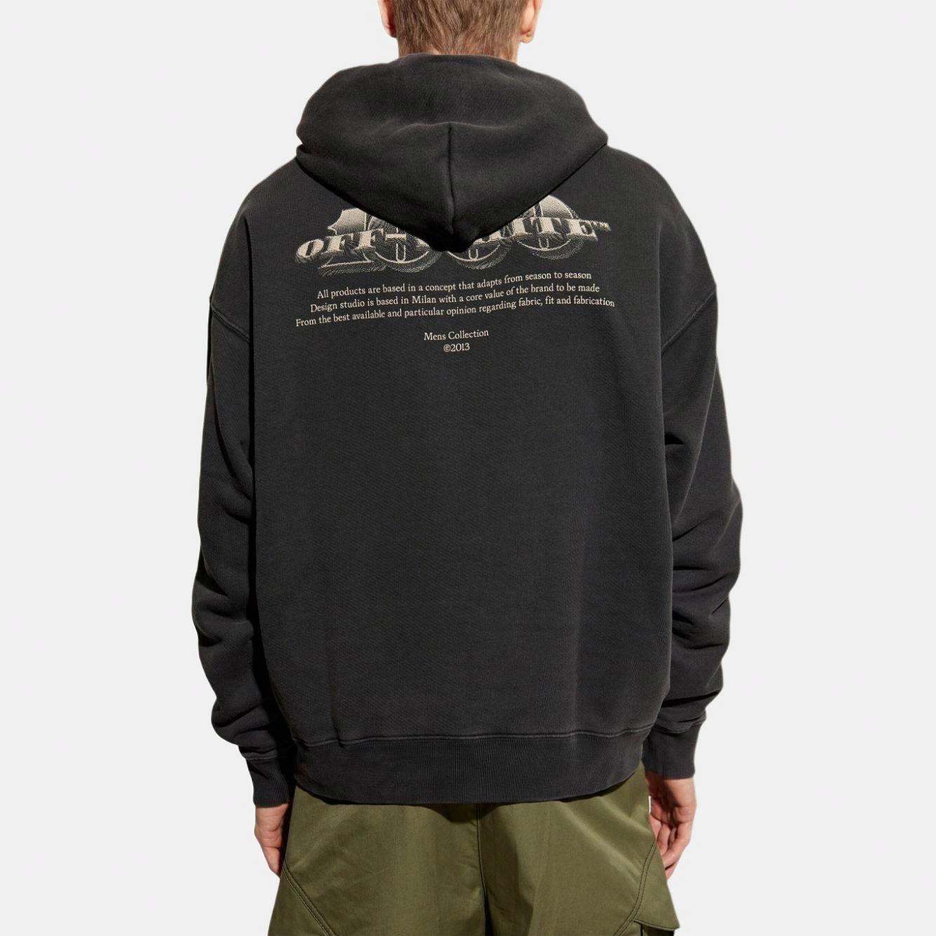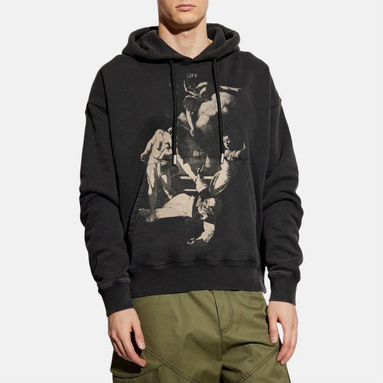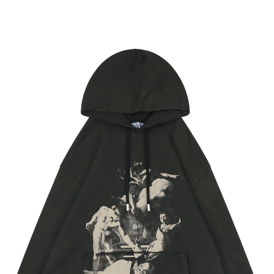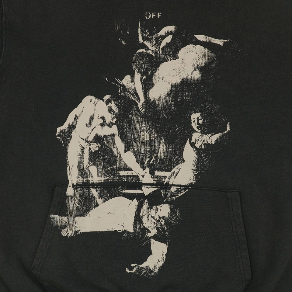 The Off-White Caravaggio “The Martyrdom of Saint Matthew” Print Hoodie references a classic Baroque masterpiece, transforming it into a bold streetwear statement. The front showcases a large, vintage-style monochrome artwork inspired by the dramatic composition of Caravaggio’s painting, adding depth and artistic tension to the piece. The back features Off-White’s signature typography and collection details, reinforcing the brand’s conceptual identity. Crafted from soft, heavyweight cotton with a washed finish, the hoodie offers both comfort and a worn-in aesthetic. Its oversized silhouette, kangaroo pocket, and adjustable drawstring hood make it an ideal blend of art, culture, and modern street style.
