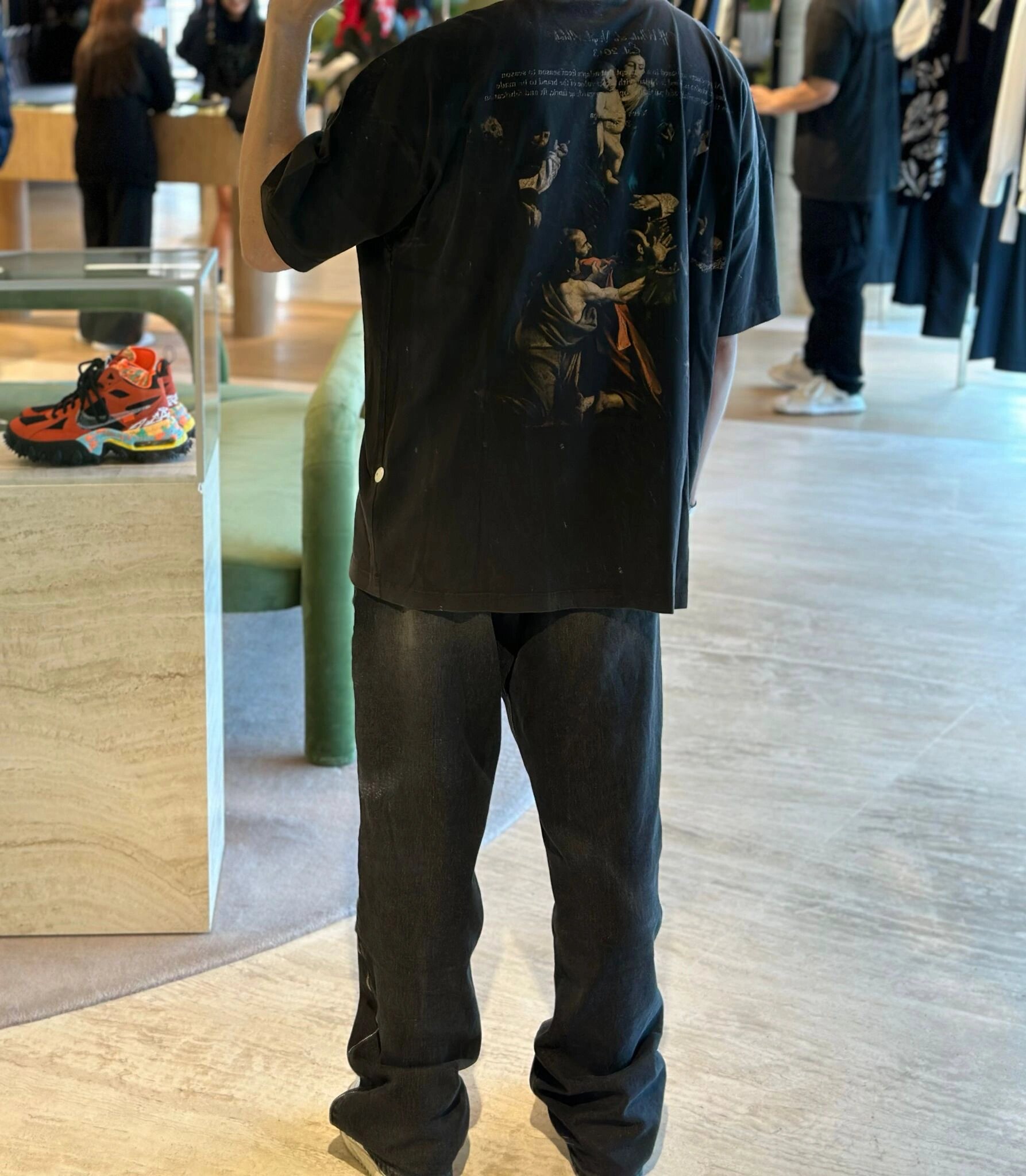 The OFF WHITE Back-Print Madonna & Hymn Washed Graphic T-Shirt presents a large back graphic depicting the Madonna alongside hymn-style script, rendered in a faded oil painting aesthetic. The image conveys themes of grace, prayer, and sanctity, contrasted by the streetwear silhouette and OFF WHITE’s rebellious DNA. The piece is treated with a washed finish, adding depth and vintage character to the spiritual visual. Constructed from soft high-quality cotton with a relaxed fit, it’s a conceptual blend of devotion and design.