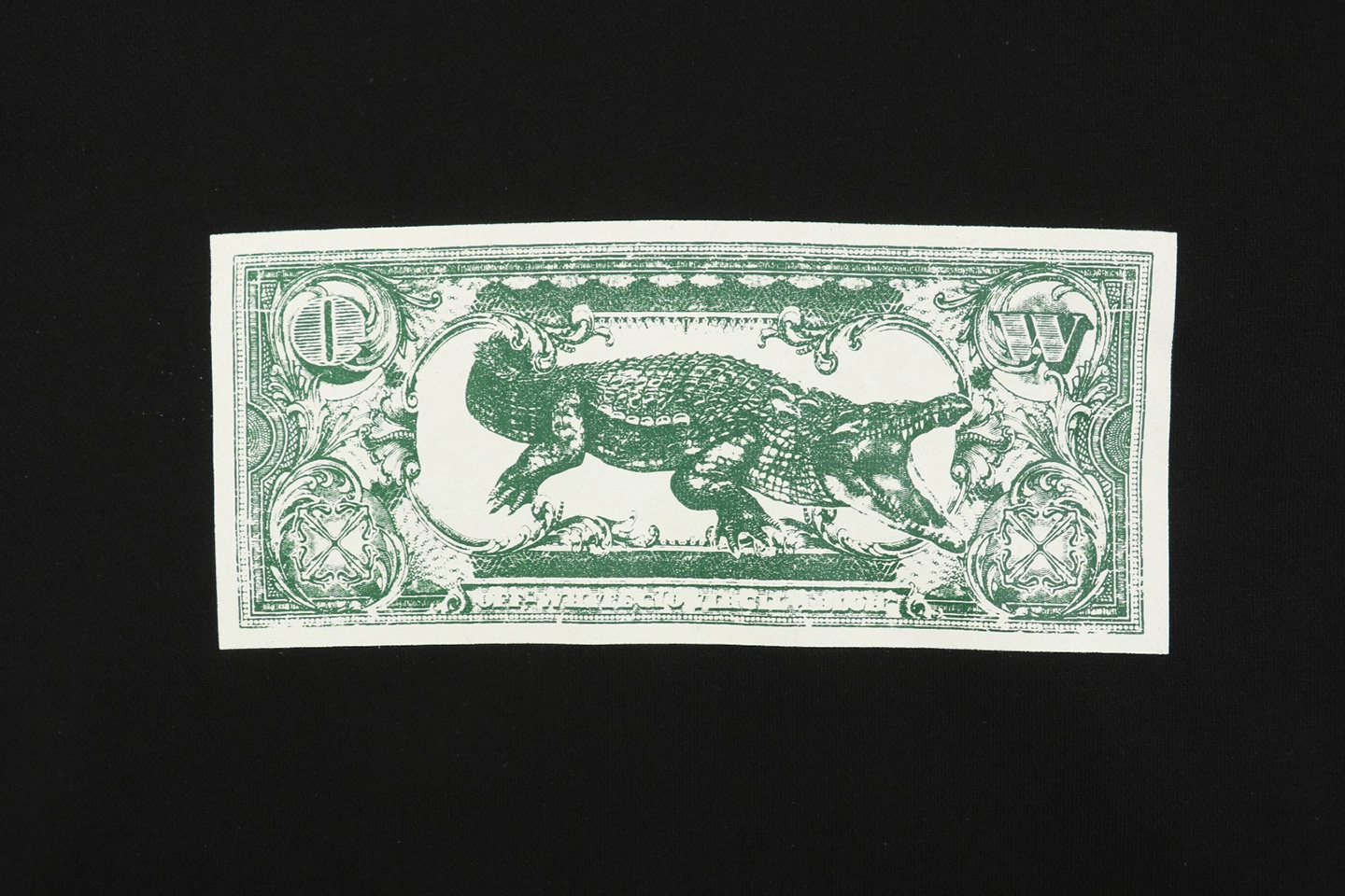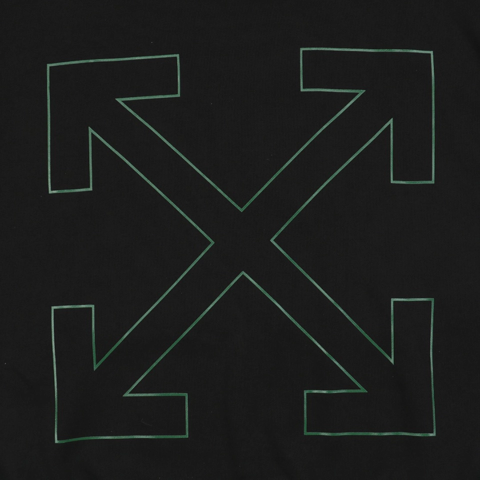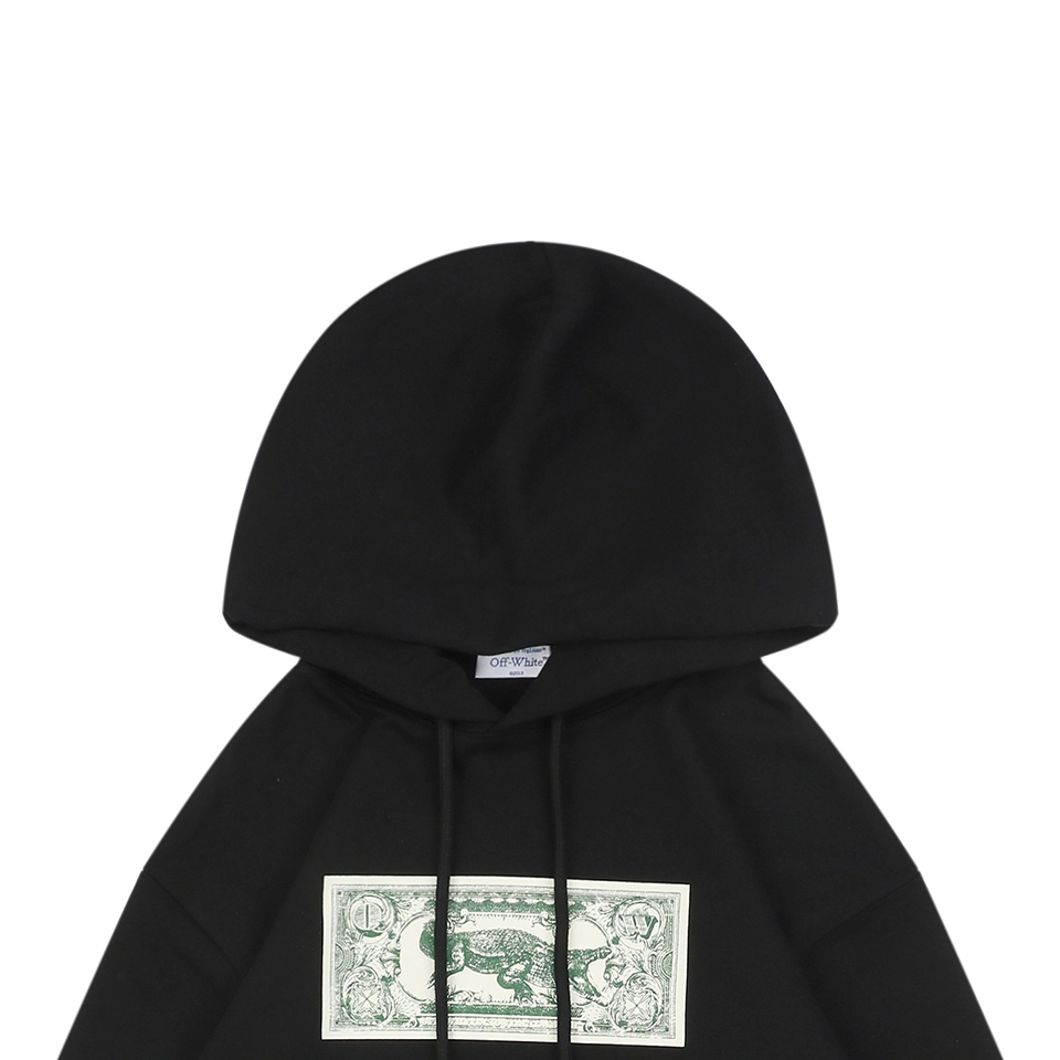 This Off-White Crocodile Dollar Graphic Hoodie stands out with a unique dollar bill-inspired chest graphic featuring a crocodile motif, juxtaposed with the iconic green outlined Arrows logo at the back. Crafted from soft heavyweight cotton, this hoodie combines streetwear sensibility with signature Virgil Abloh design cues. The ribbed hem and cuffs ensure a structured silhouette, while the roomy kangaroo pocket and drawstring hood provide comfort and functionality.